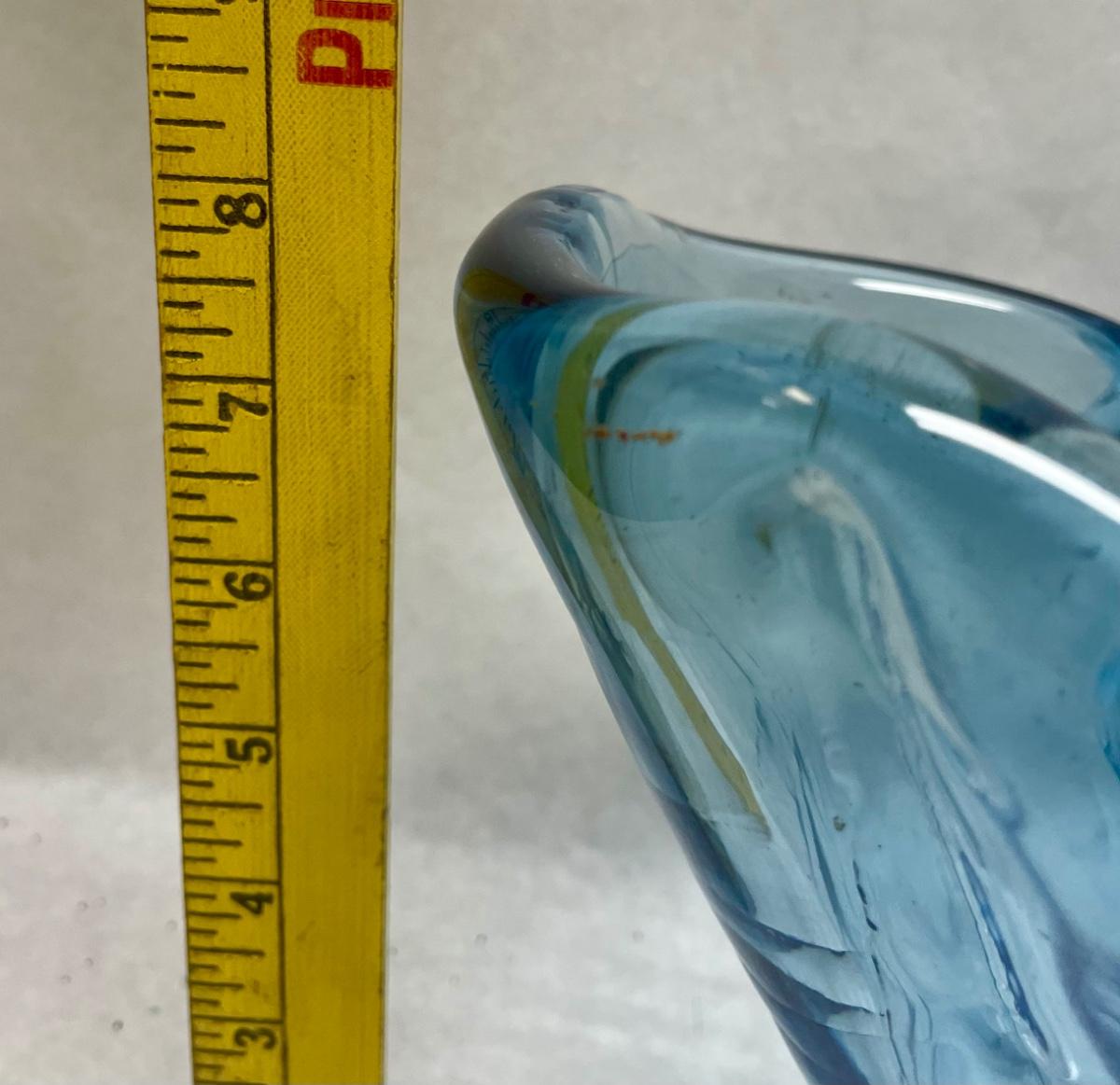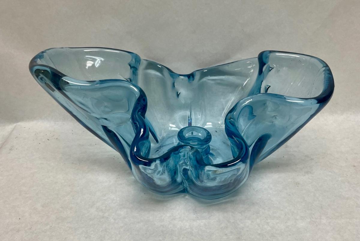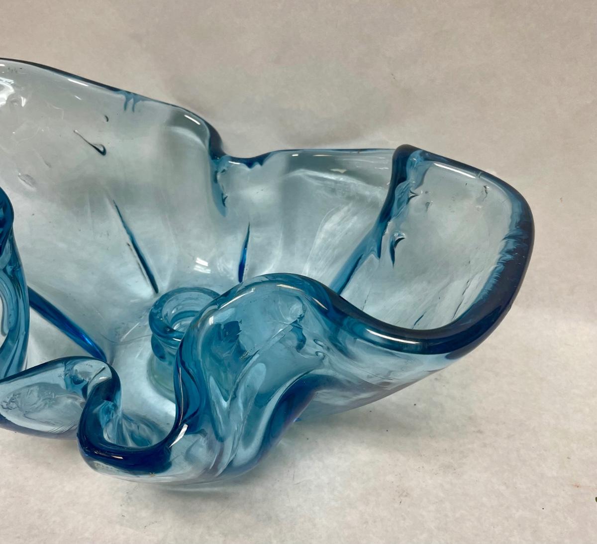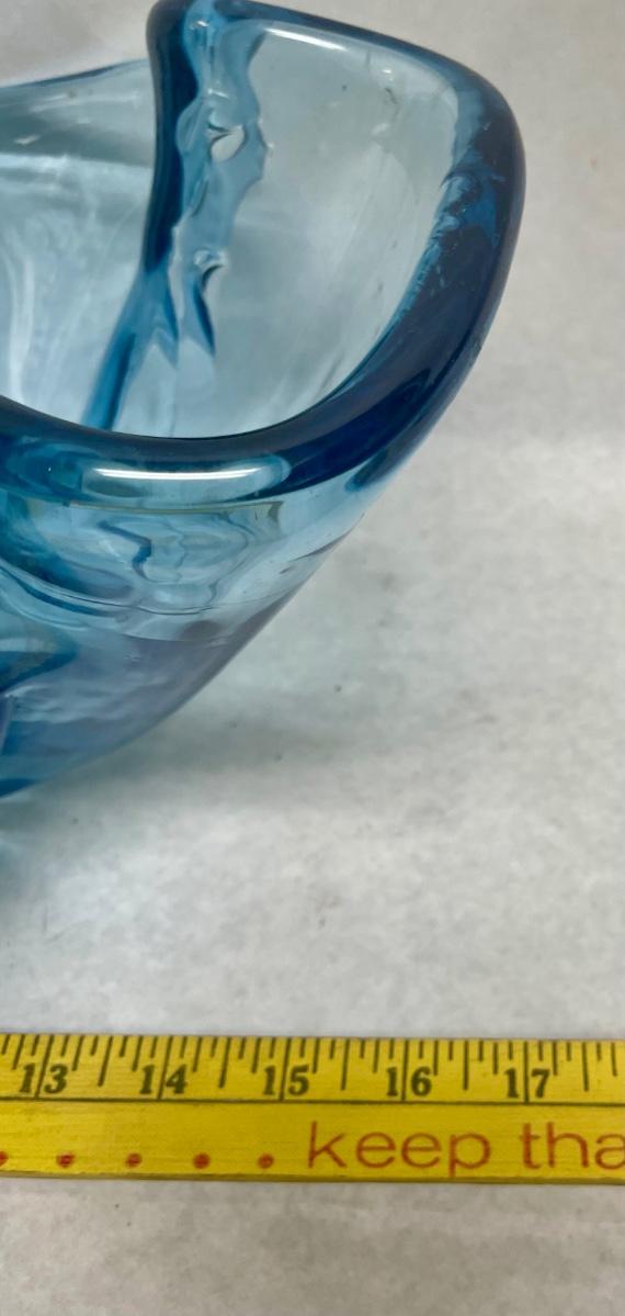 Made from a 5-gallon glass water bottle. Blue colored glass with abstract scalloped edges. Very heavy. Approx. 18" across the widest part.