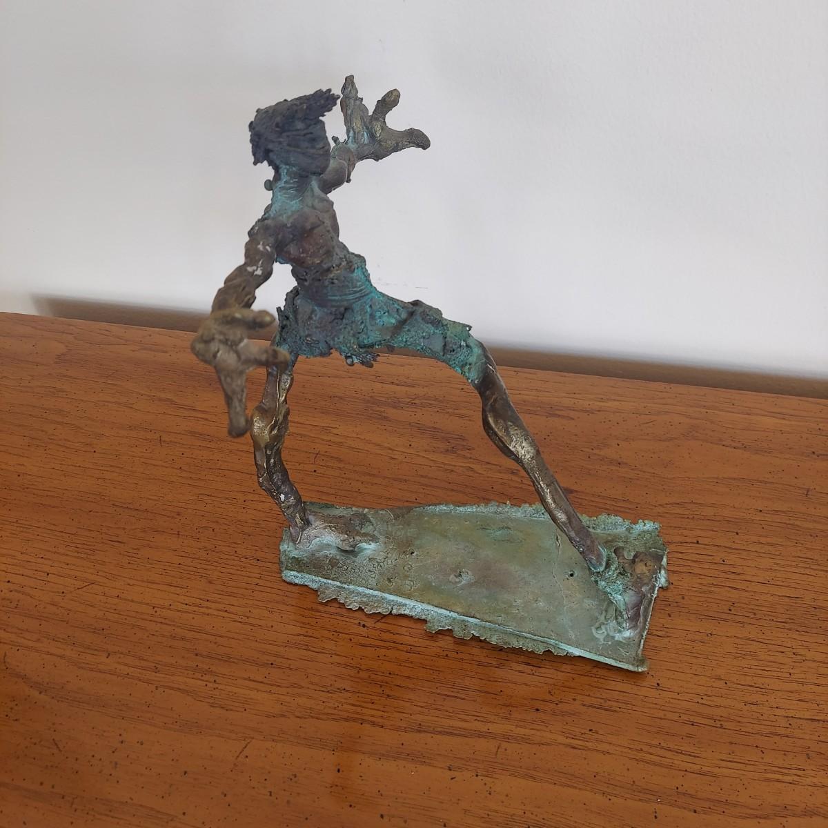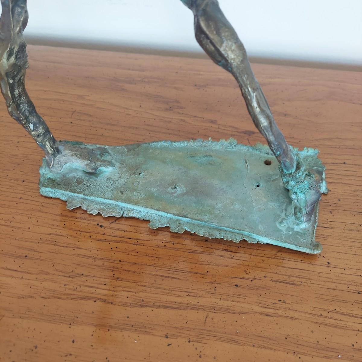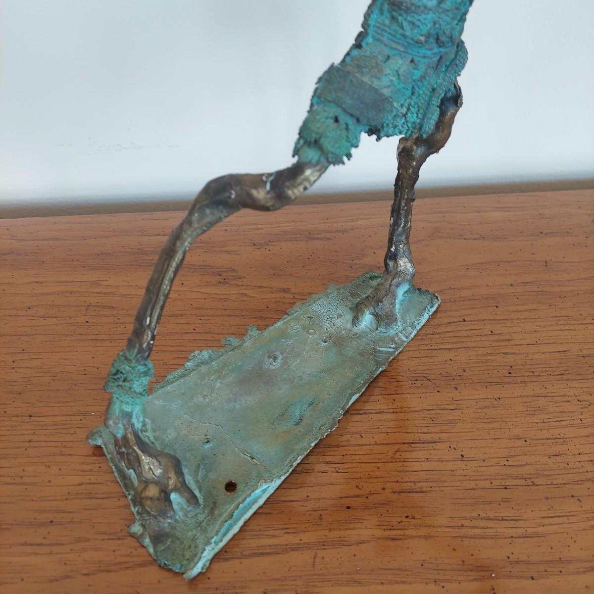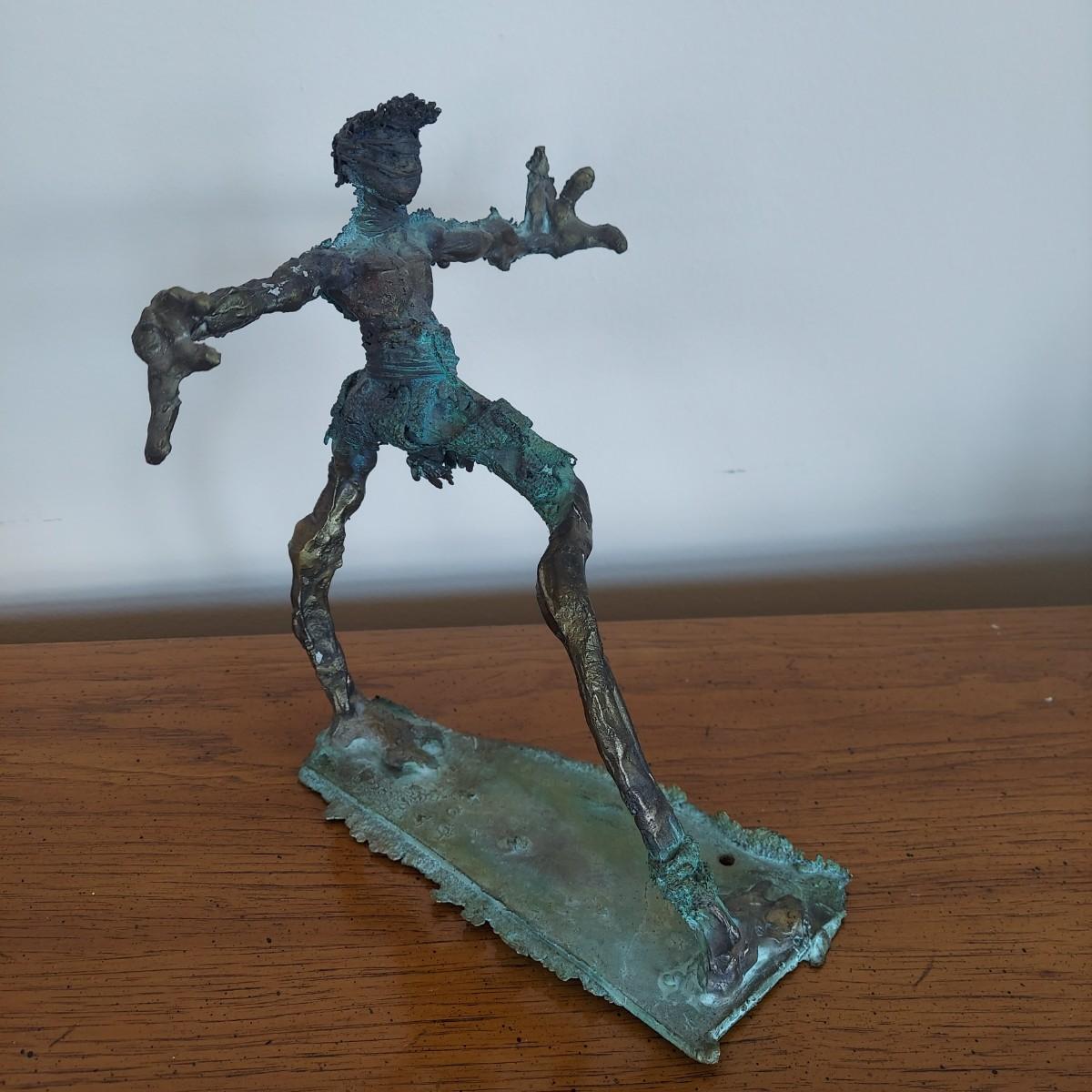 Heavy metal sculpture of a figure in abstract form. Piece measures approximately 8” x 8” x 9.5"H. Some natural patina. See photos for details. Shipping available