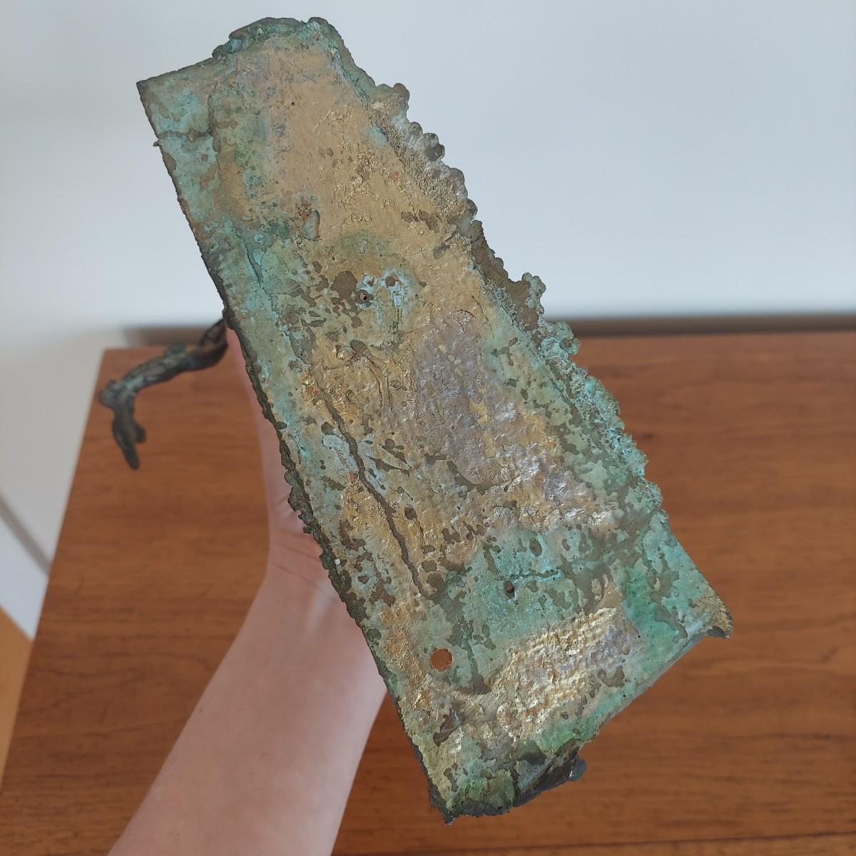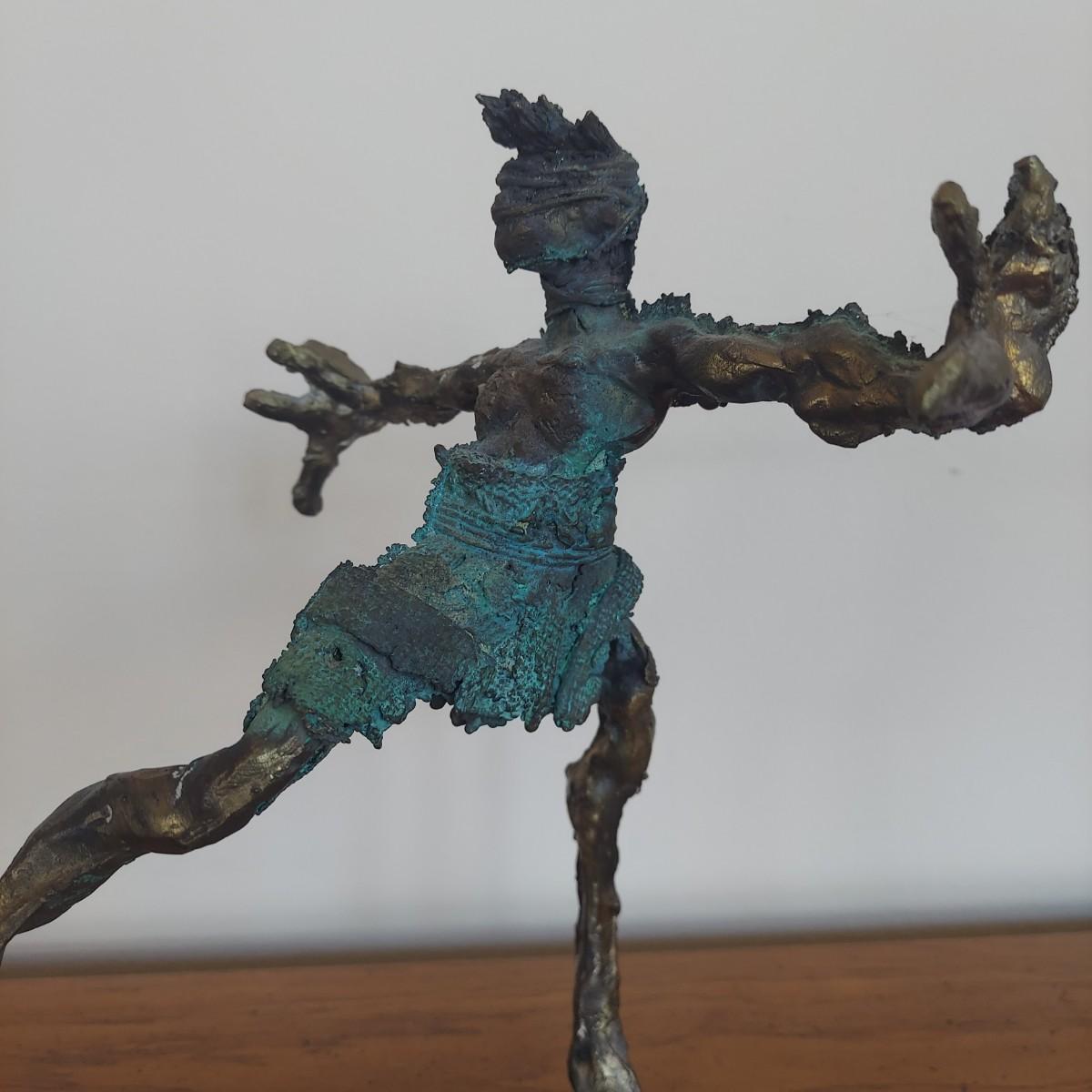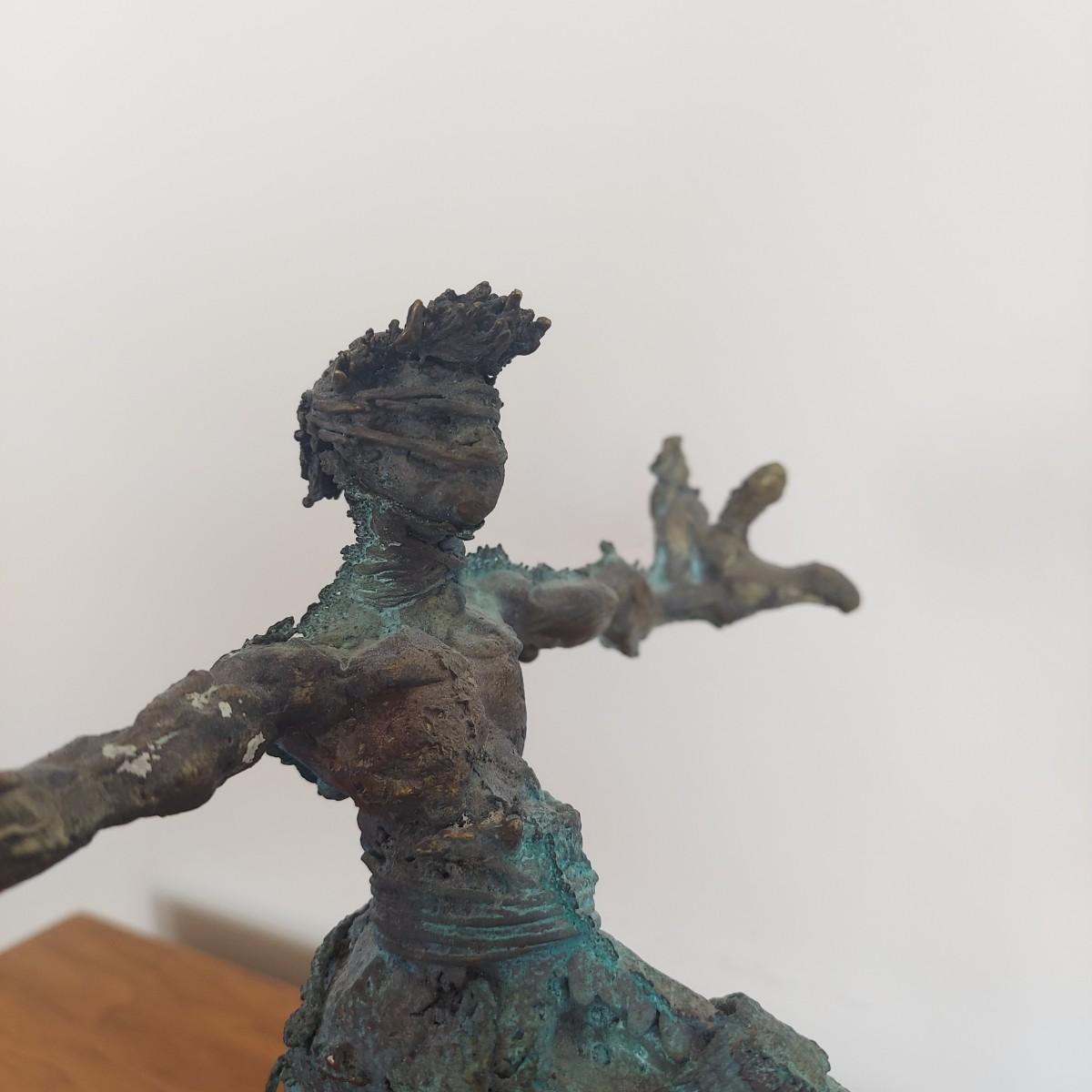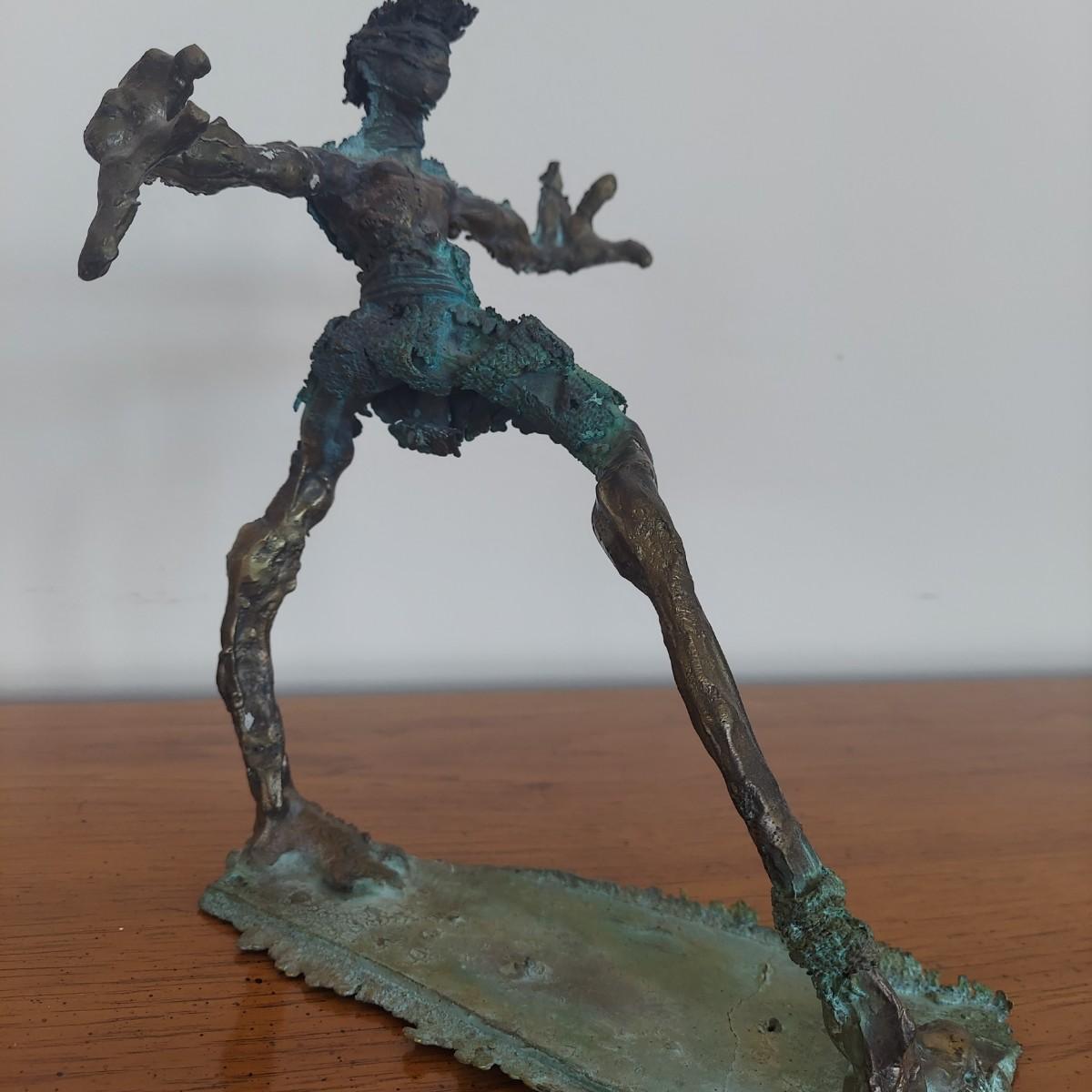 Heavy metal sculpture of a figure in abstract form. Piece measures approximately 8” x 8” x 9.5"H. Some natural patina. See photos for details. Shipping available