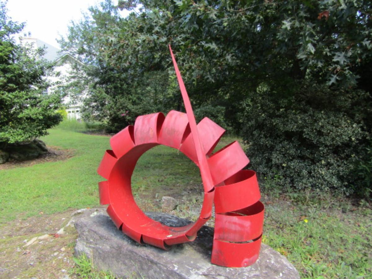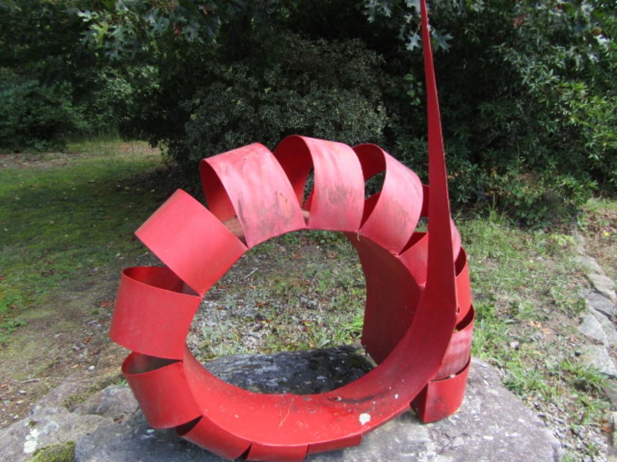 Abstract Metal Yard Art- Large. Item is fastened to stone. Buyer must bring tools to remove (screw drivers).