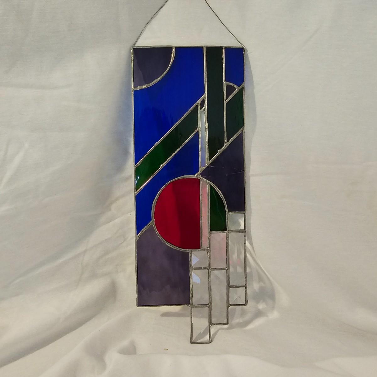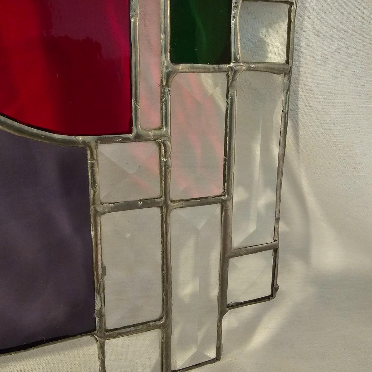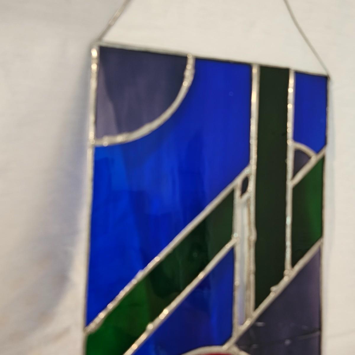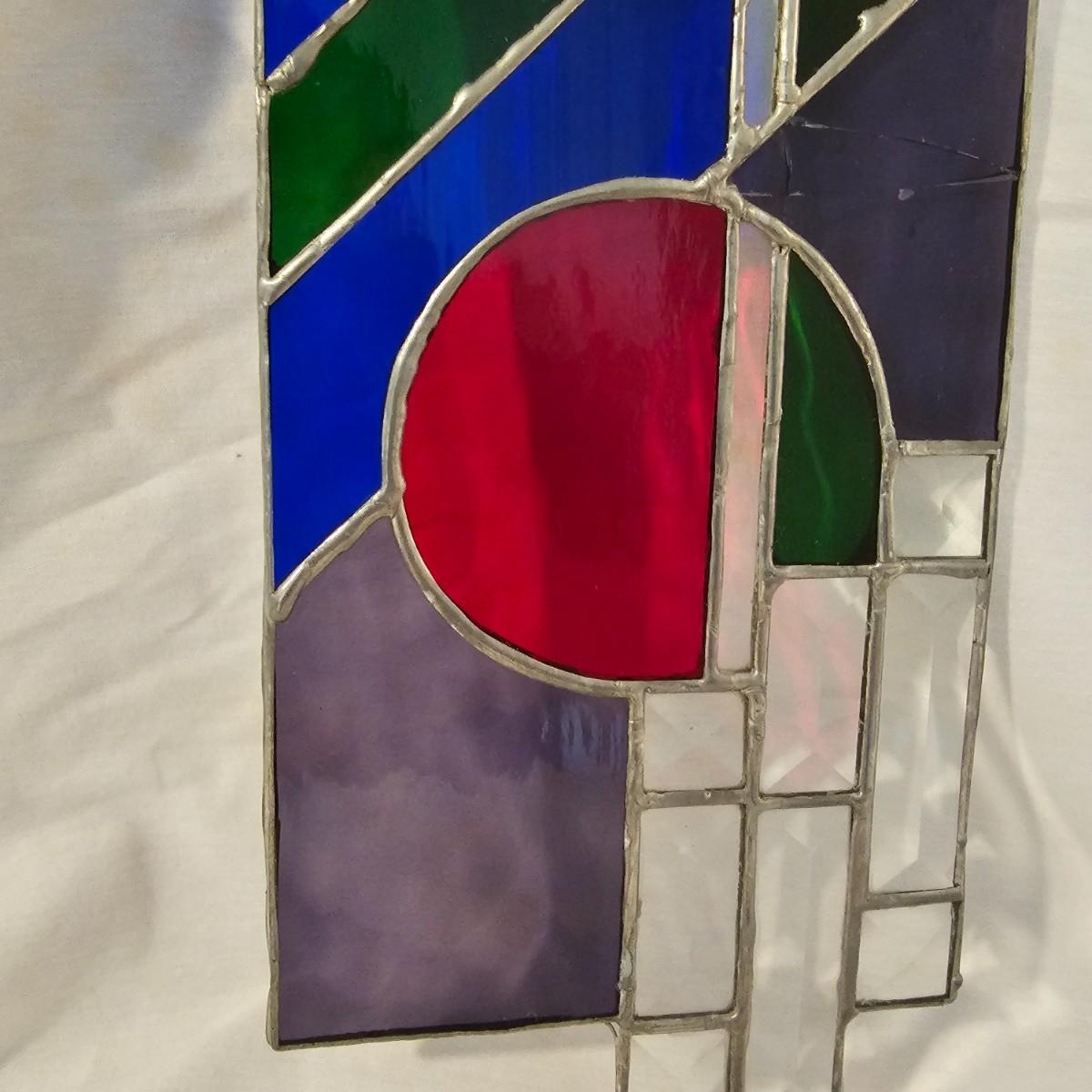A small hanging piece of stained glass, clear bevels, stripes and more. Piece measures 6" x 16"H, has hanging wire at top. One cracked piece, see photos for details. Shipping available.