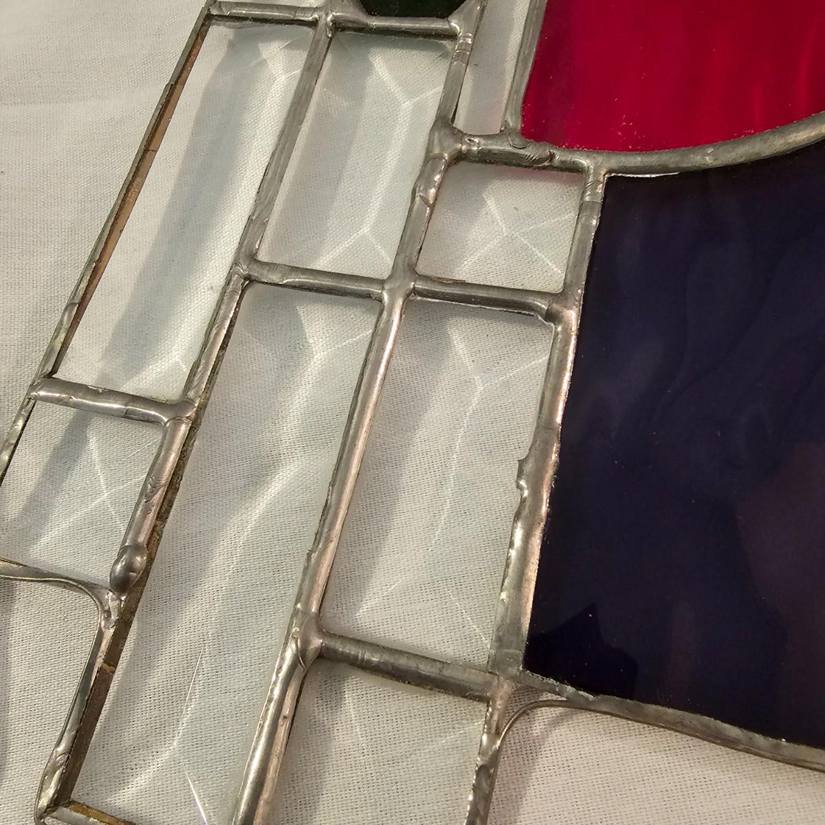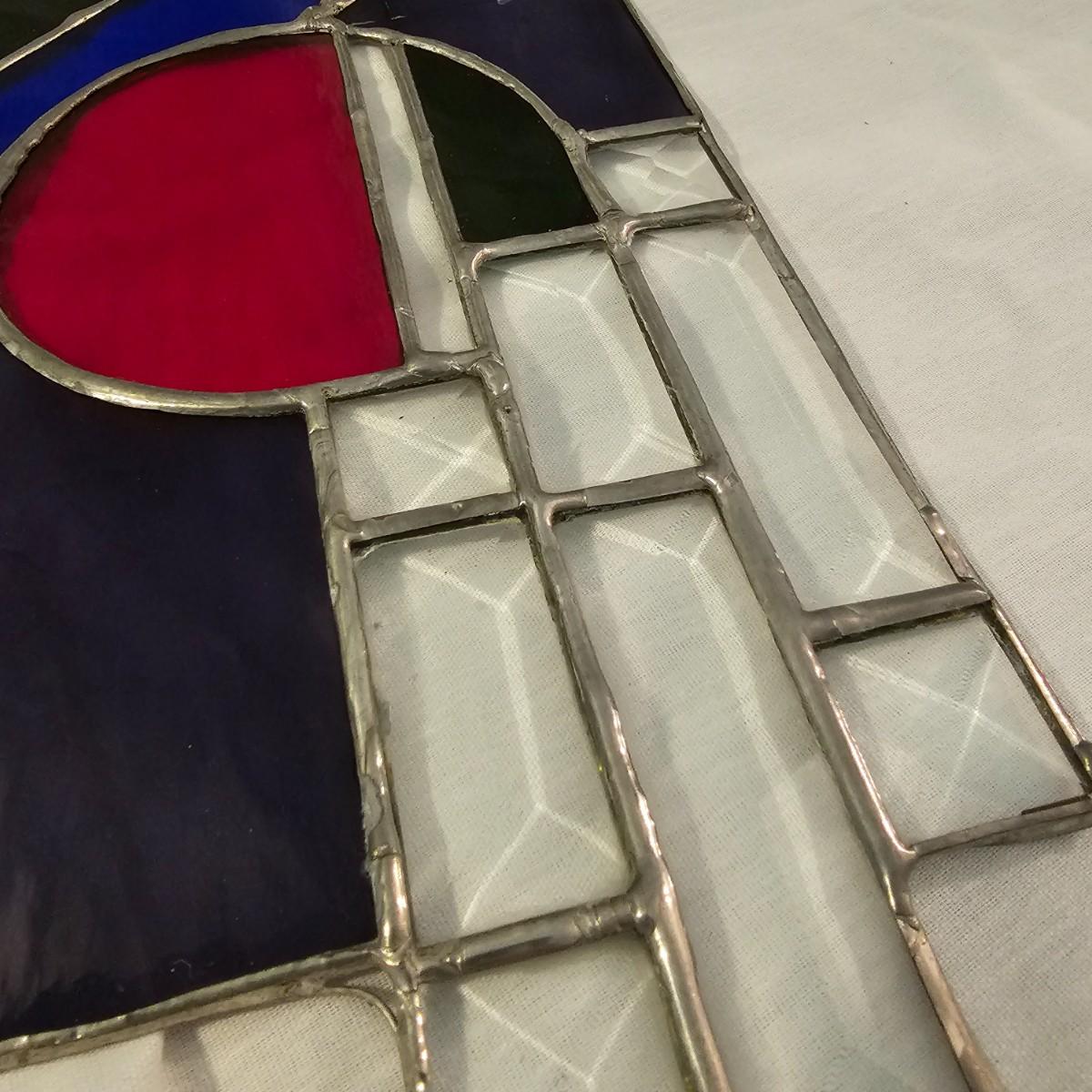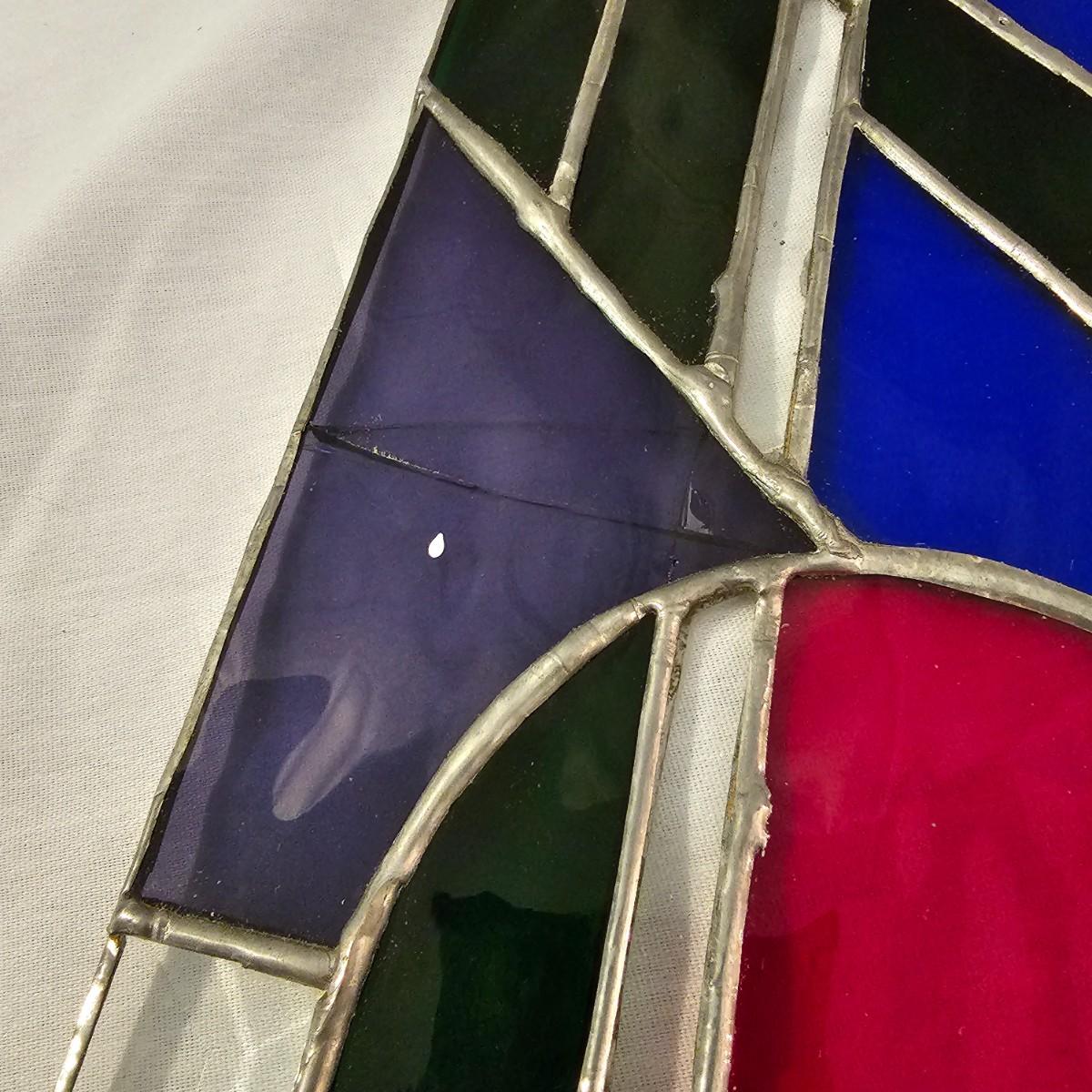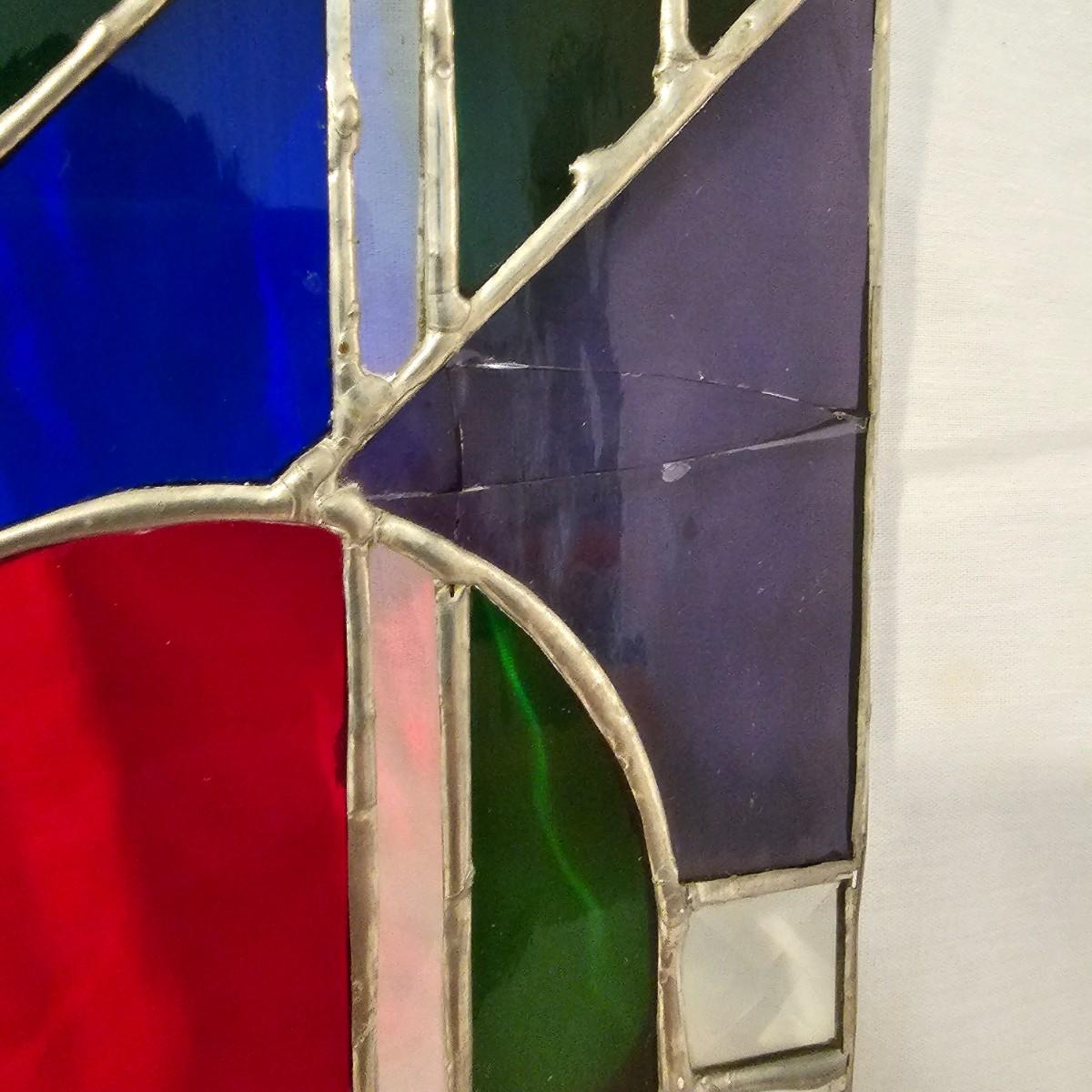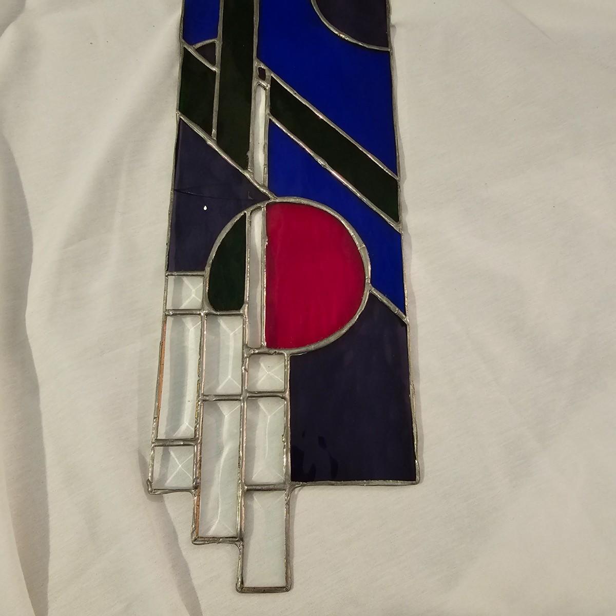 A small hanging piece of stained glass, clear bevels, stripes and more. Piece measures 6" x 16"H, has hanging wire at top. One cracked piece, see photos for details. Shipping available.