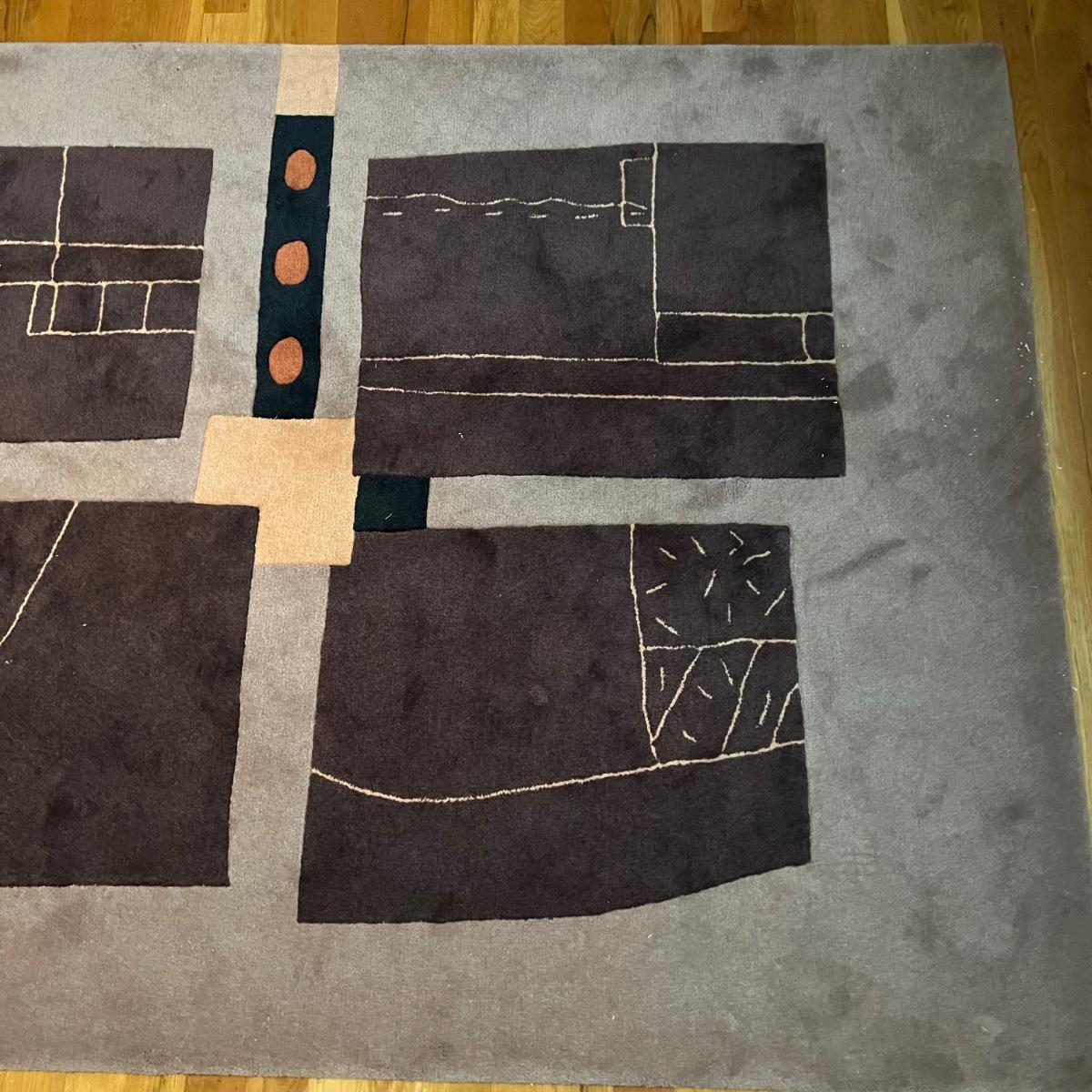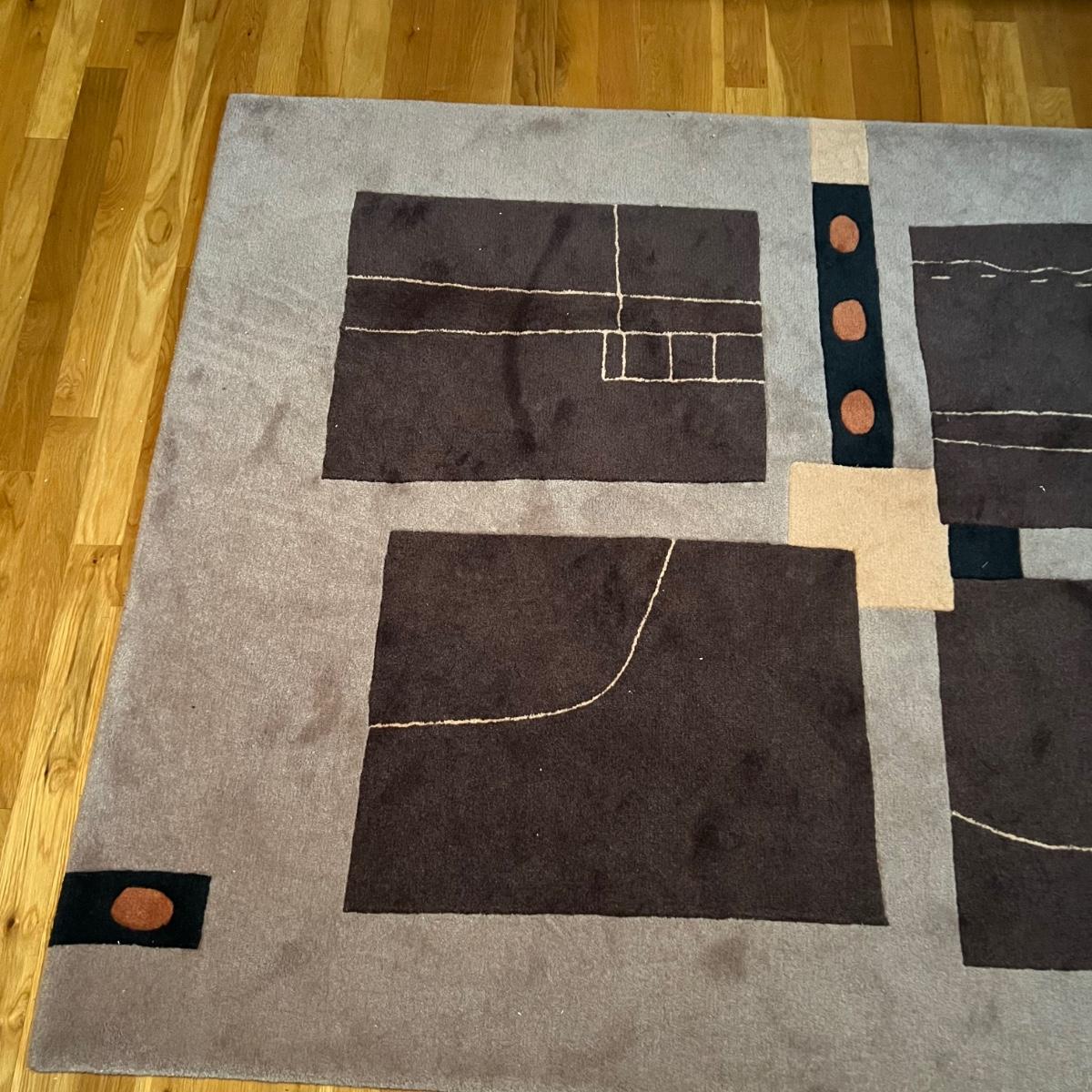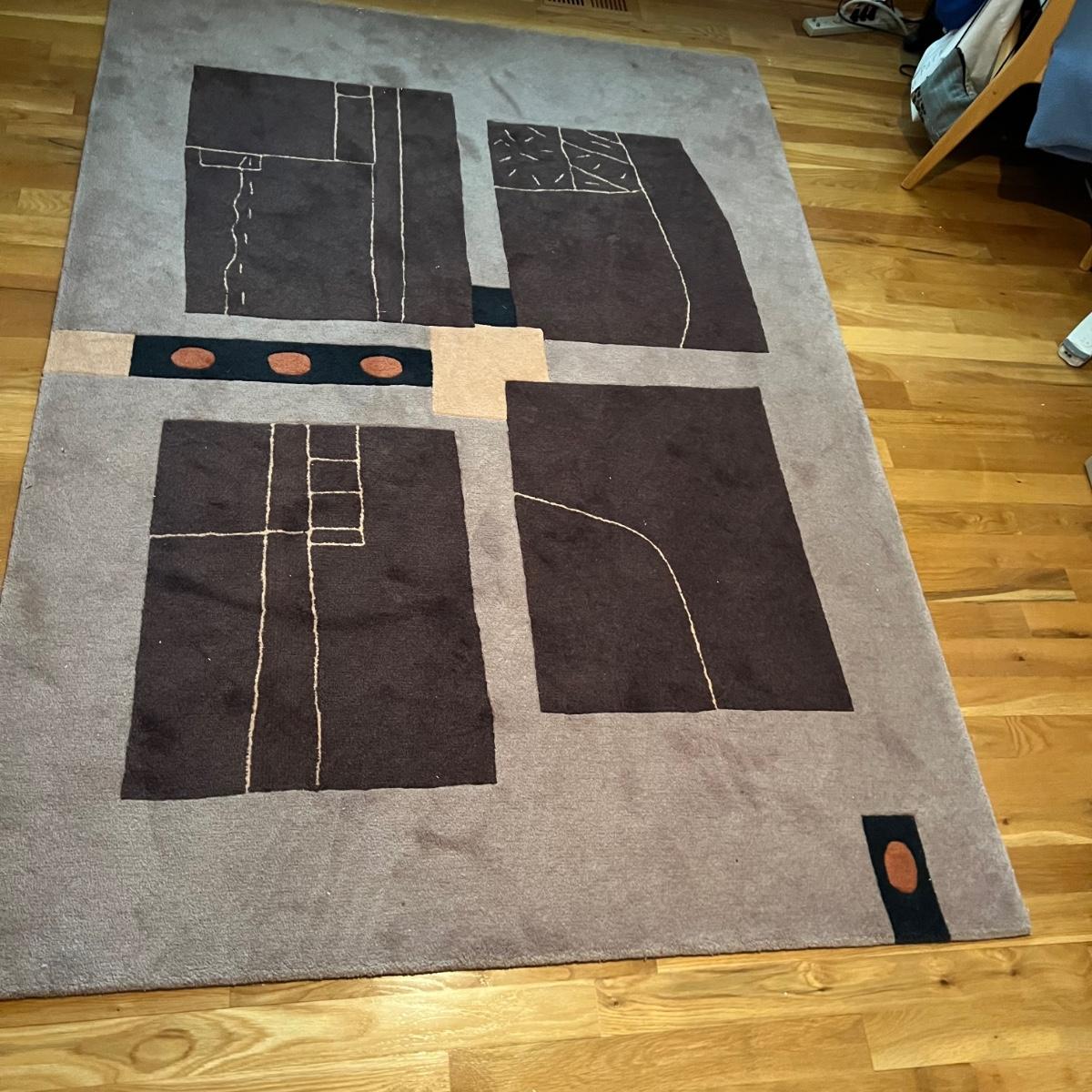 Wool rug with abstract designs in shades of peach, light plum, brown and taupe. The rug measures 5’ 7” x 7’ 10”.