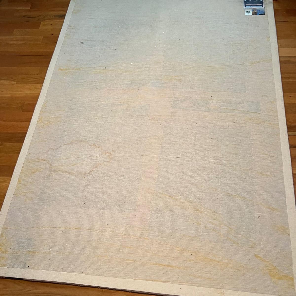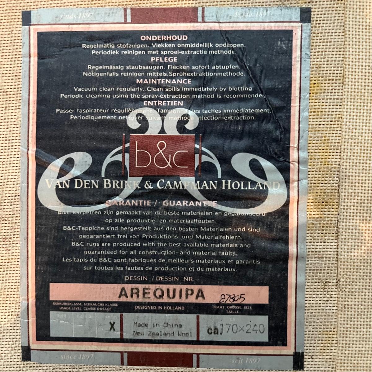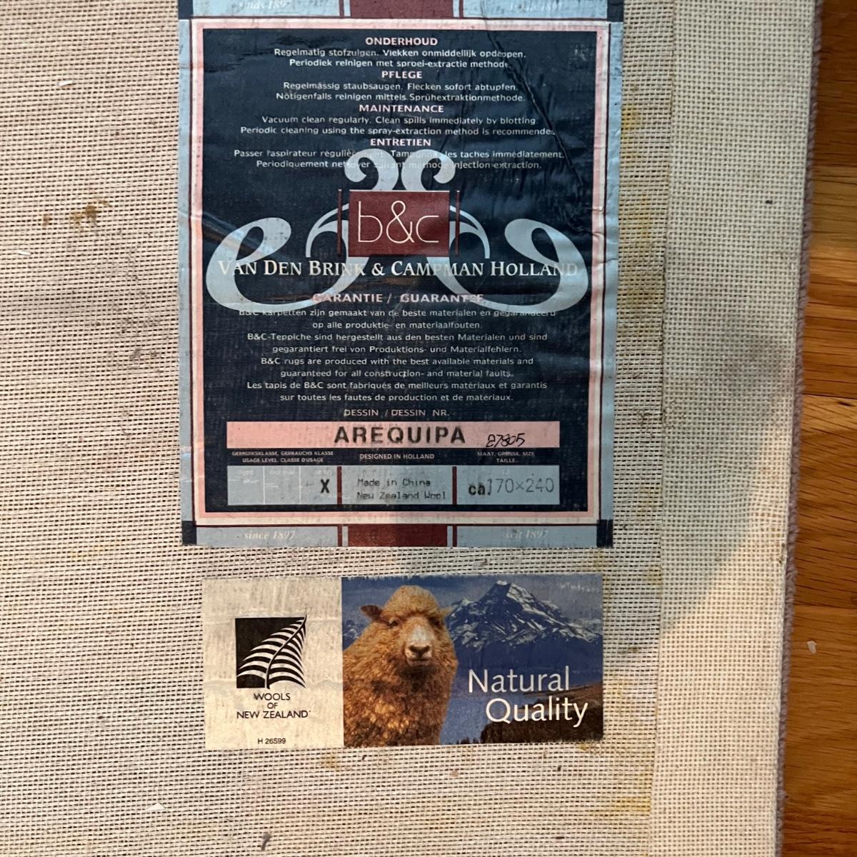 Wool rug with abstract designs in shades of peach, light plum, brown and taupe. The rug measures 5’ 7” x 7’ 10”.