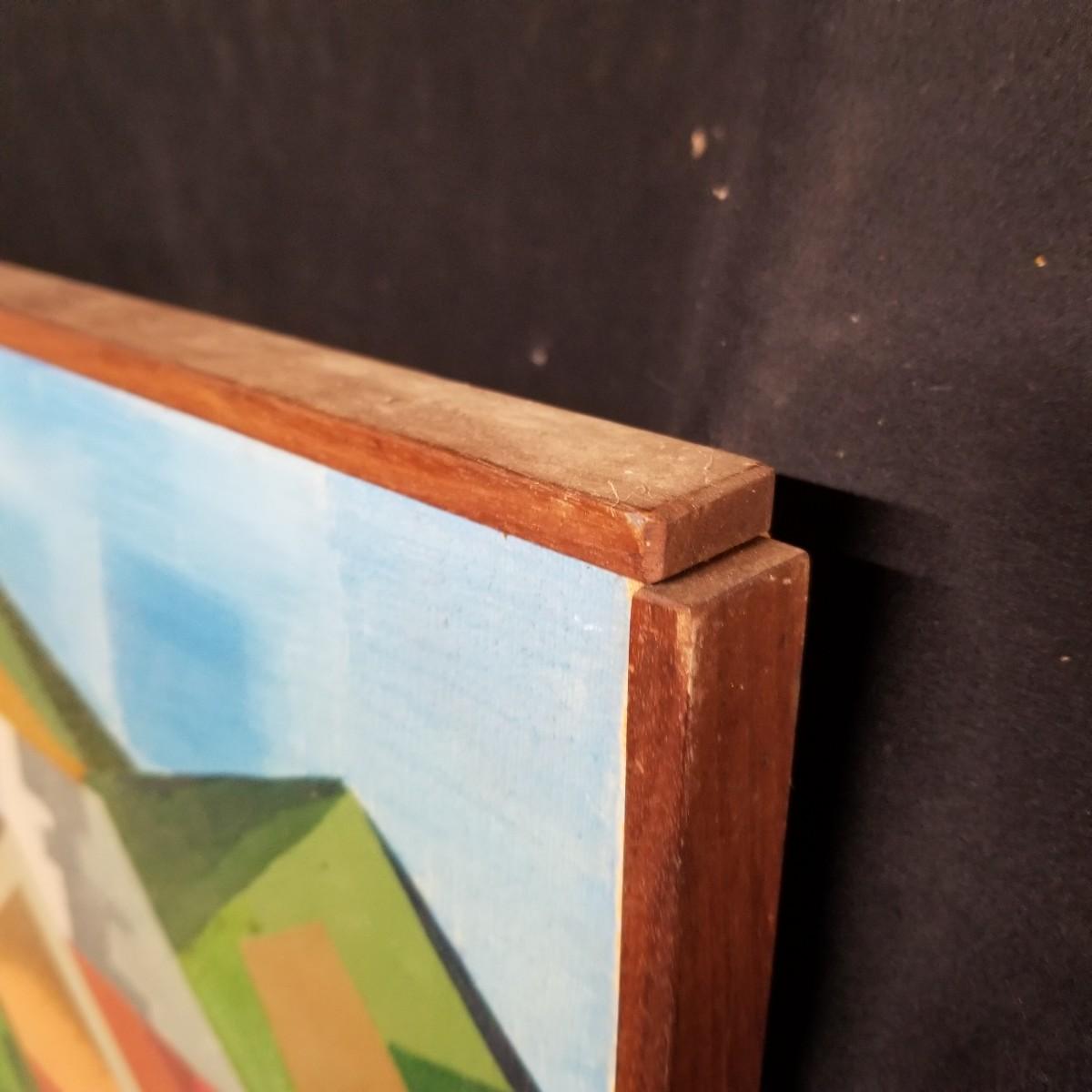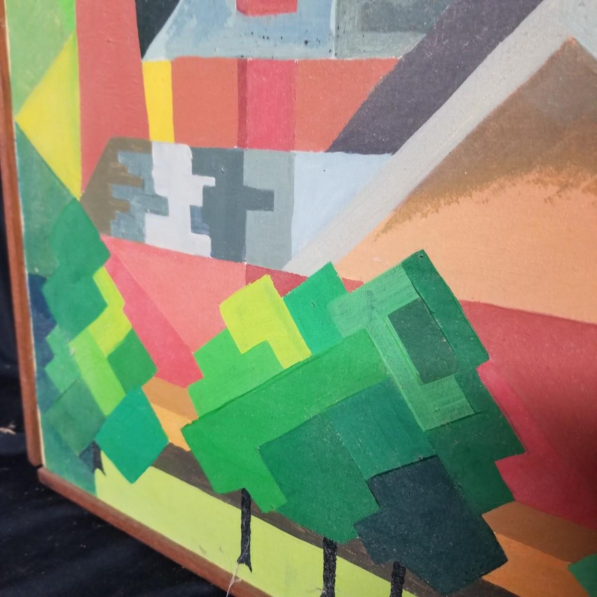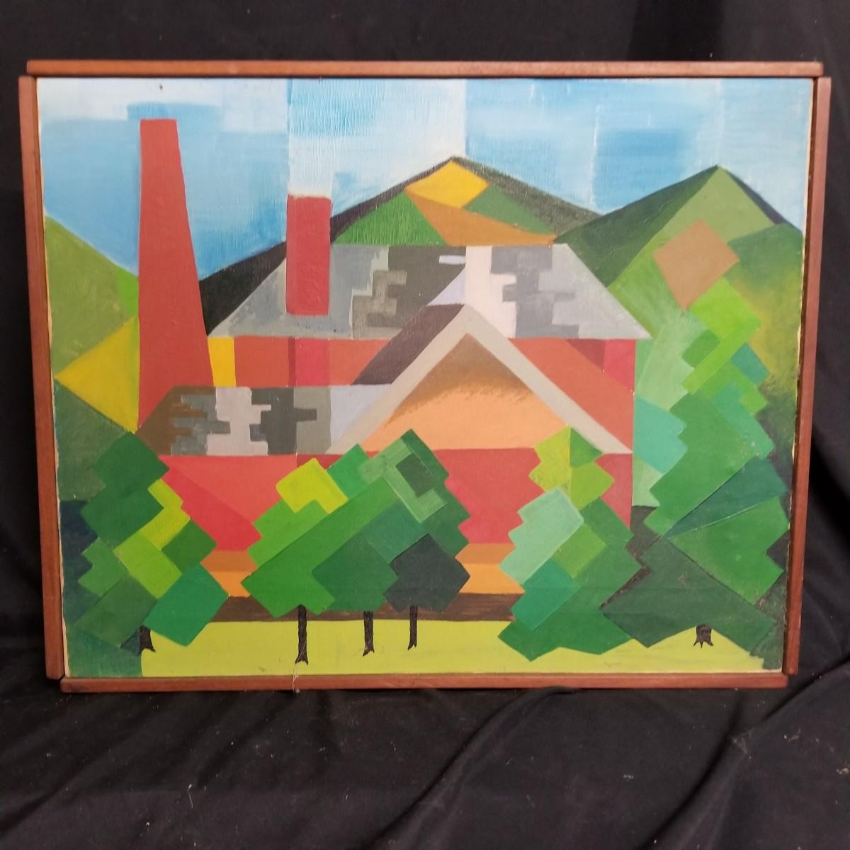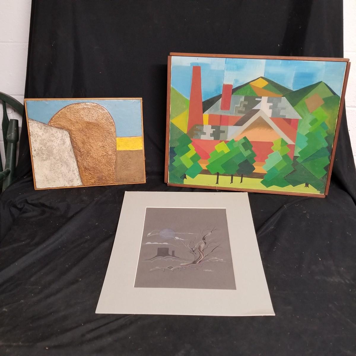 Two abstract oil on canvas paintings and one litho print.  Oils are hand framed with hangers.  Green trees piece is 21" x17", gold dome piece is 14 1/2" x 11 1/2".  Gold dome has texture finish.  Litho print is matted only, is 16" x18", and is signed.  See photos for detail.  Shipping available. Shipping Art can be costly please call UPS store at 828-252-6930 for quote.