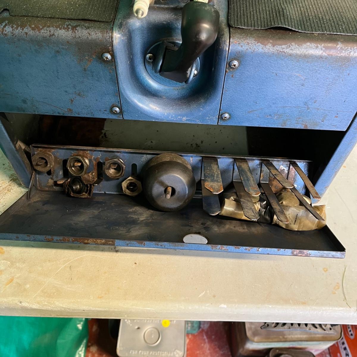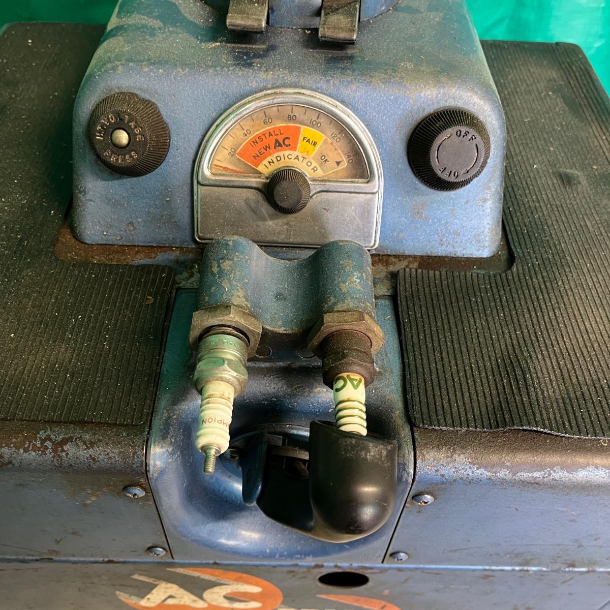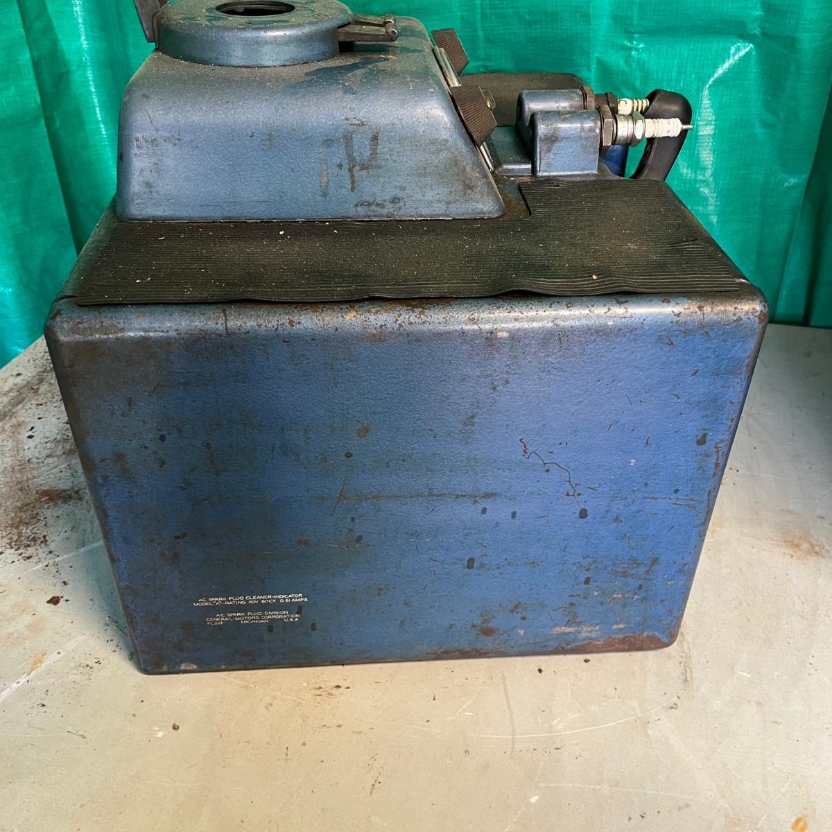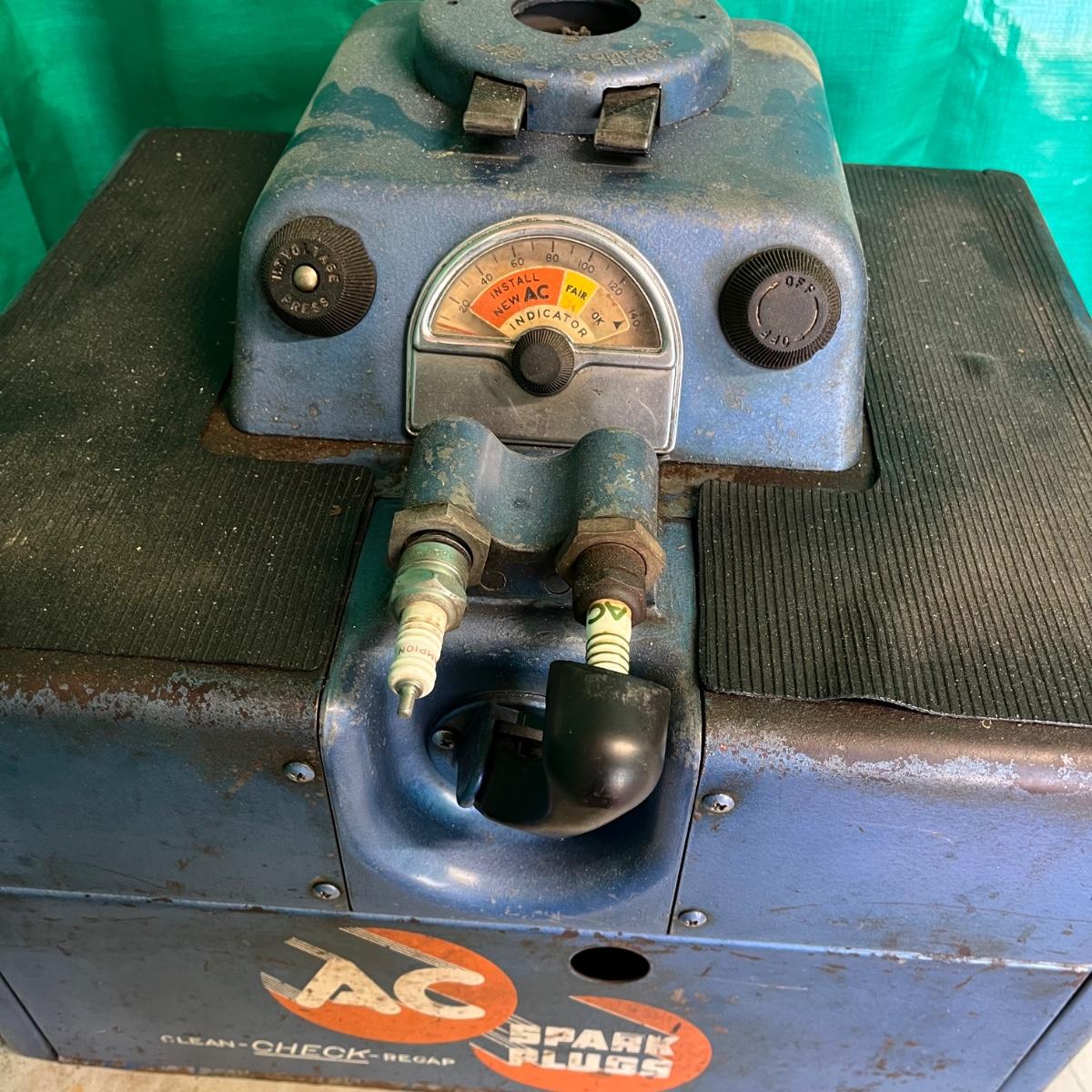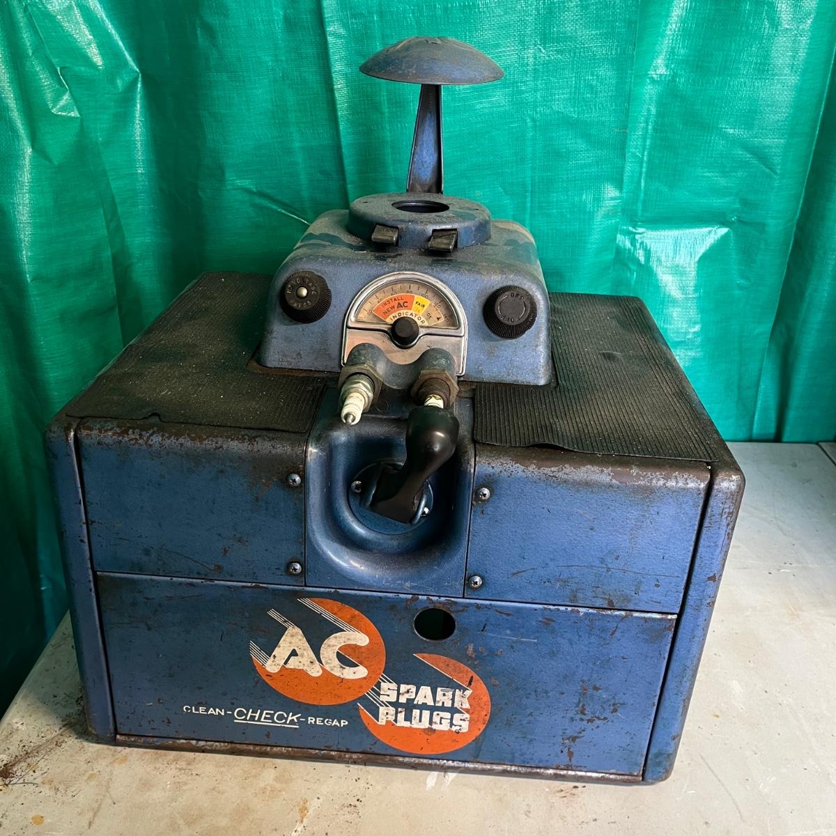 Lot includes a vintage AC Spark plug cleaner and tester with accessories. Machine is missing power wire and was not tested. Machine measures 15” x 18” x 20”.