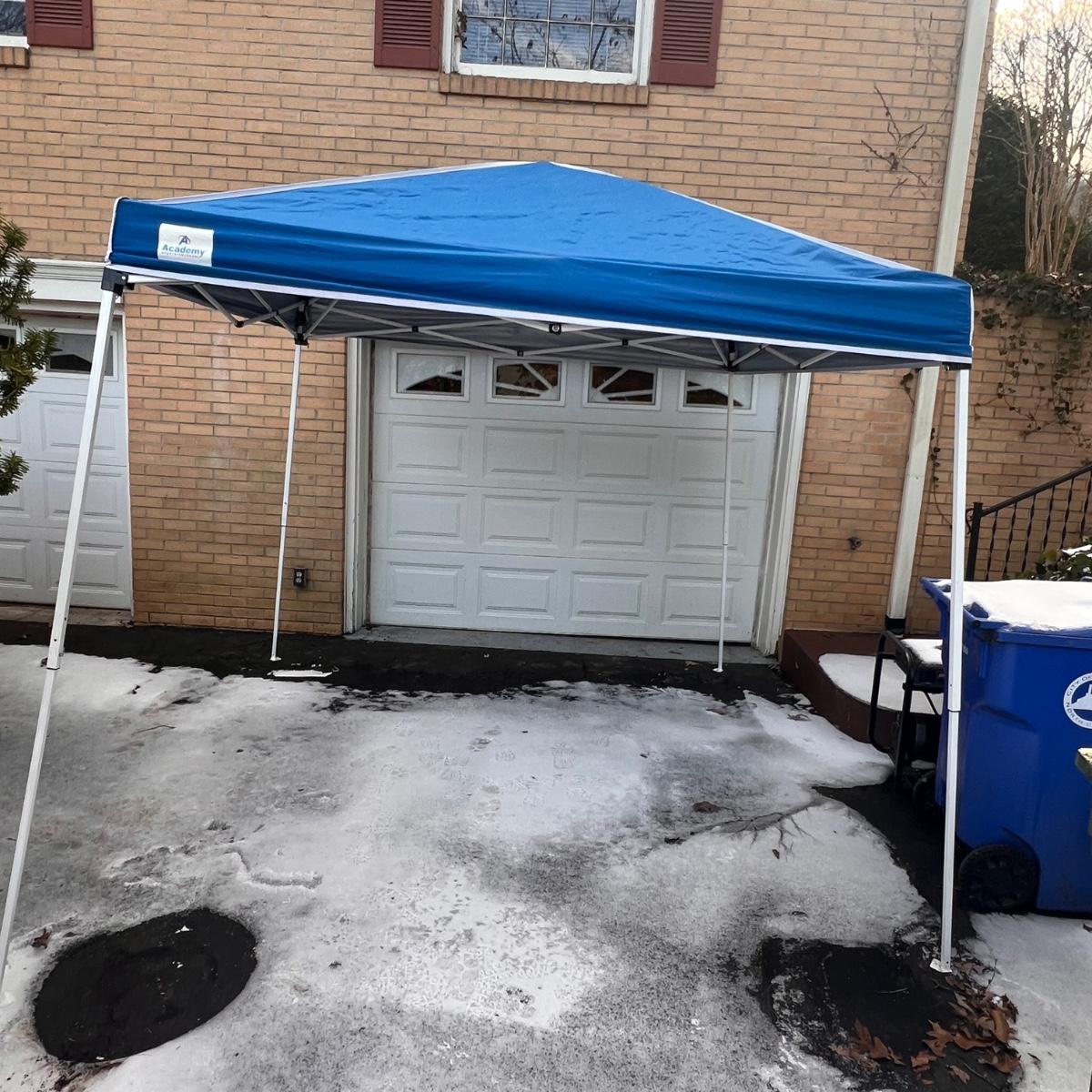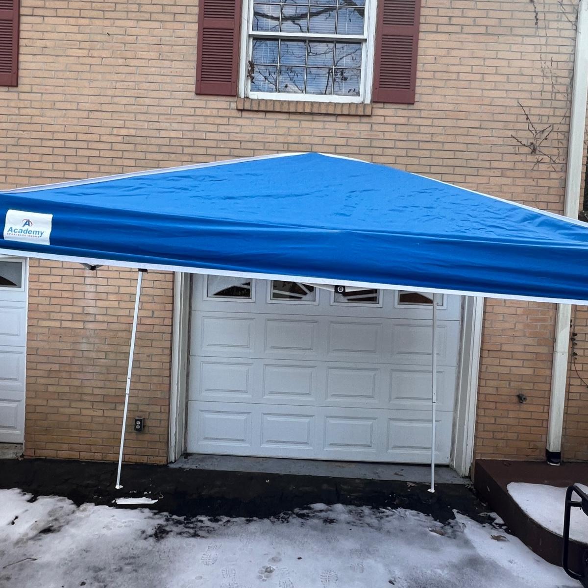 This blue Academy pop up tent measures 10' x 10' x 7'H. Tent does not include storage bag.