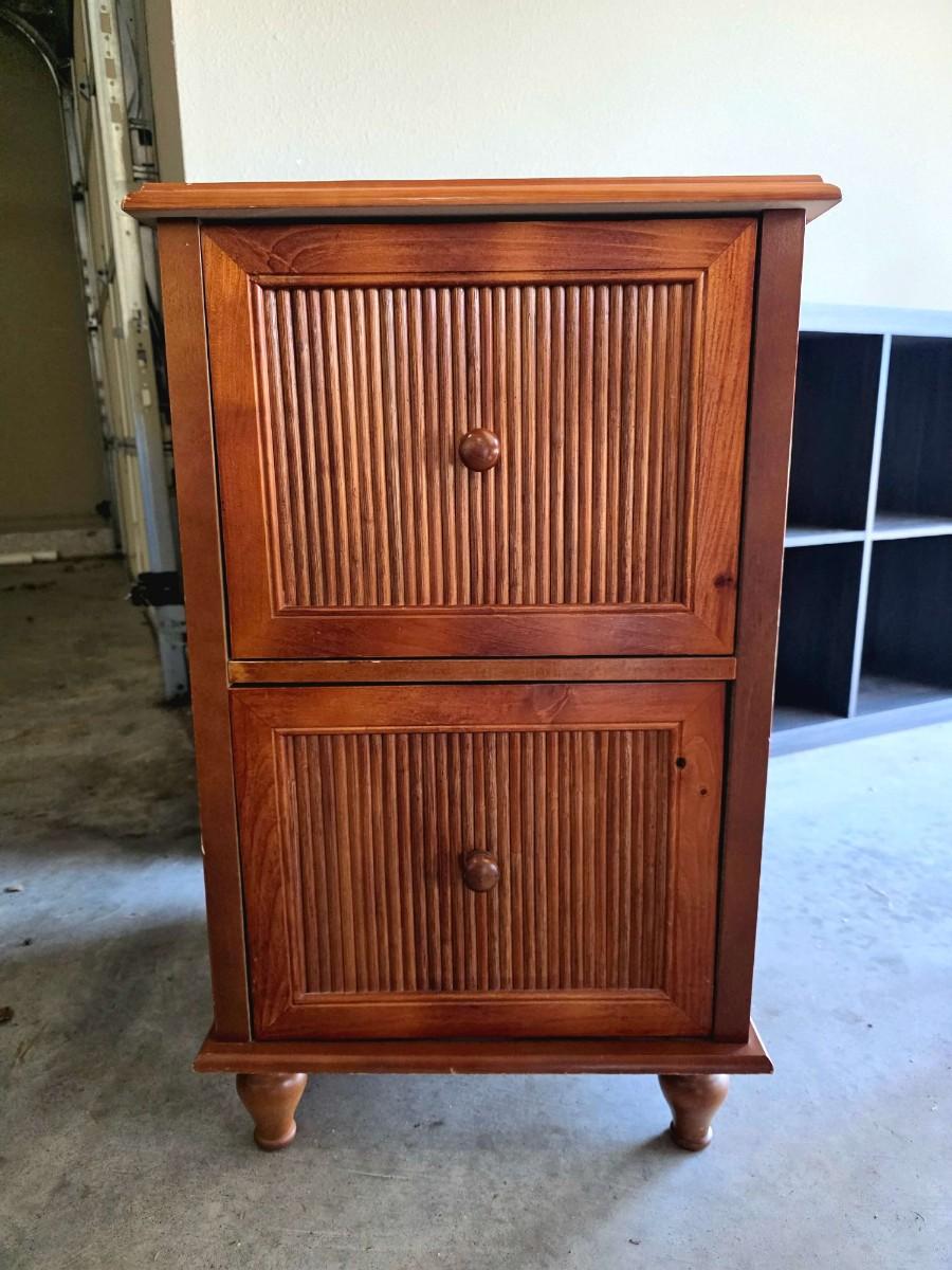 Wooden 2 drawer filing/accent cabinet. Does have some scratches. 17.5"L x 17'W x 28.5" H