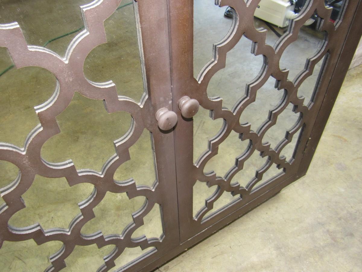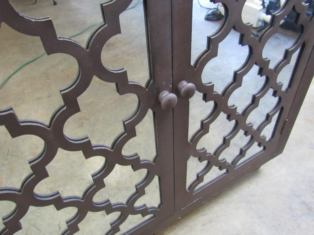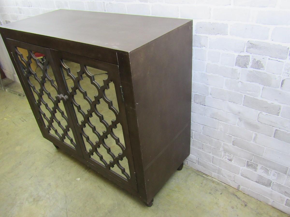 Accent cabinet with mirrored doors and decorative trellis pattern. Shows some wear, examine photos carefully for condition. 36" x 34" high x 16" deep.
