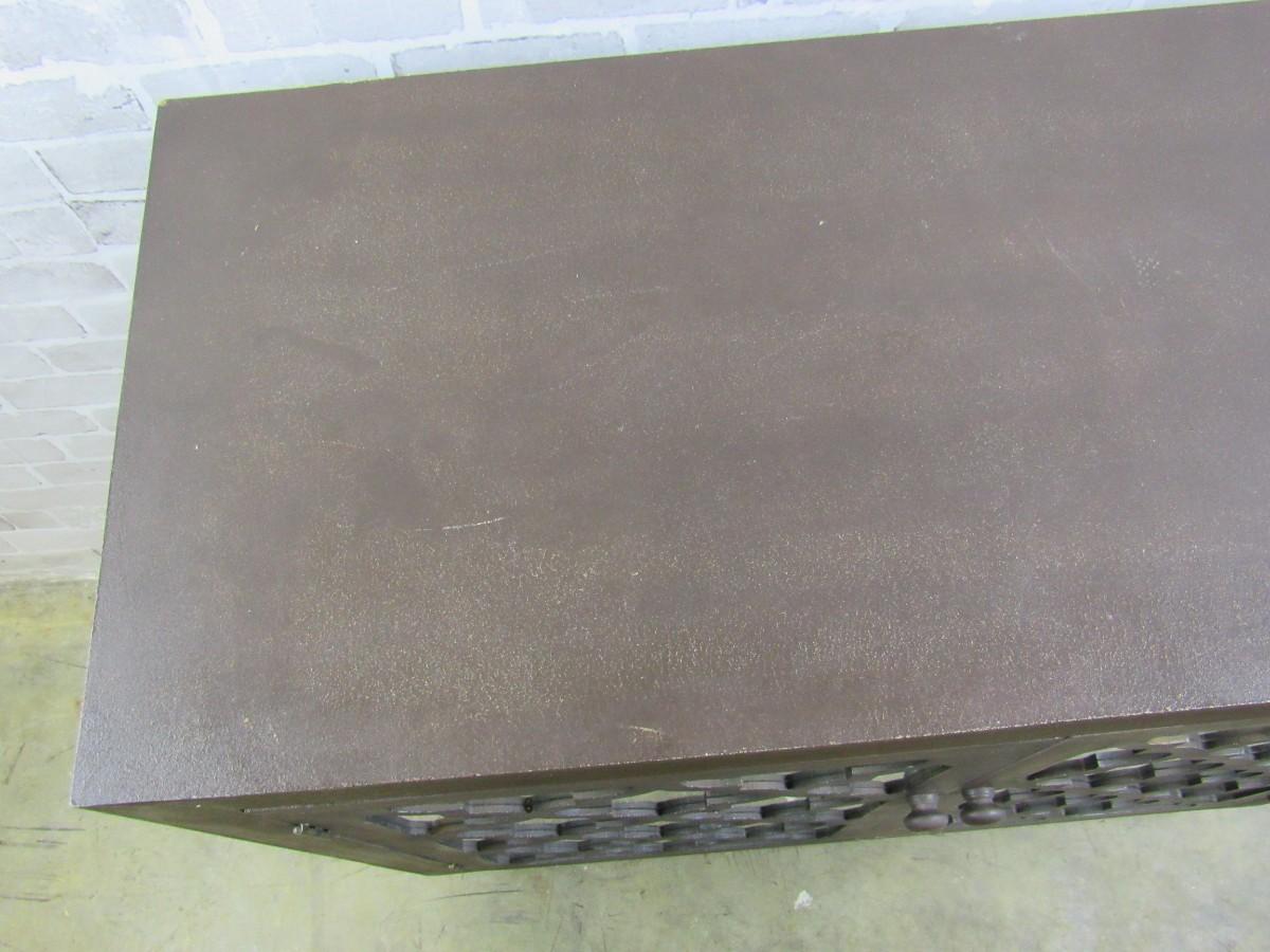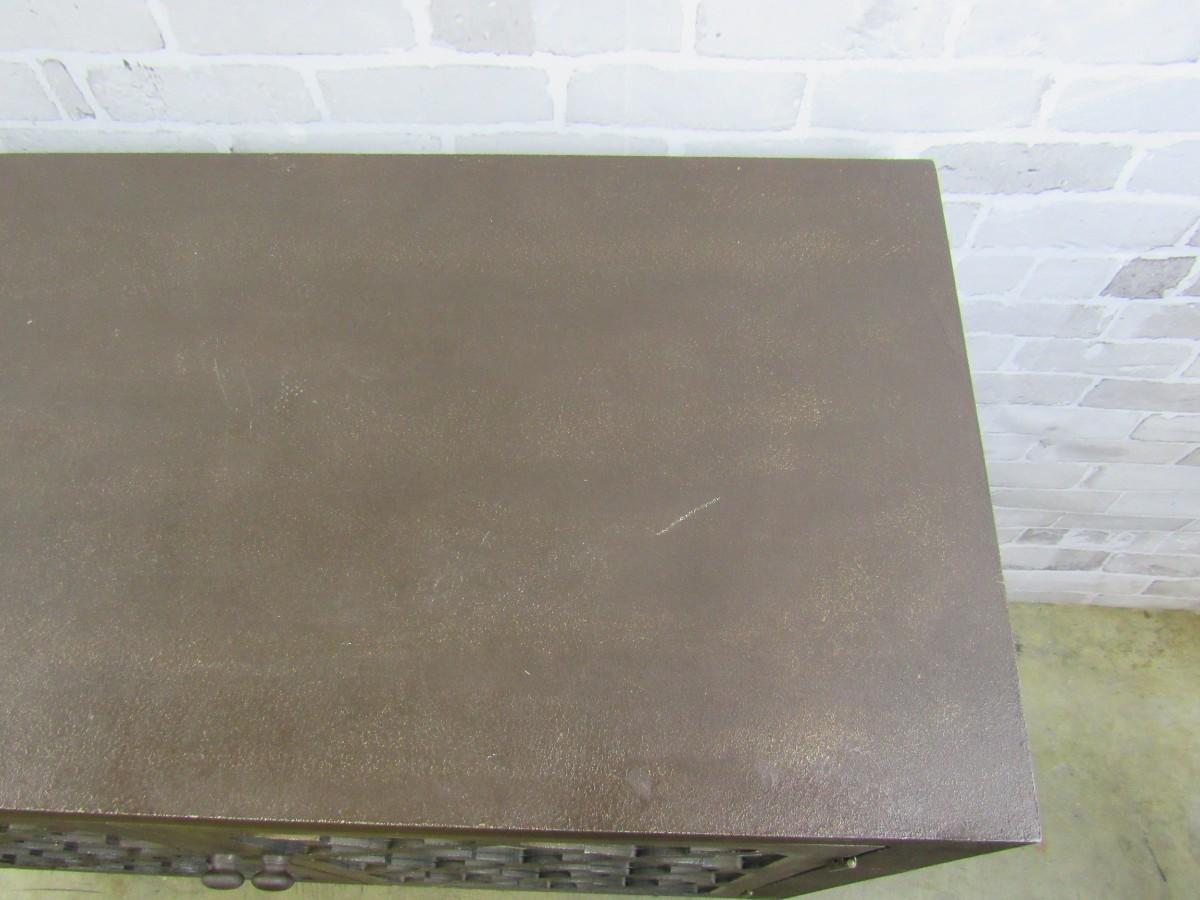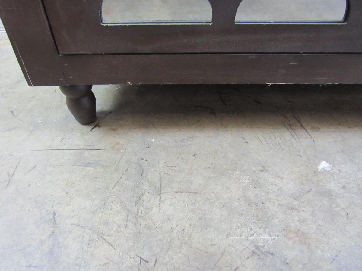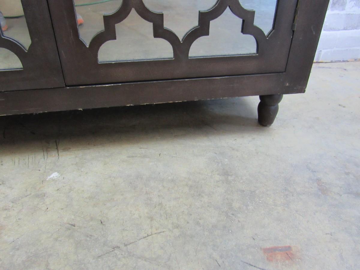 Accent cabinet with mirrored doors and decorative trellis pattern. Shows some wear, examine photos carefully for condition. 36" x 34" high x 16" deep.