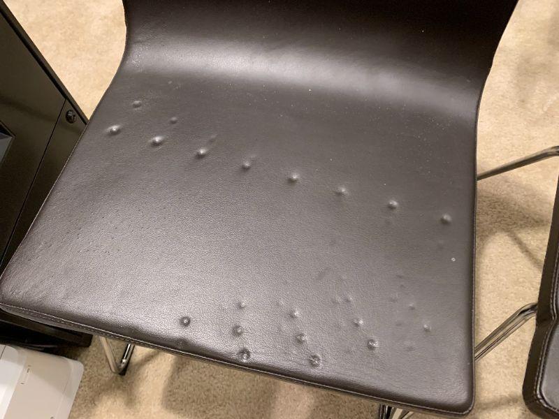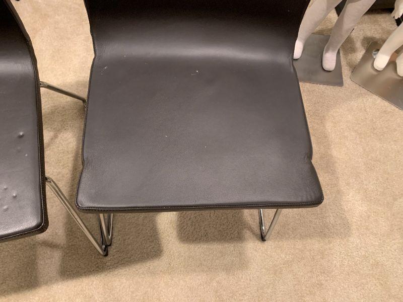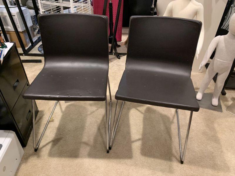 Pair of two faux leather chairs. Each has some indentations from being stacked, as pictured; unsure if they will come out or not. Otherwise in good condition.