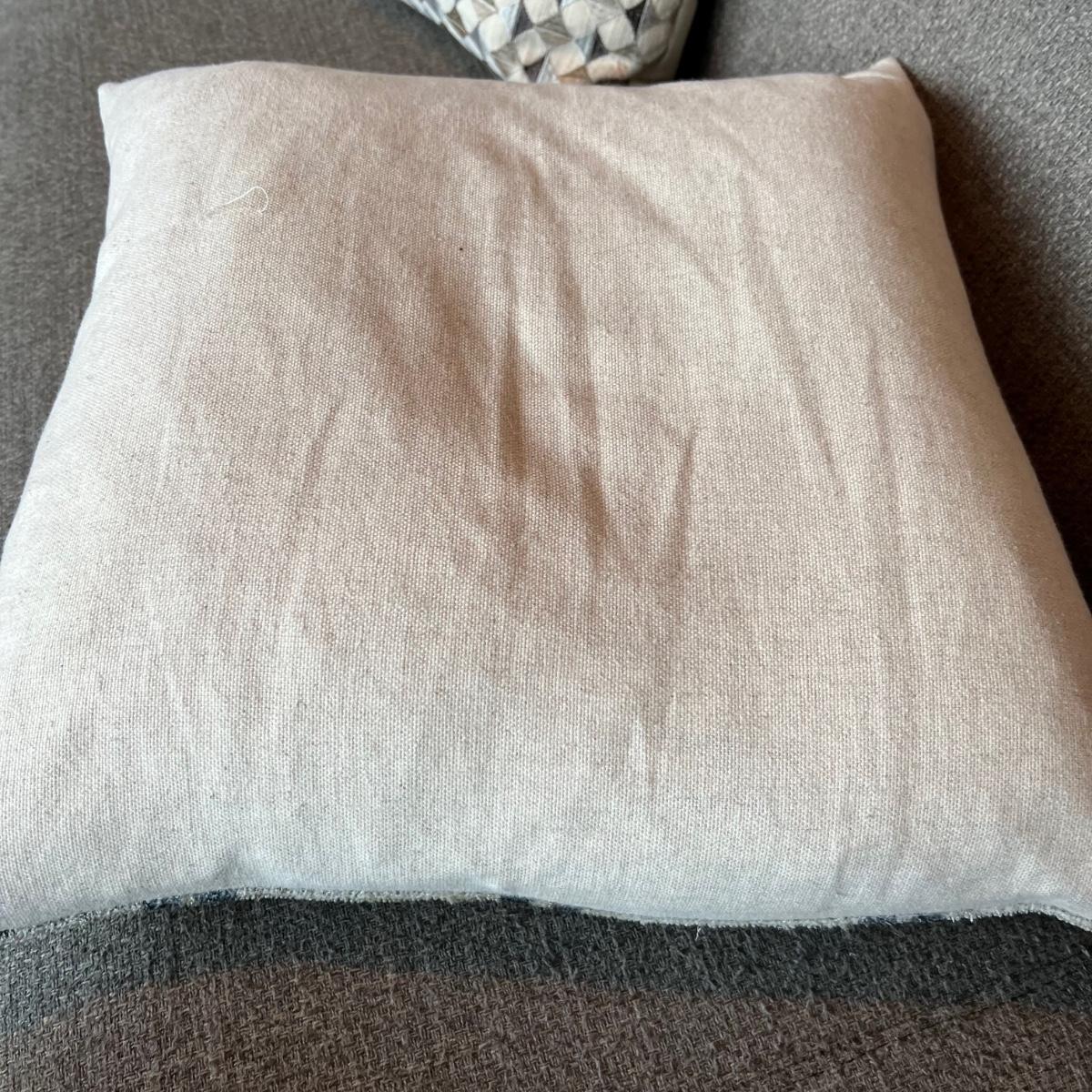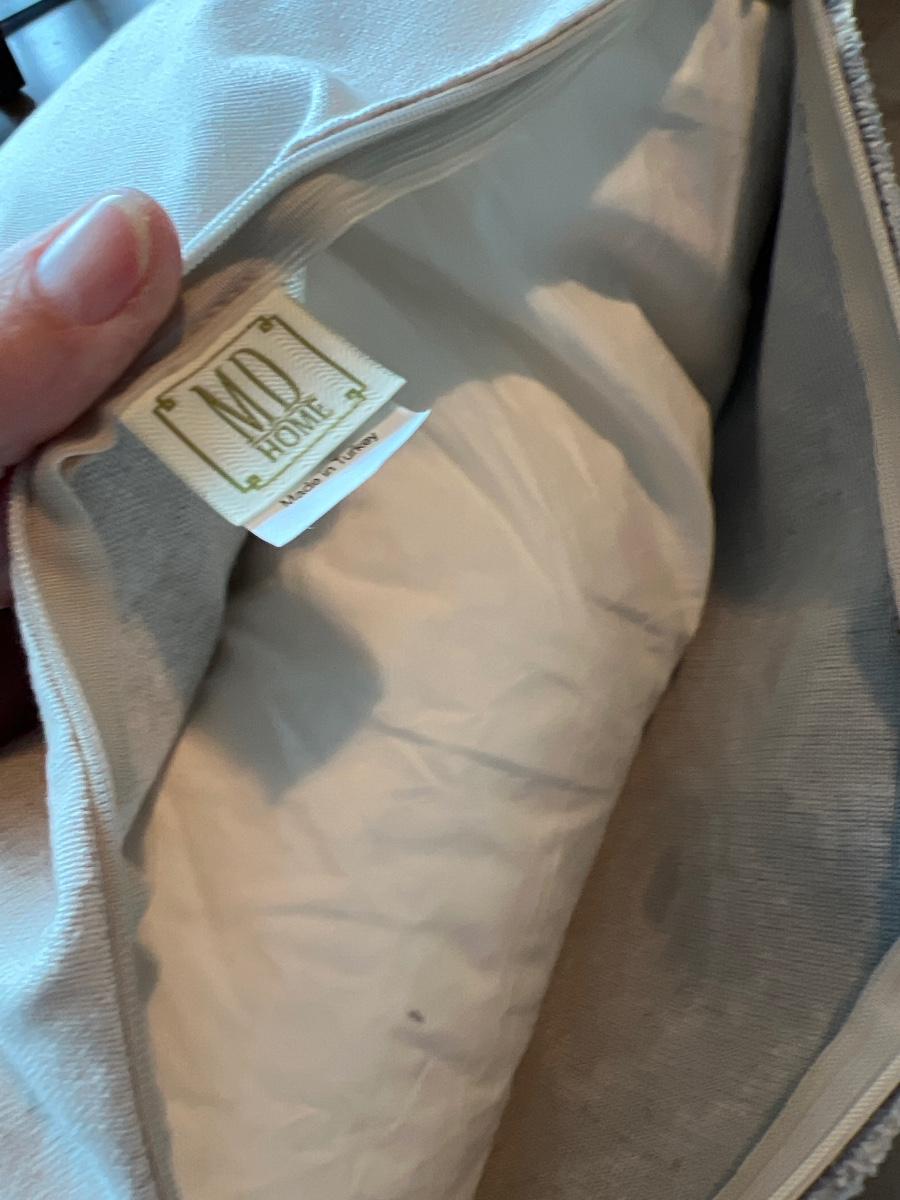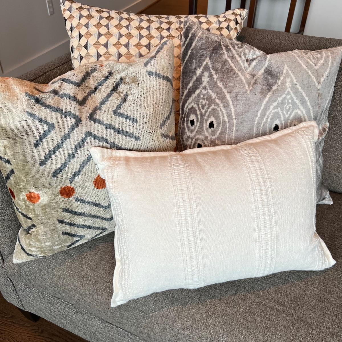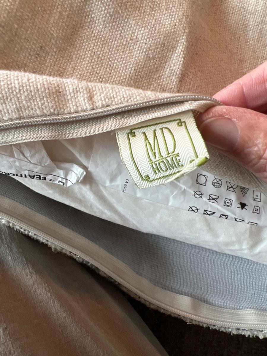 The three largest pillows all have removable covers, the smaller cream pillow does not. All are very clean and in good condition. The pillow with the orange dots has one thread pulled on its back.