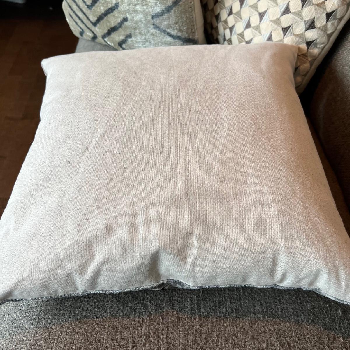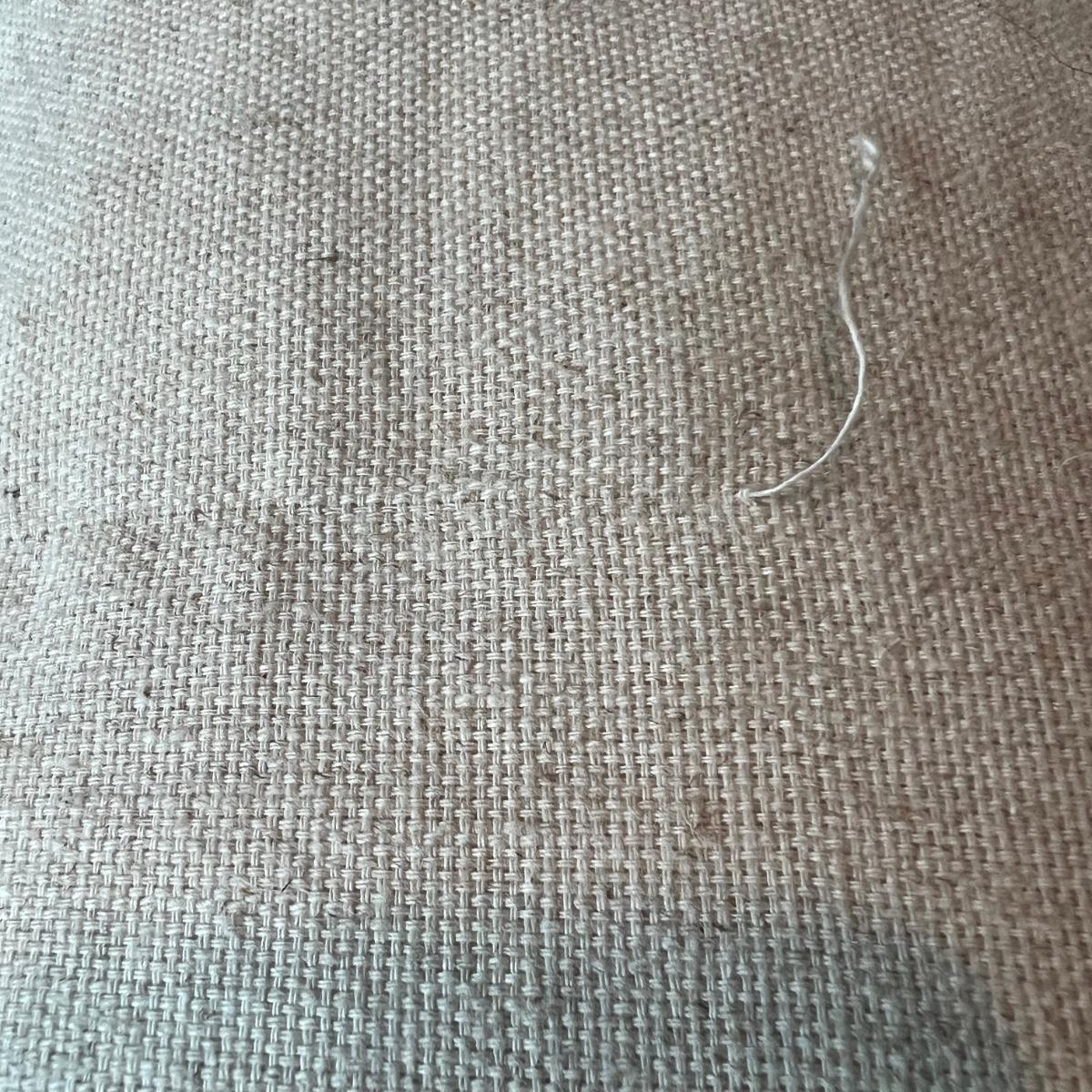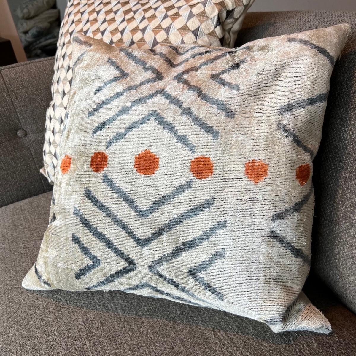 The three largest pillows all have removable covers, the smaller cream pillow does not. All are very clean and in good condition. The pillow with the orange dots has one thread pulled on its back.