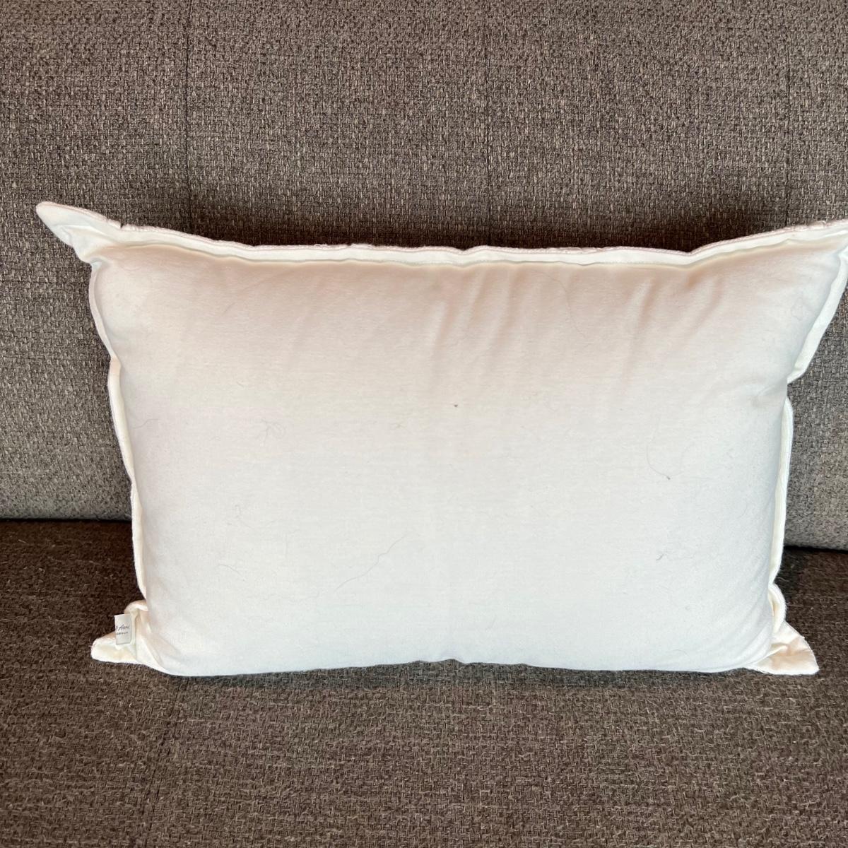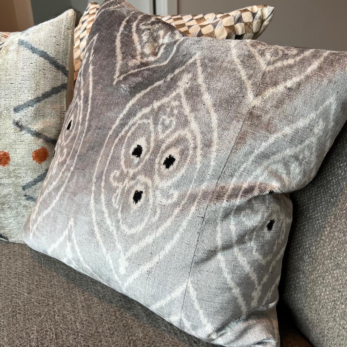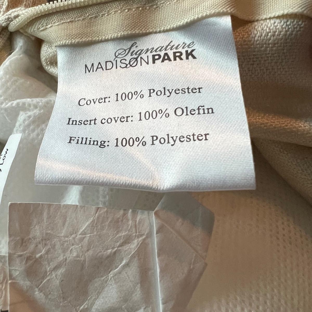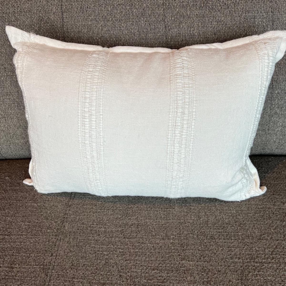 The three largest pillows all have removable covers, the smaller cream pillow does not. All are very clean and in good condition. The pillow with the orange dots has one thread pulled on its back.