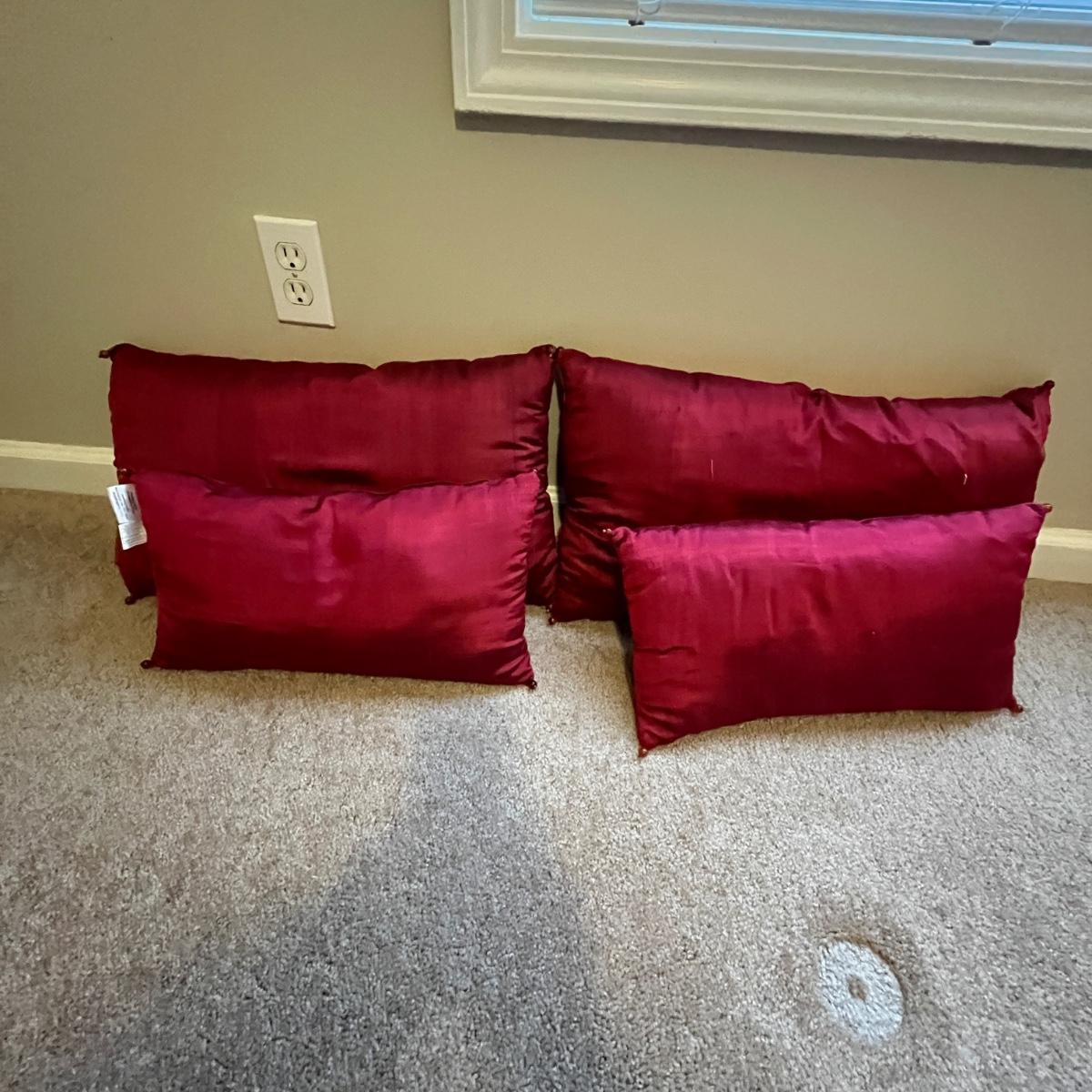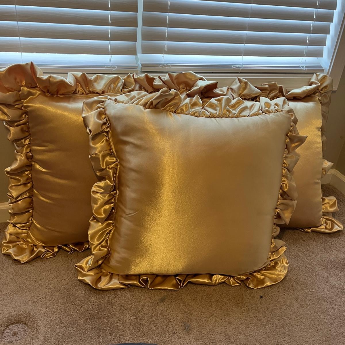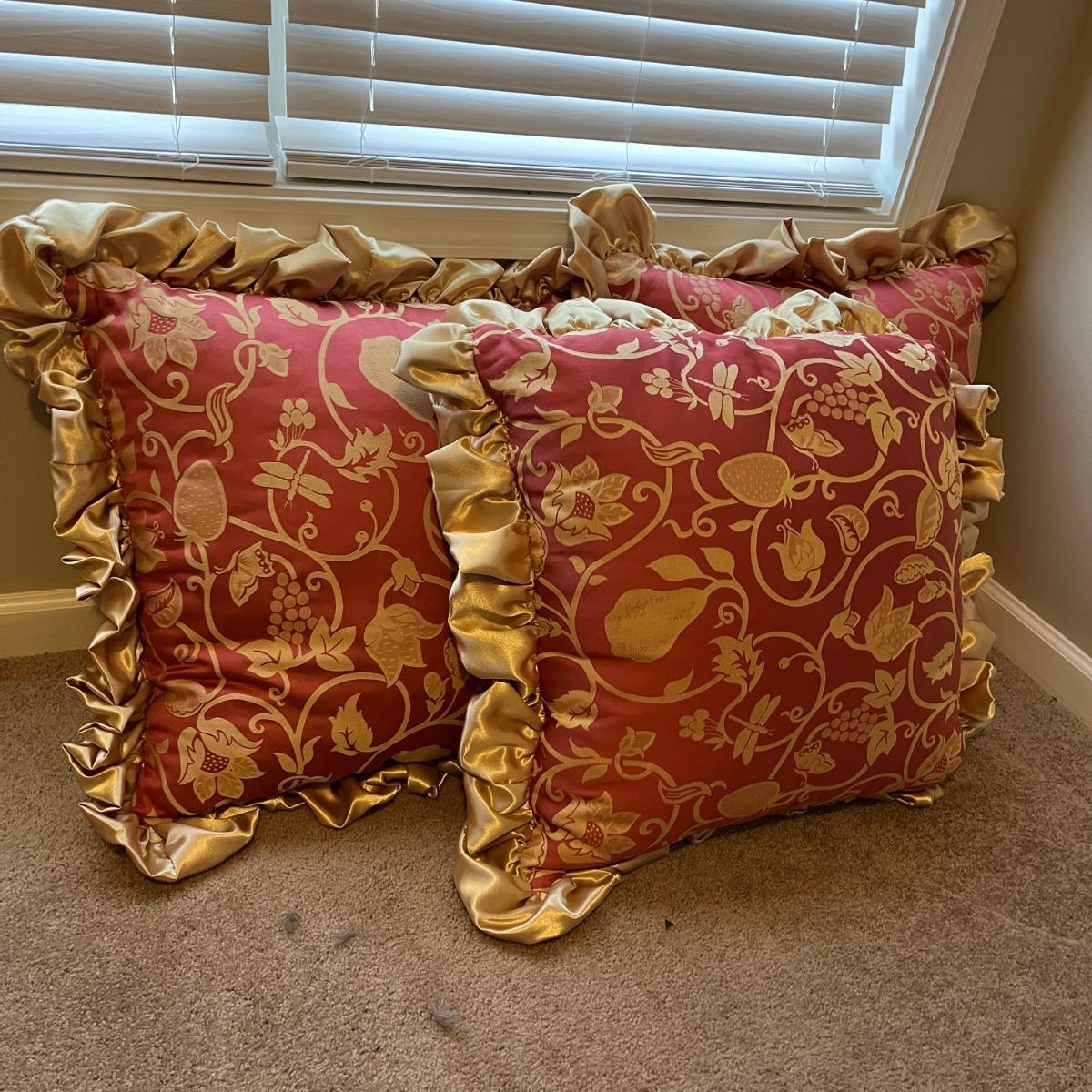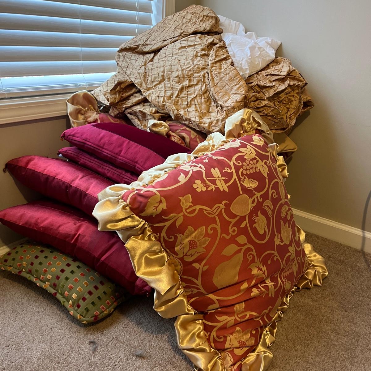 Lot contains a assortment of accent pillows including three 23” x 23” pillows, two 12” x 22” two pillows and two 9” x 16” pillows, 16” x 16” pillow and a bed skirt that measures 72” x 84”.