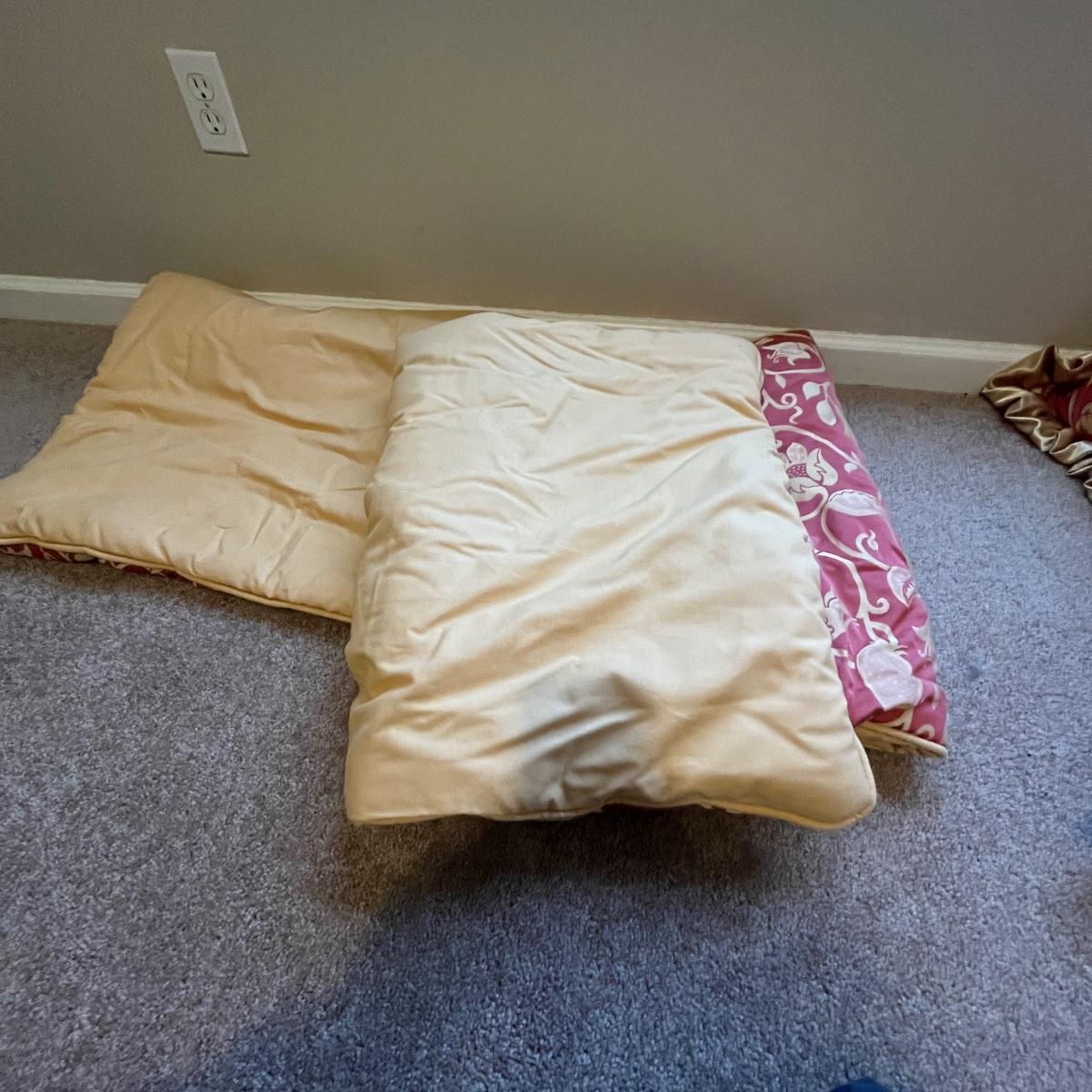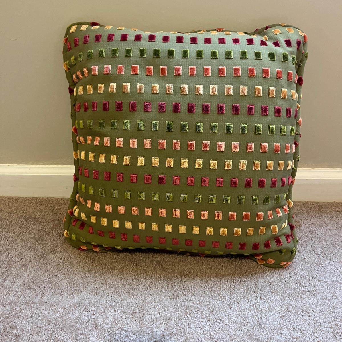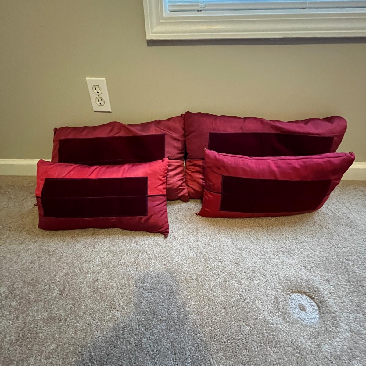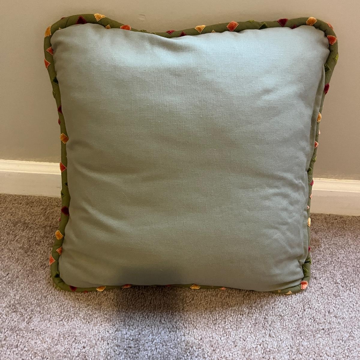 Lot contains a assortment of accent pillows including three 23” x 23” pillows, two 12” x 22” two pillows and two 9” x 16” pillows, 16” x 16” pillow and a bed skirt that measures 72” x 84”.