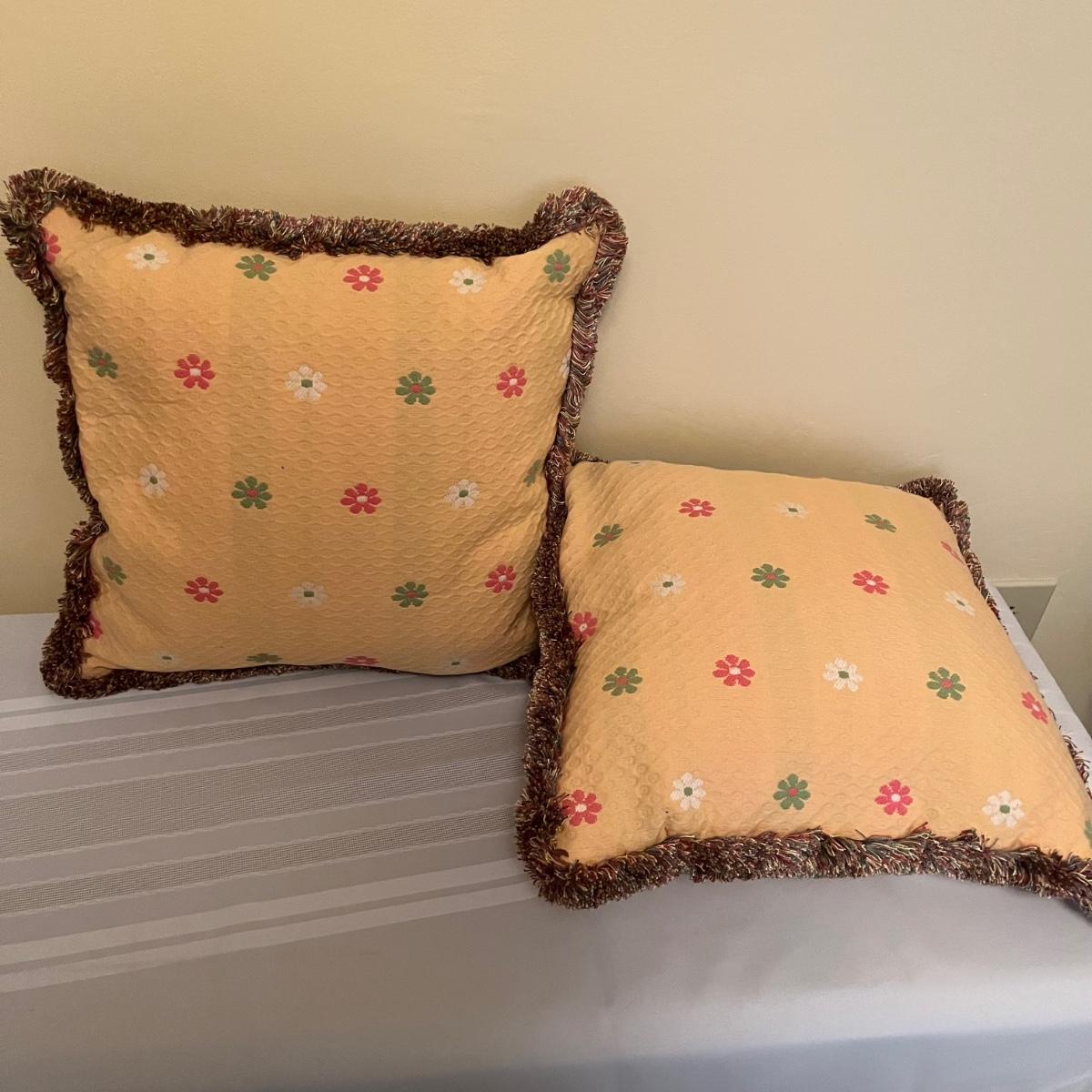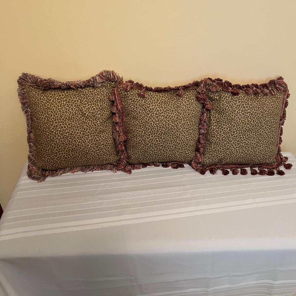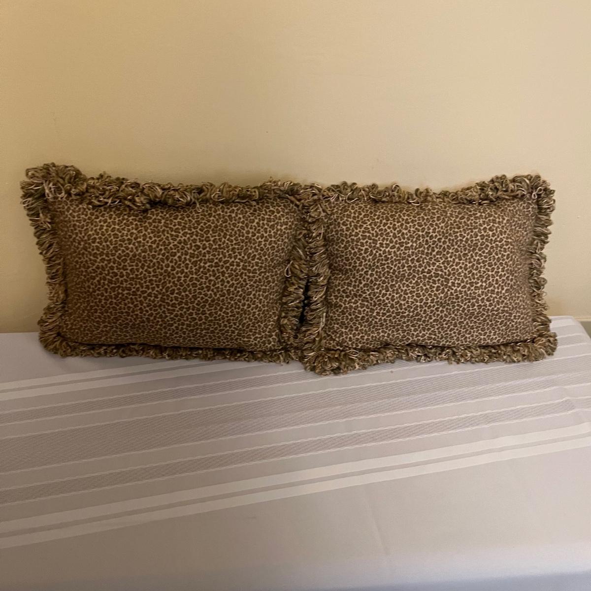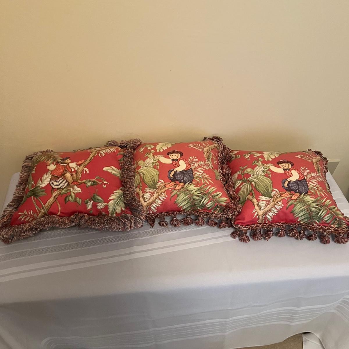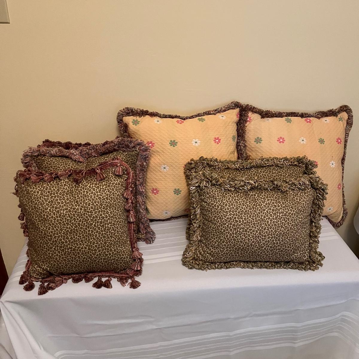 Lot contains seven pillows. There are two matching 18” x 18” pillows, three matching 14” x 14” pillows with leopard print on one side and monkeys on the other, and two matching 14” x 18” pillows.
