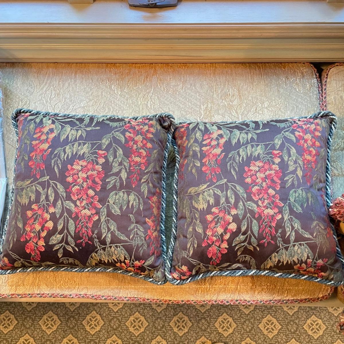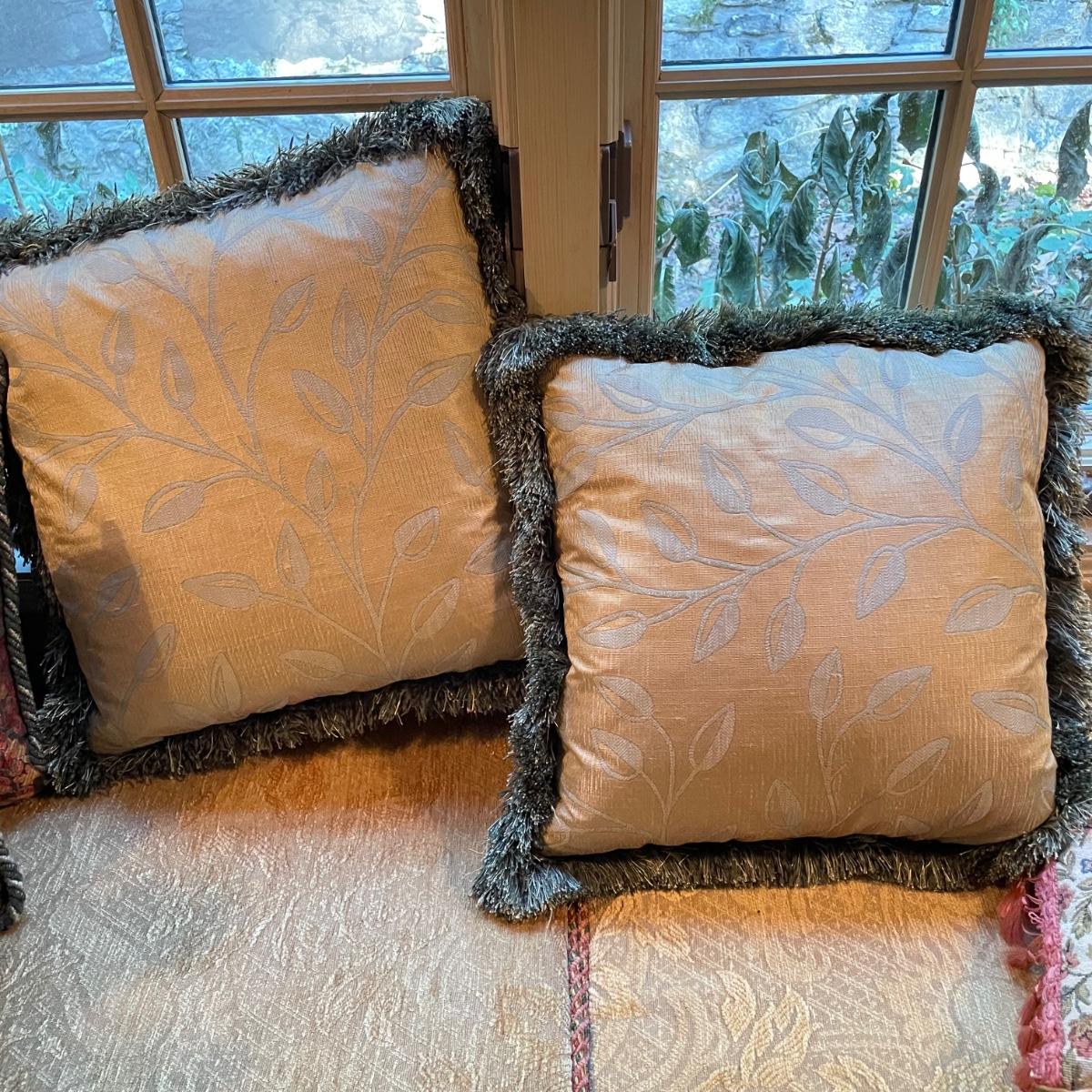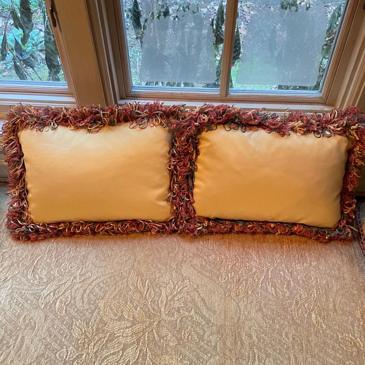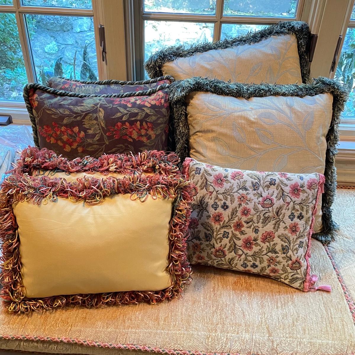 Three pairs of accent pillows plus a delicate ribboned and tassel pillow. The largest pillows are gold and green, they measure 17” x 16” without the fringe. See images. Local pick up only.