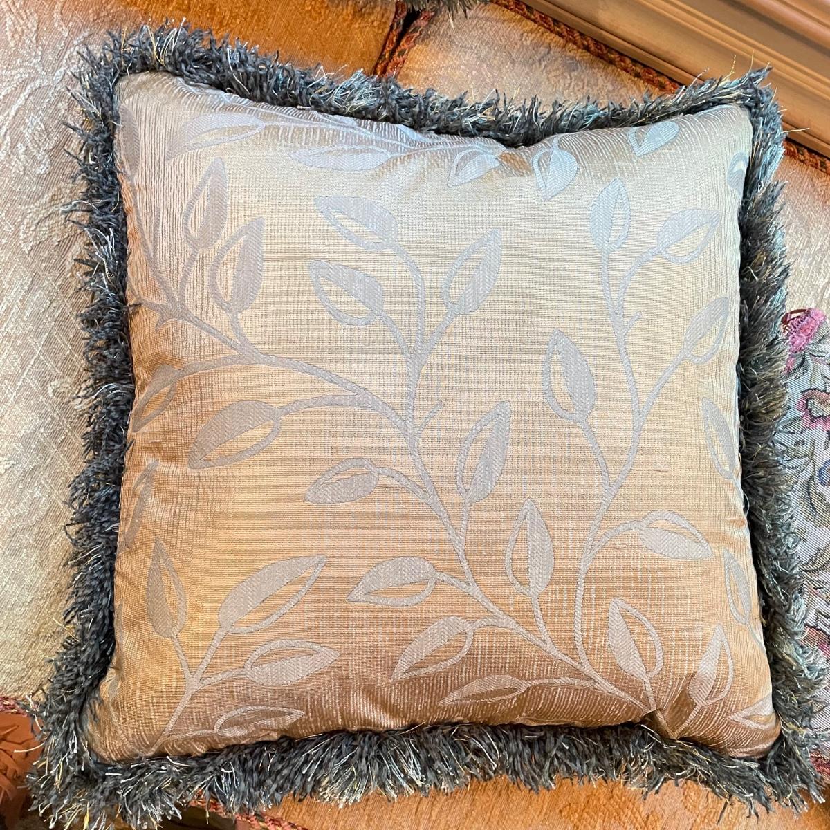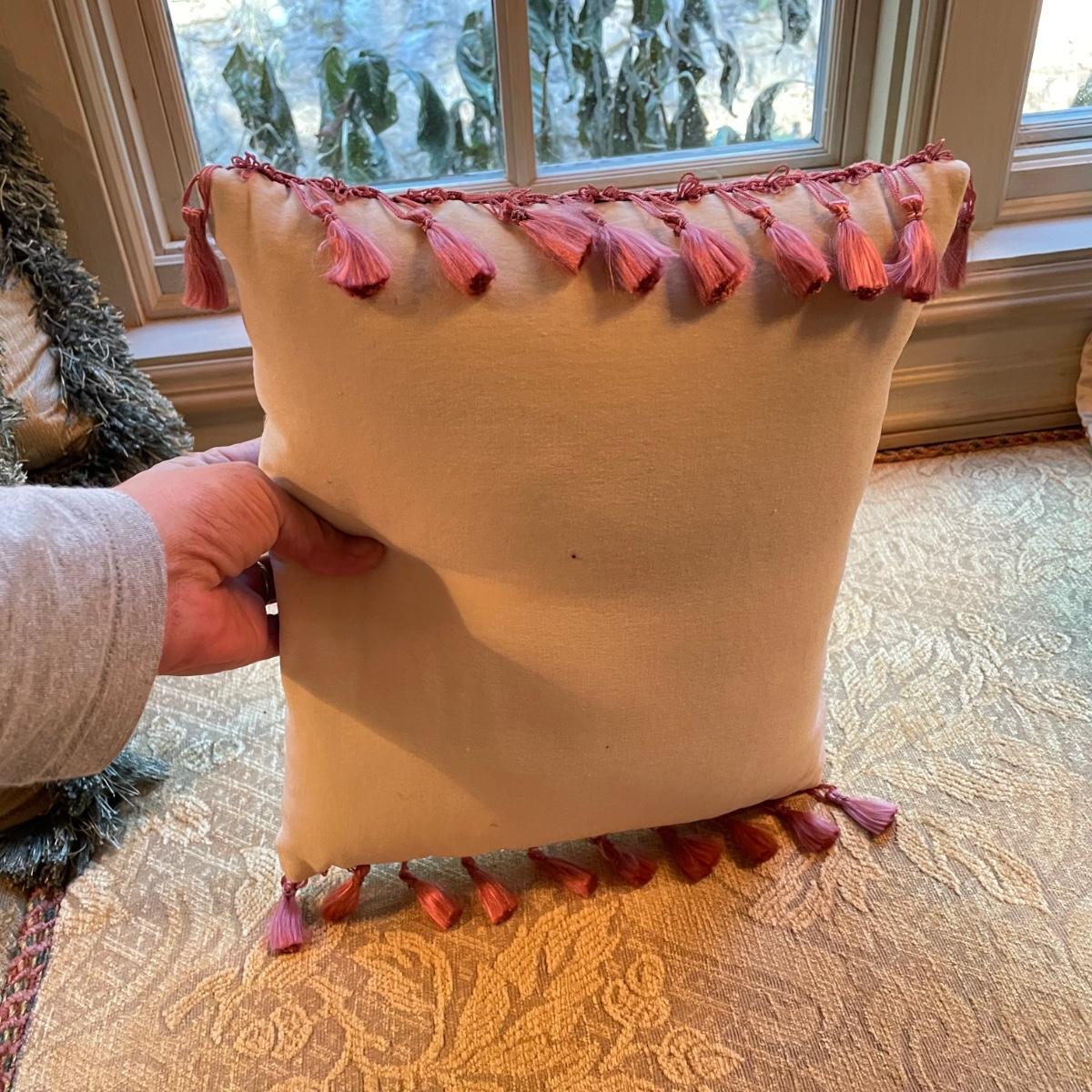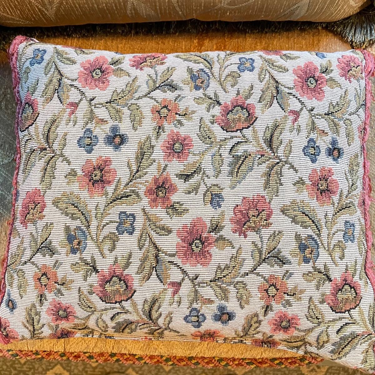Three pairs of accent pillows plus a delicate ribboned and tassel pillow. The largest pillows are gold and green, they measure 17” x 16” without the fringe. See images. Local pick up only.