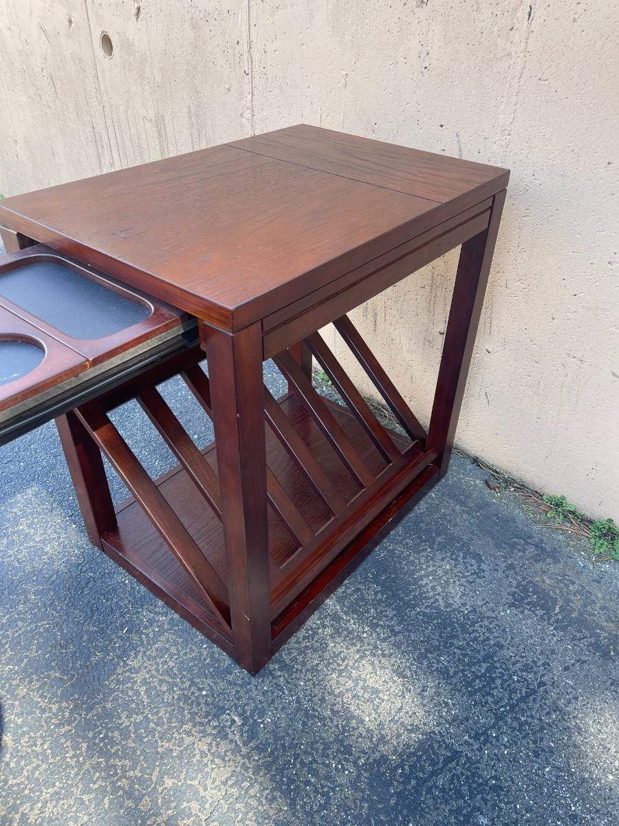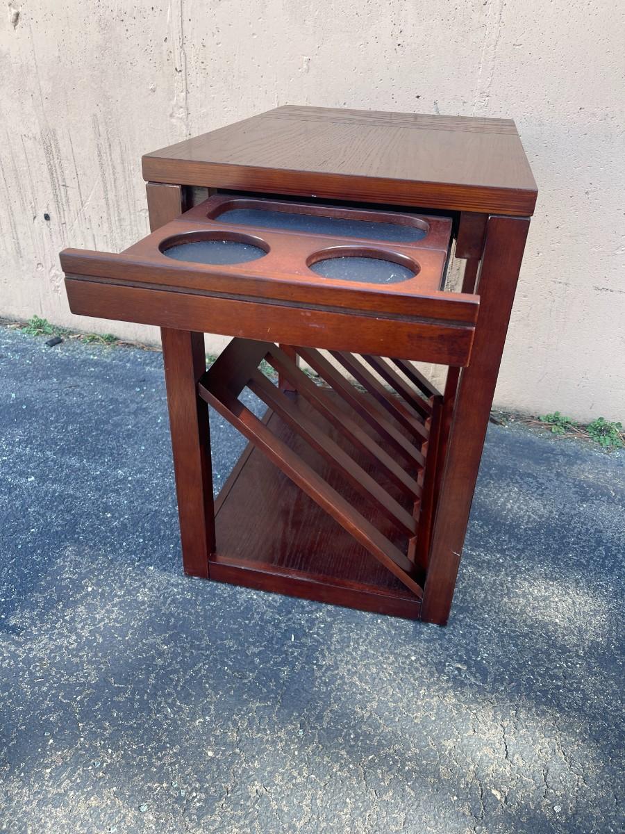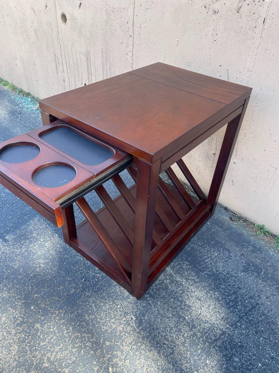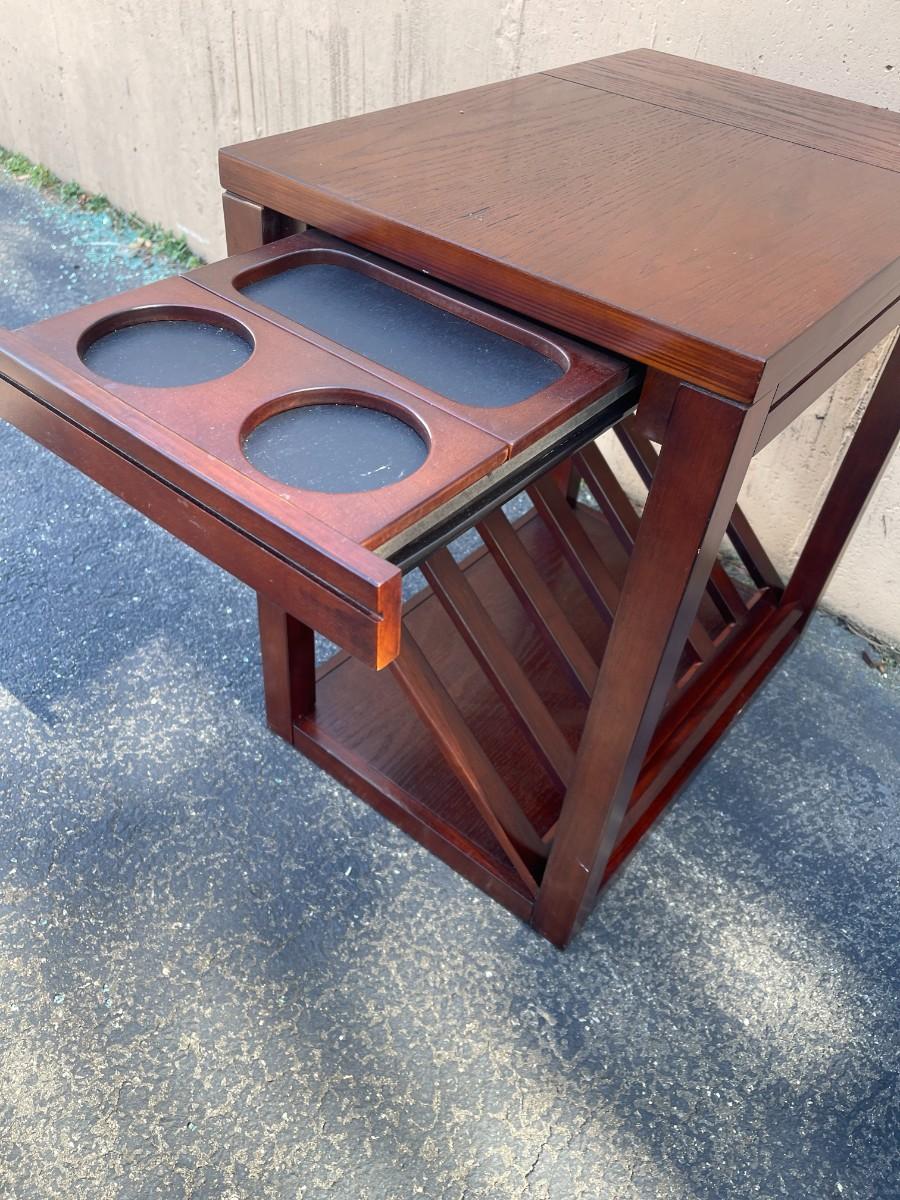 Accent Table with Magazine Rack & Cup Holder. Good condition with minor scratches here and there. Pull out cup holder. Magazine rack is removable. Finish is cherry. 16" x 23" x 24 1/4" high. Smoke free and pet free home. # 1149