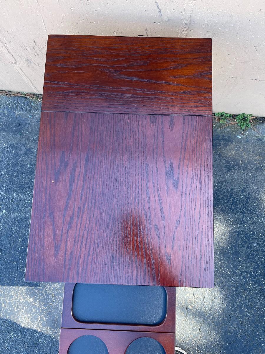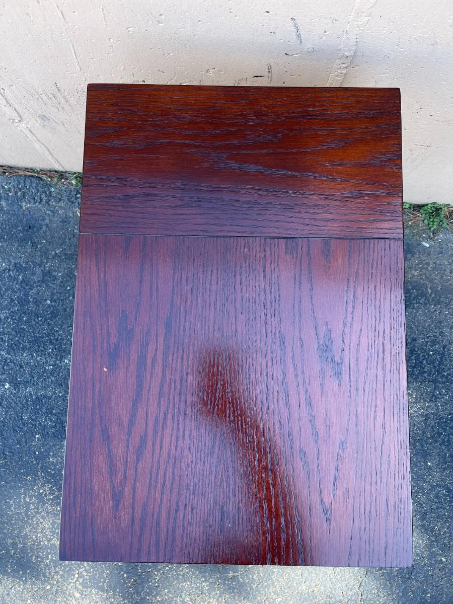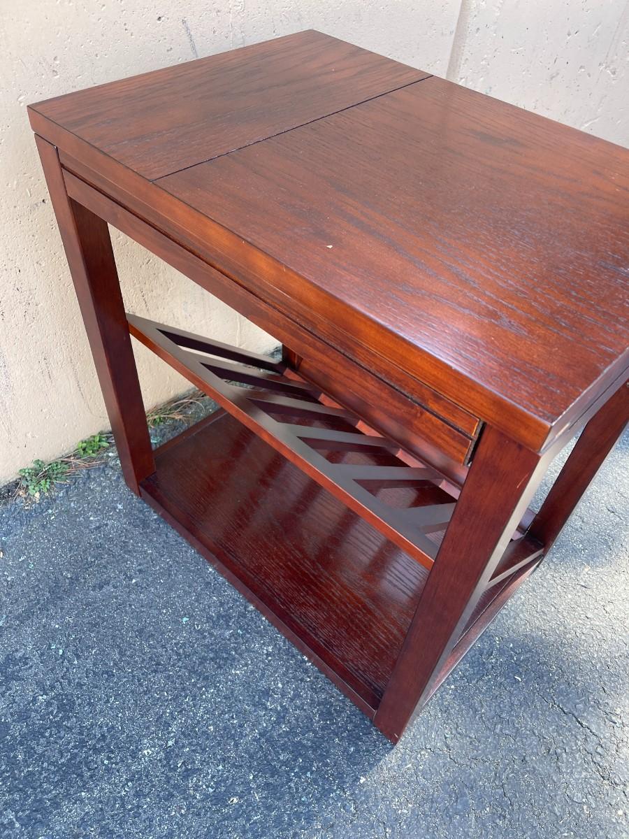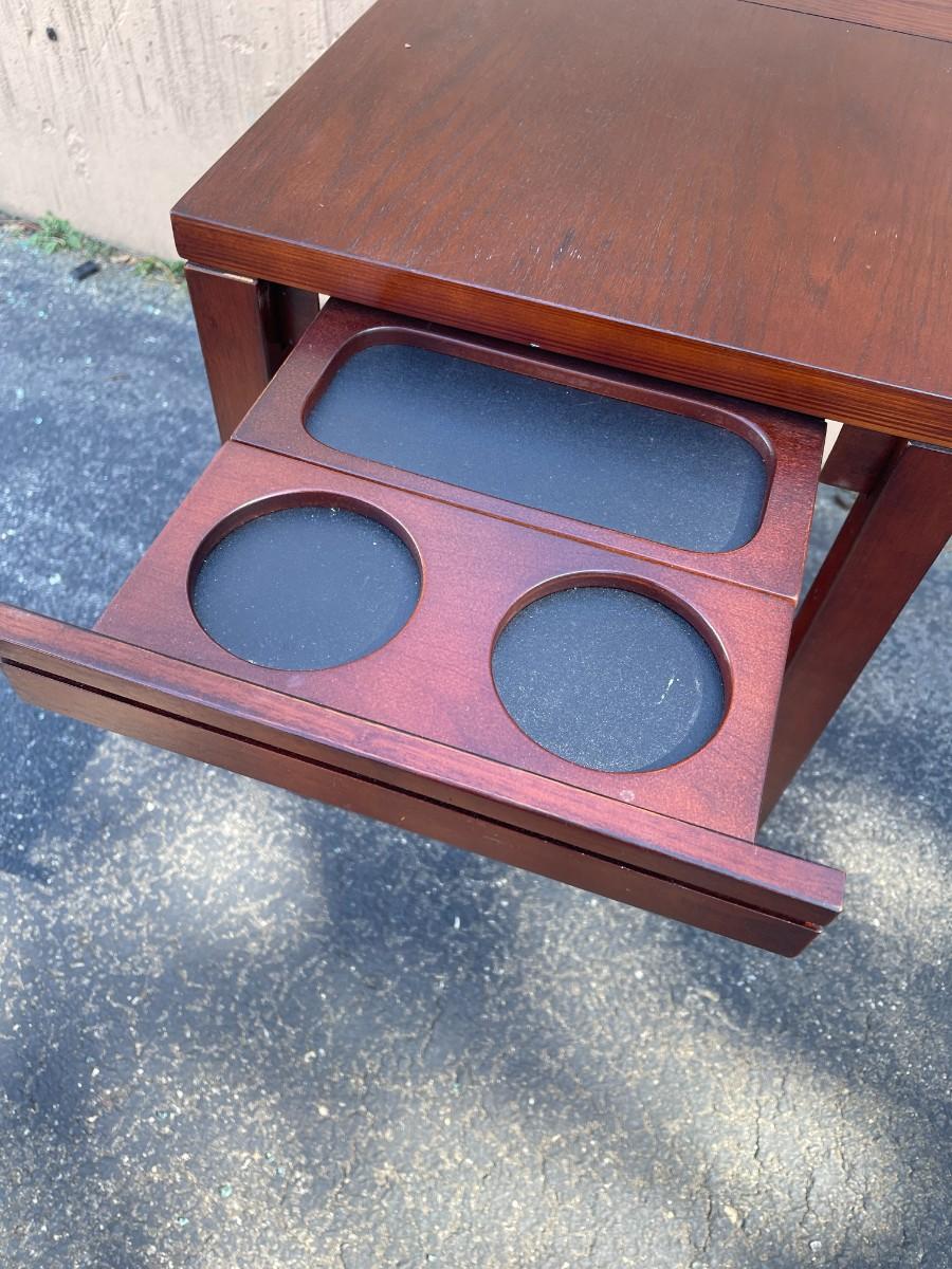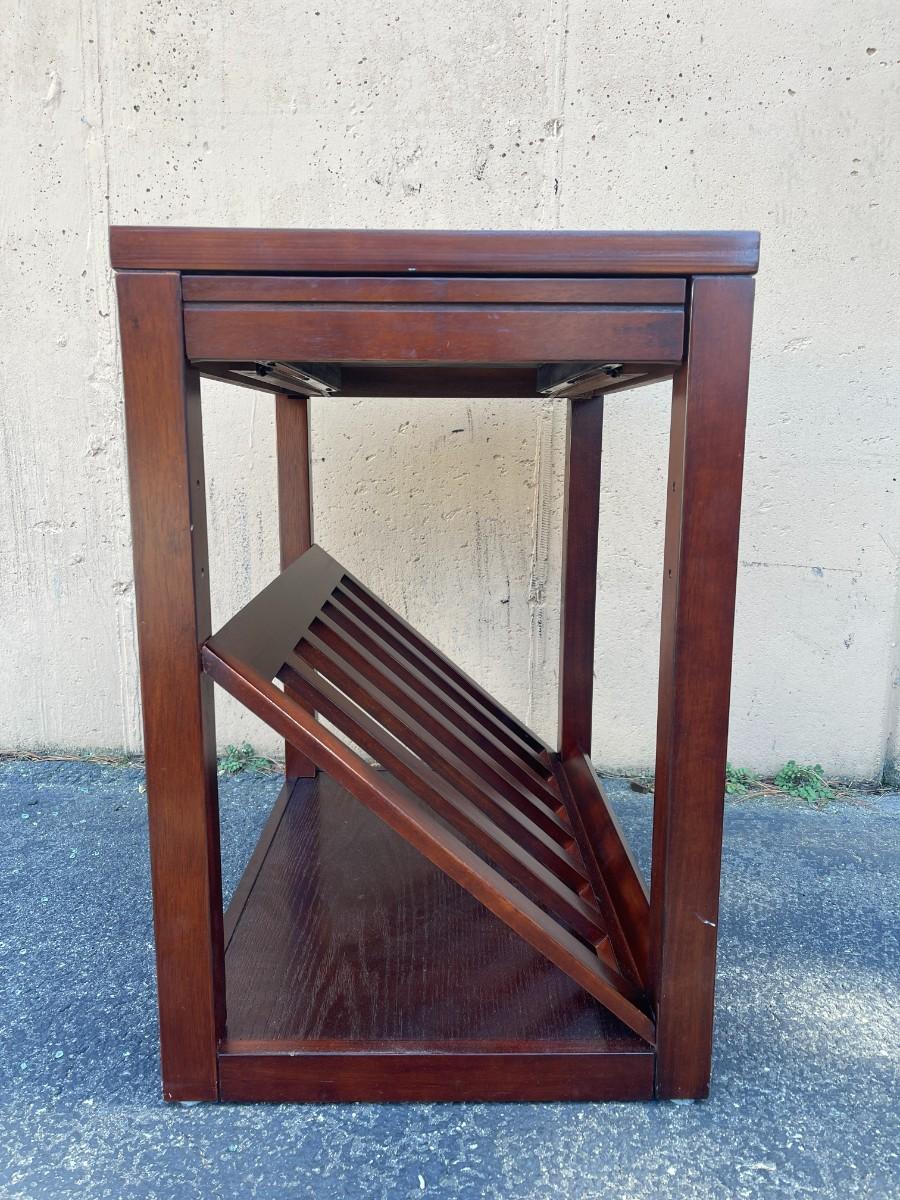 Accent Table with Magazine Rack & Cup Holder. Good condition with minor scratches here and there. Pull out cup holder. Magazine rack is removable. Finish is cherry. 16" x 23" x 24 1/4" high. Smoke free and pet free home. # 1149