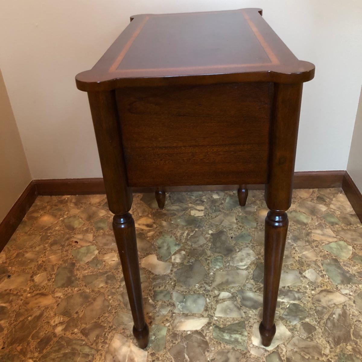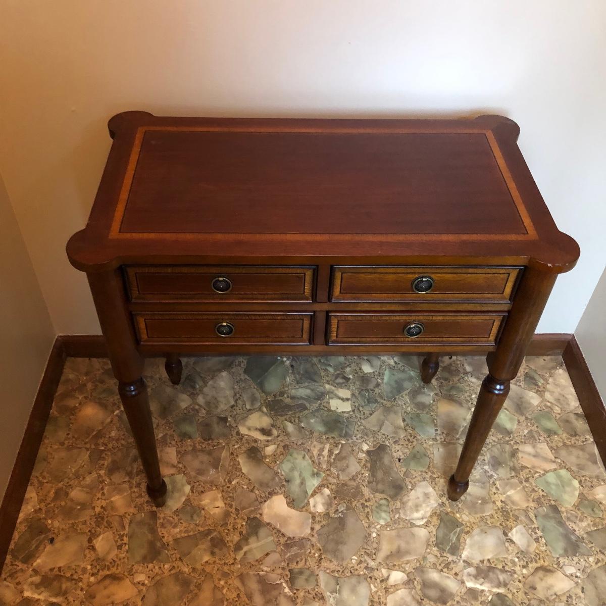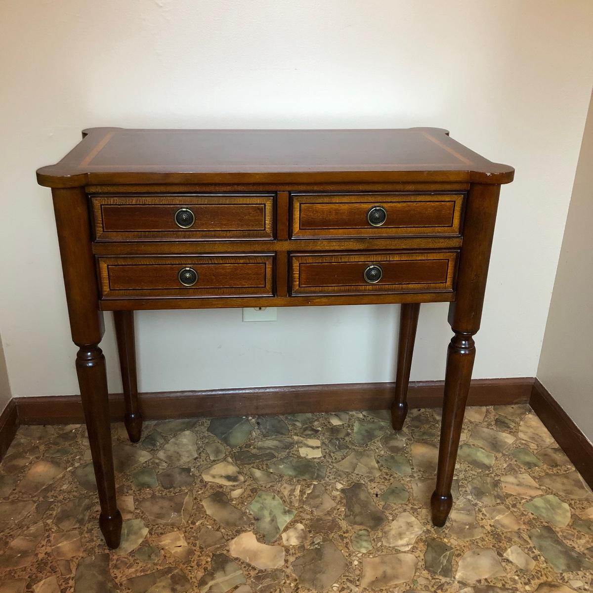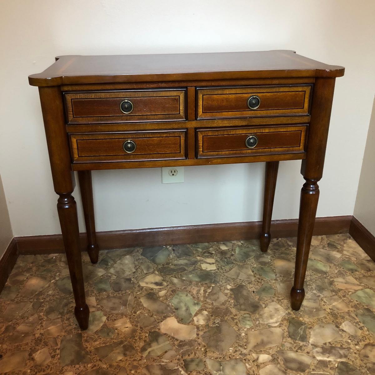 Lot includes a four dovetailed drawer side table with inlays on top and on drawers. Table measures 17” x 30” x 30”.