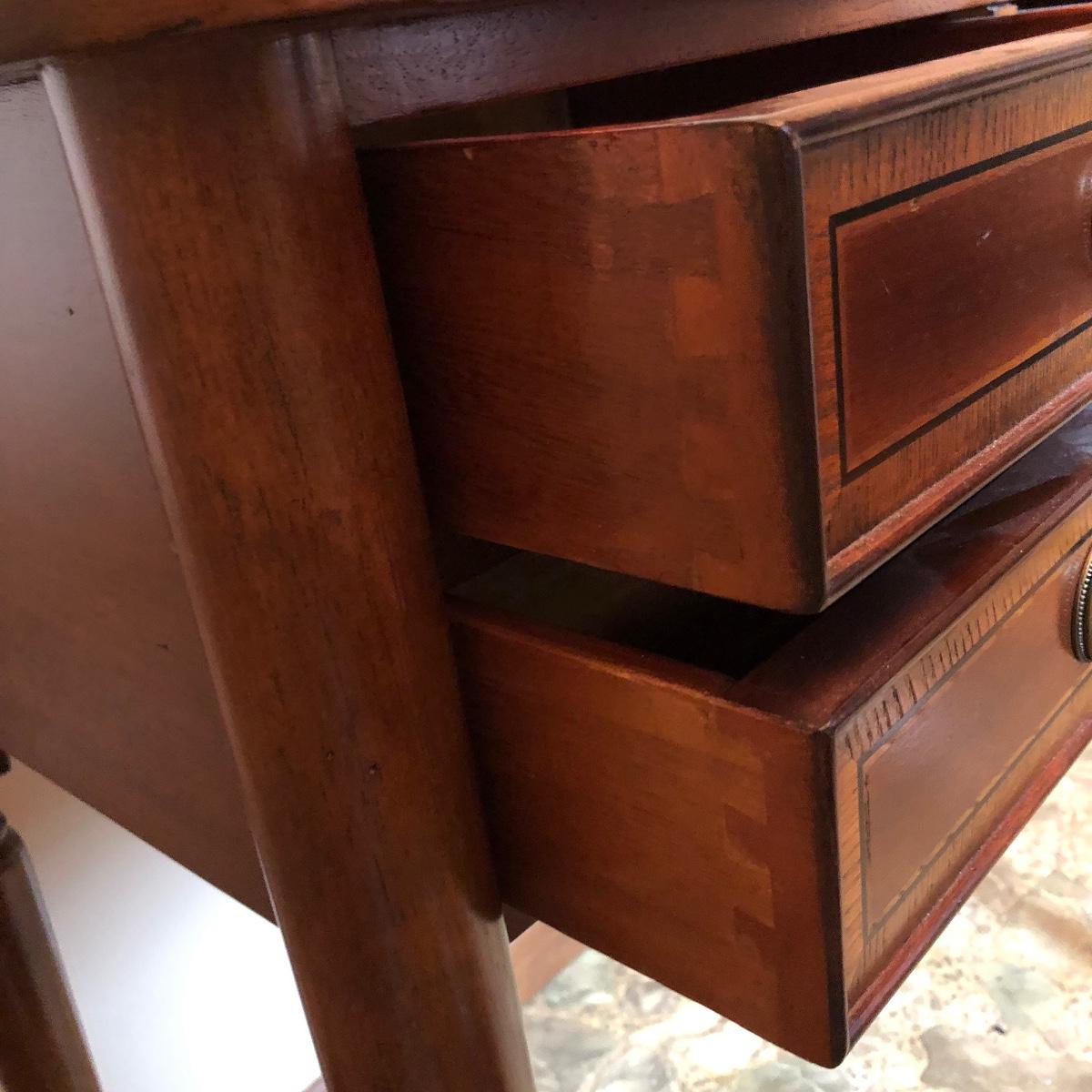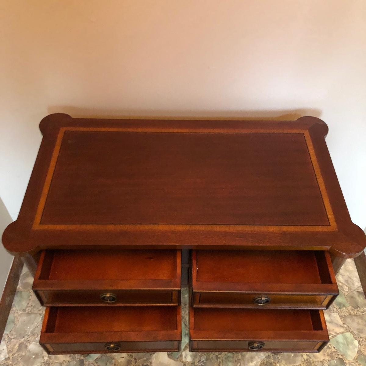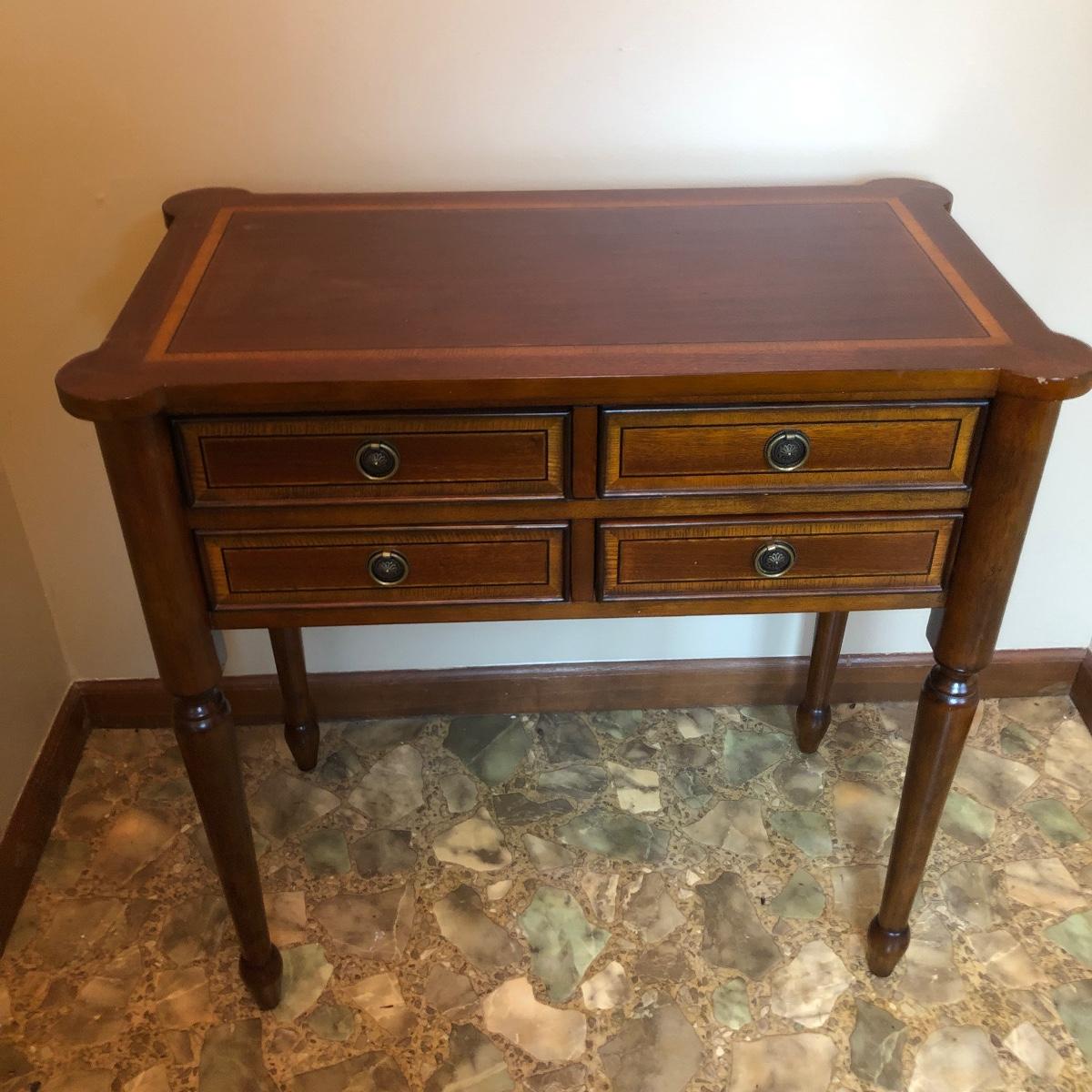 Lot includes a four dovetailed drawer side table with inlays on top and on drawers. Table measures 17” x 30” x 30”.