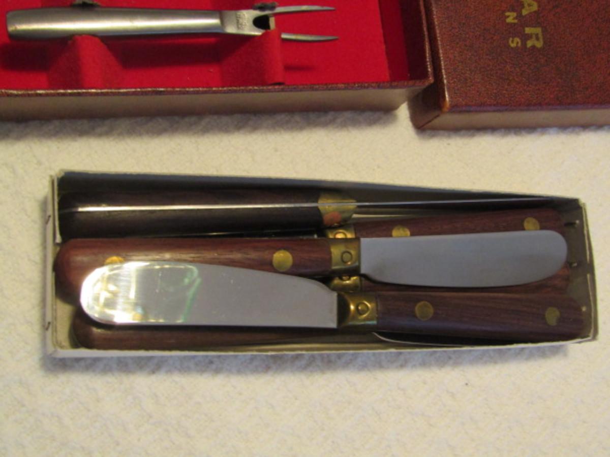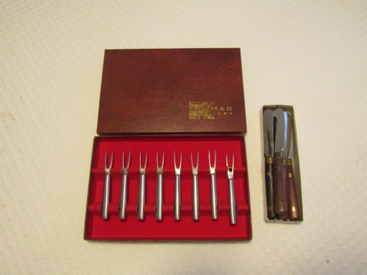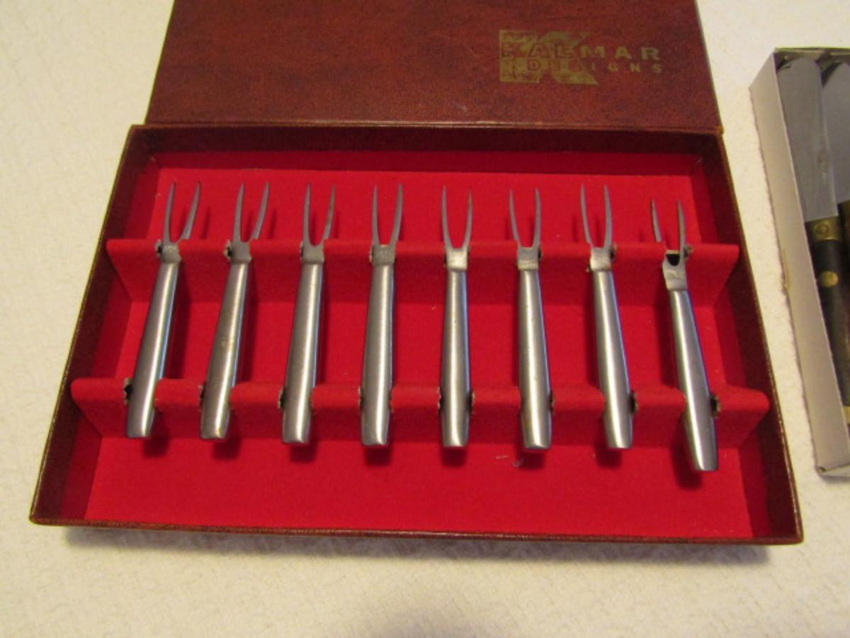 Accessories for Entertaining- Kalmar Designs 8 Piece Corn Set/Appetizer Forks & 6 Piece Spreader Set. Corn set is made in Italy and comes with original box. The manufacturer of the spreaders is unknown, but appear to be high quality- handles may be teakwood.