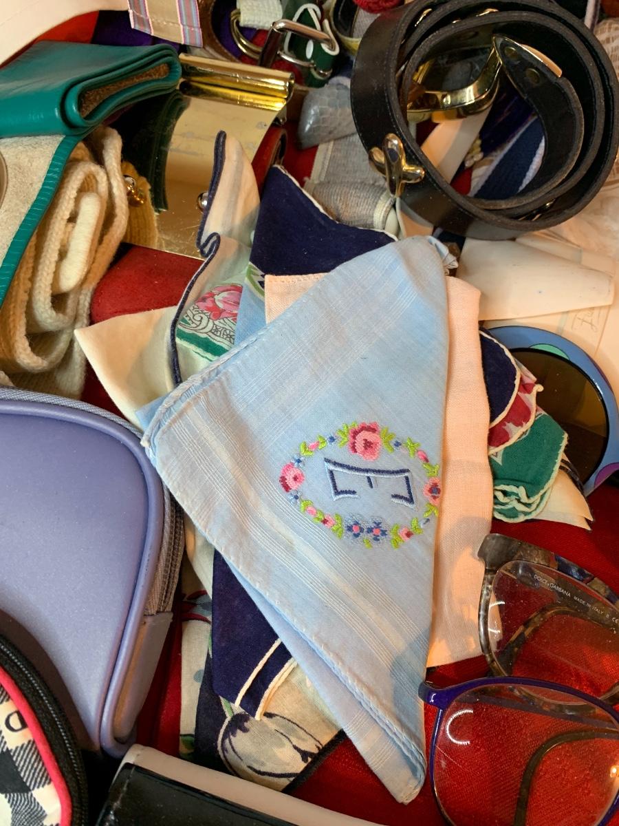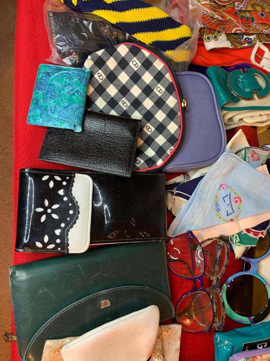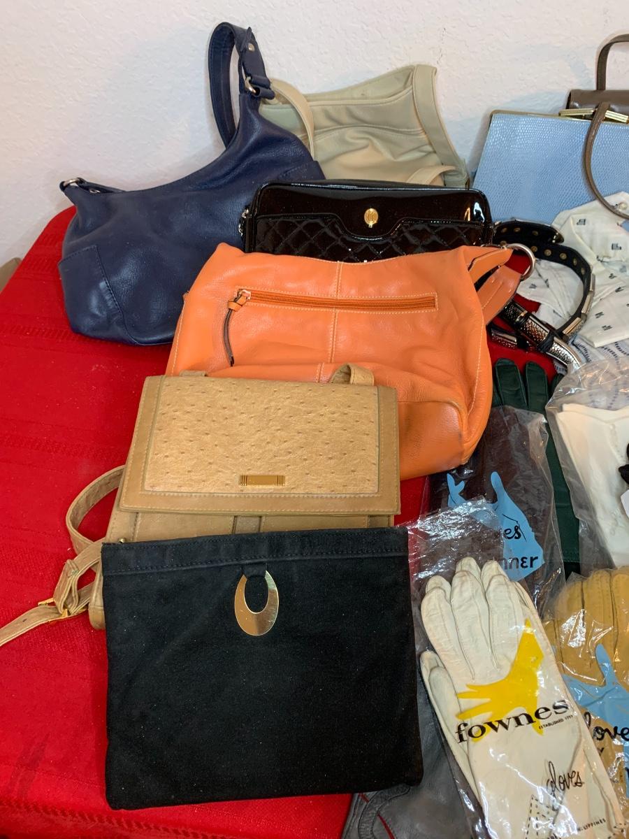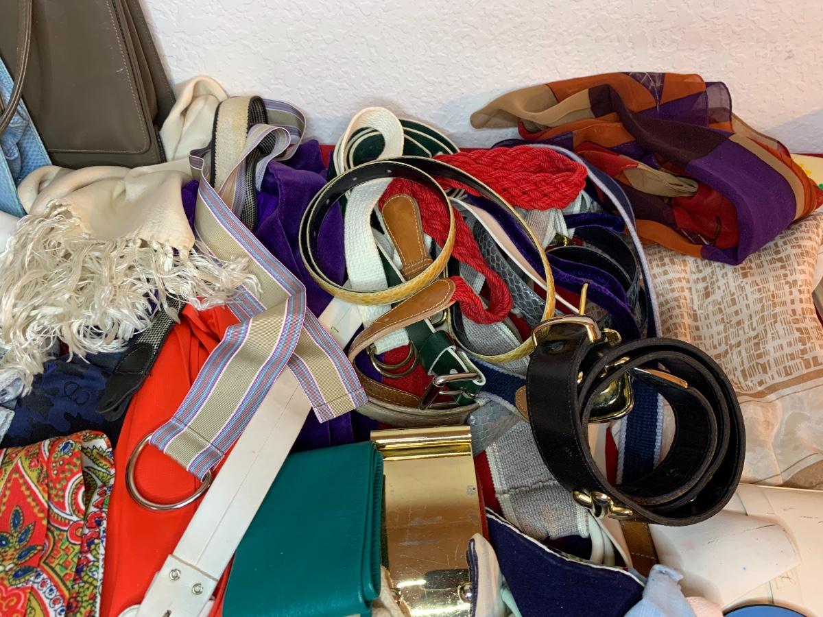 Lot full of accessories including vintage belts (smaller waist), purses and hand bags, gloves, hankies, scarves, makeup pouches, dickies, Fuilio Pucci glasses, Dolce and Gabbana prescription glasses with bifocal. Snake belt by Cignal.