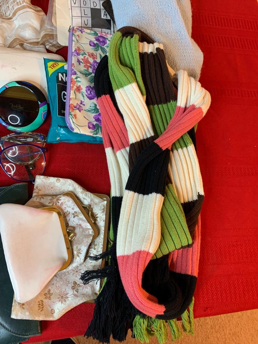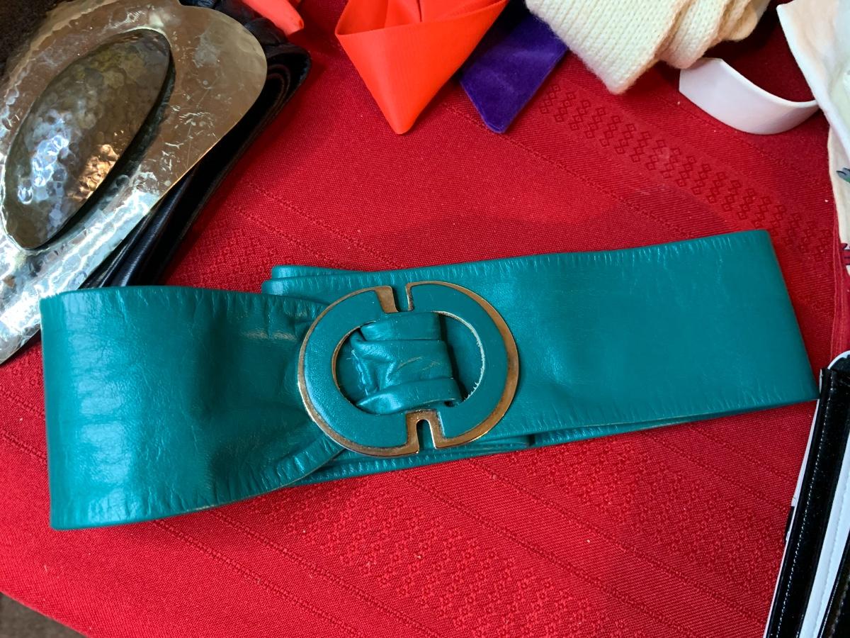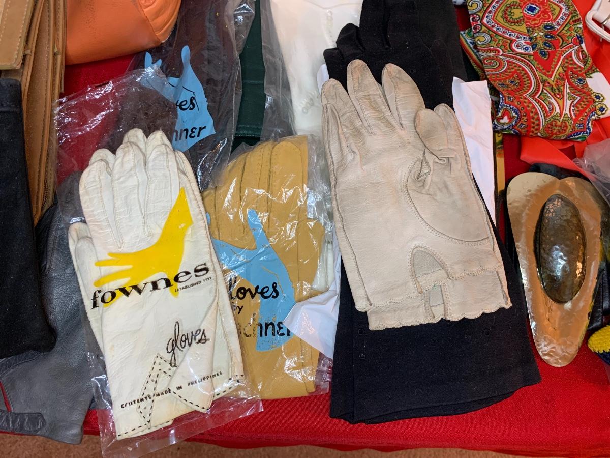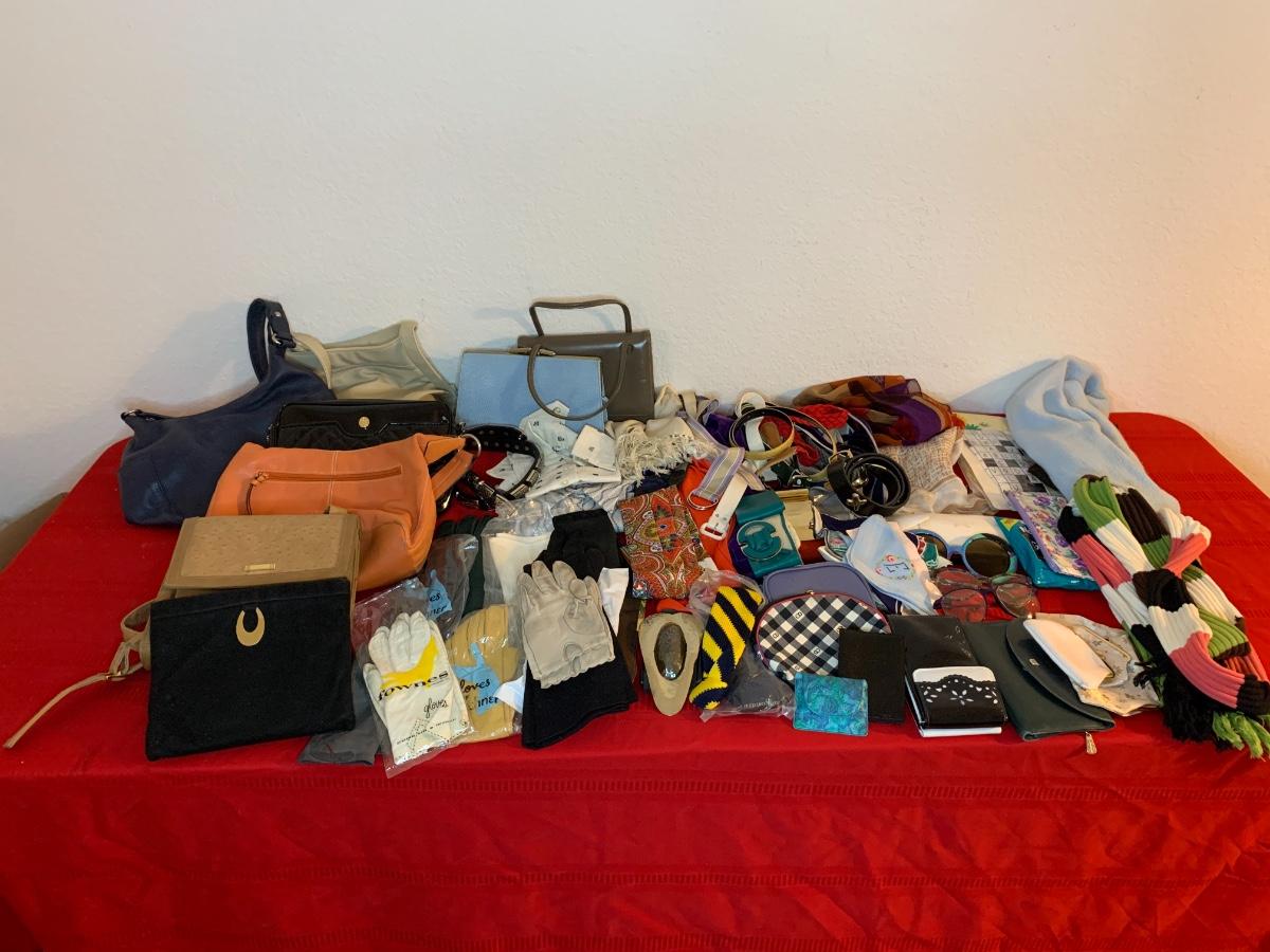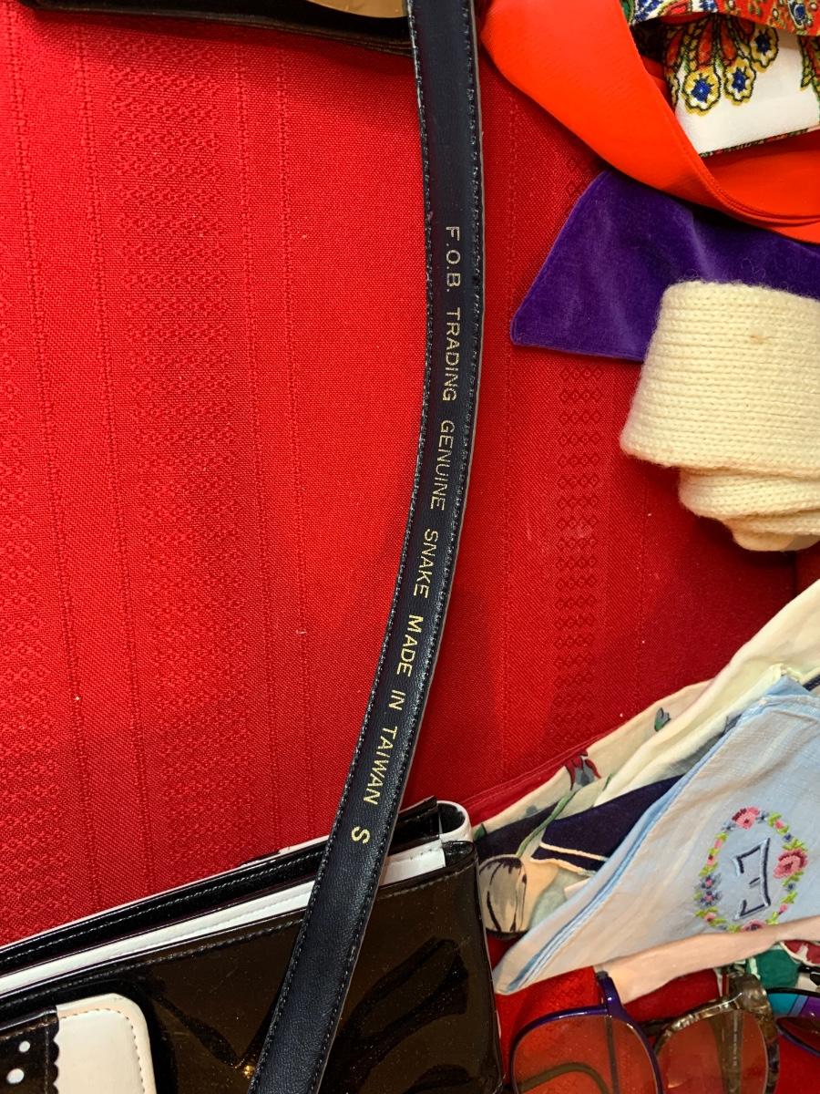 Lot full of accessories including vintage belts (smaller waist), purses and hand bags, gloves, hankies, scarves, makeup pouches, dickies, Fuilio Pucci glasses, Dolce and Gabbana prescription glasses with bifocal. Snake belt by Cignal.