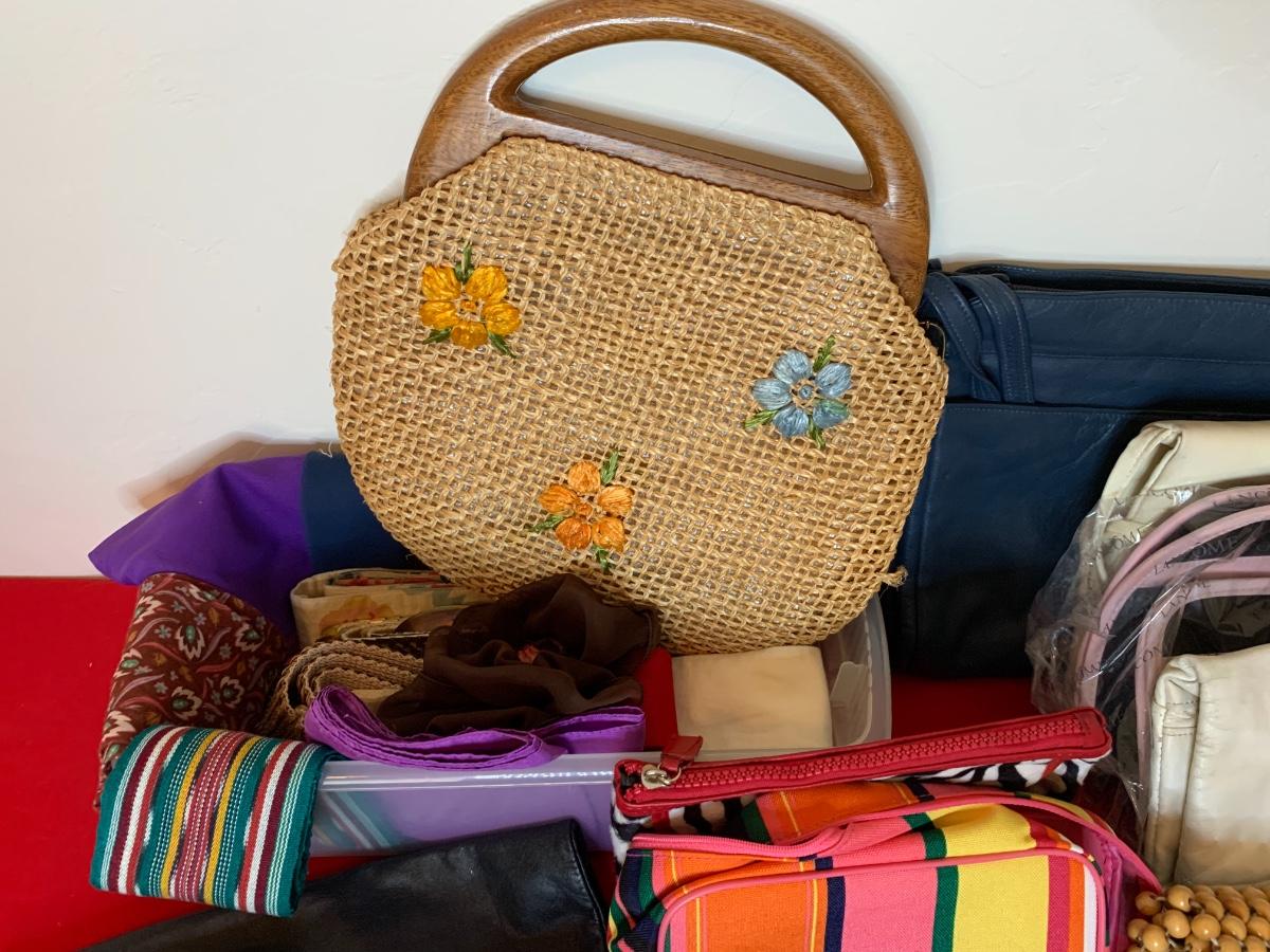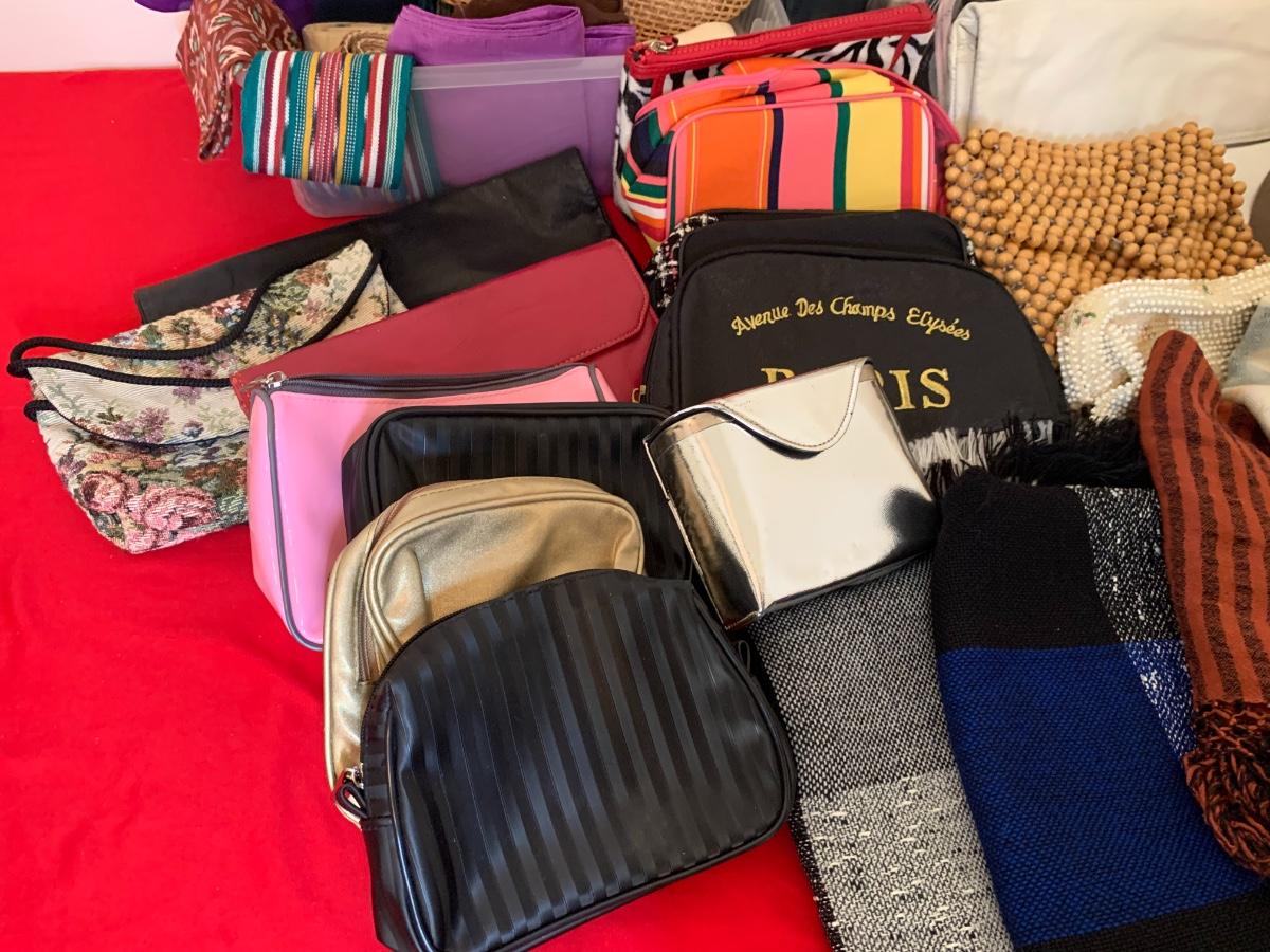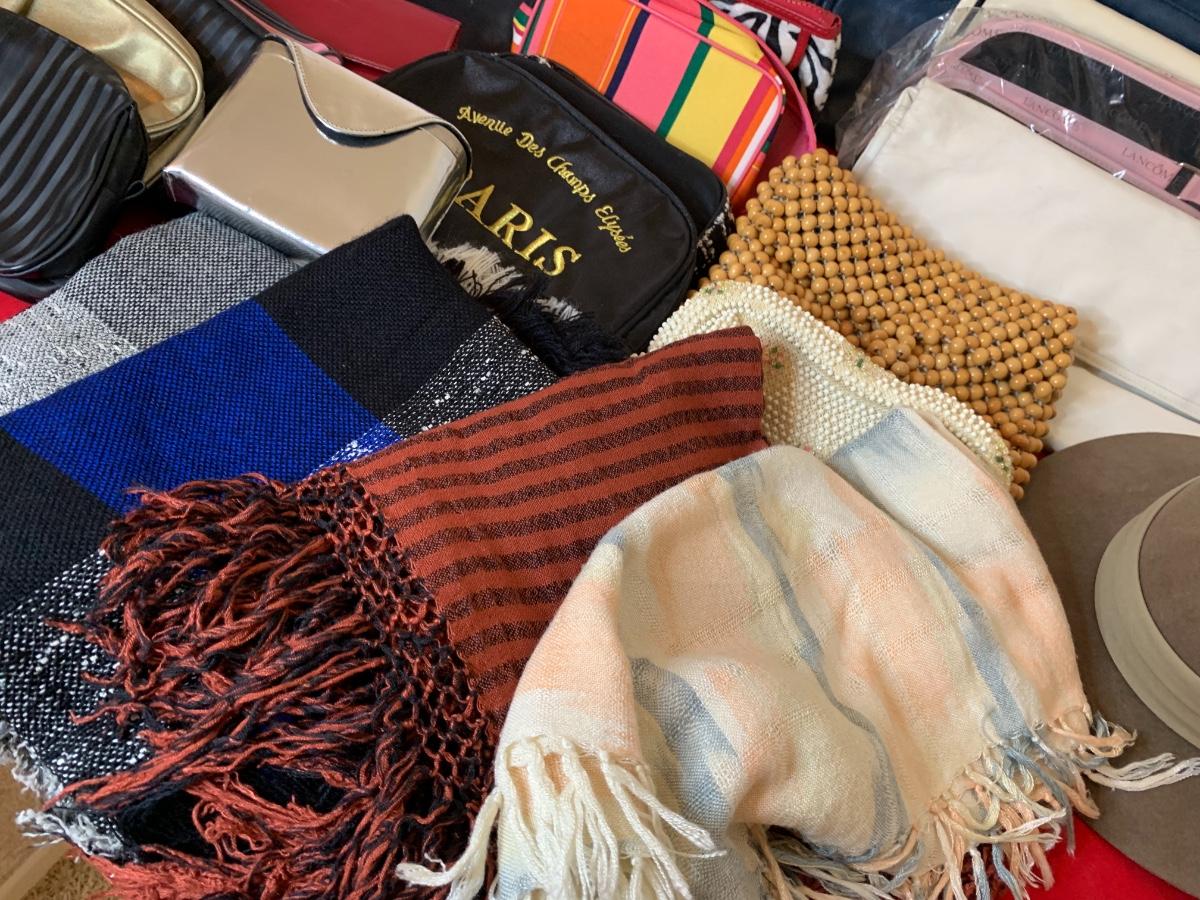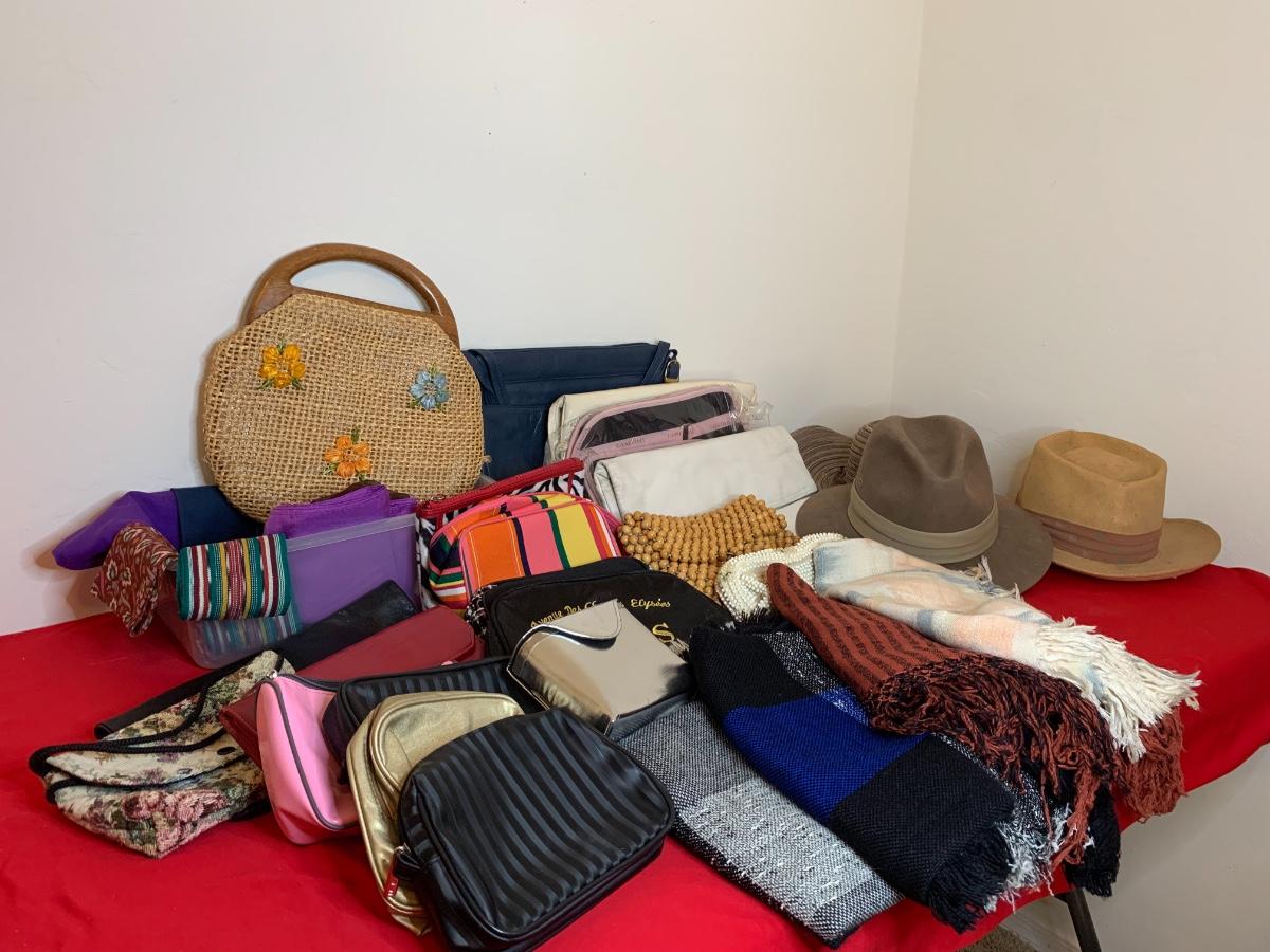 Lot includes 3 hats (one has hole), fabric belts, hair clips, make up bags, 4 pashmina style wraps and some vintage purses (the wood beaded one needs repair.)