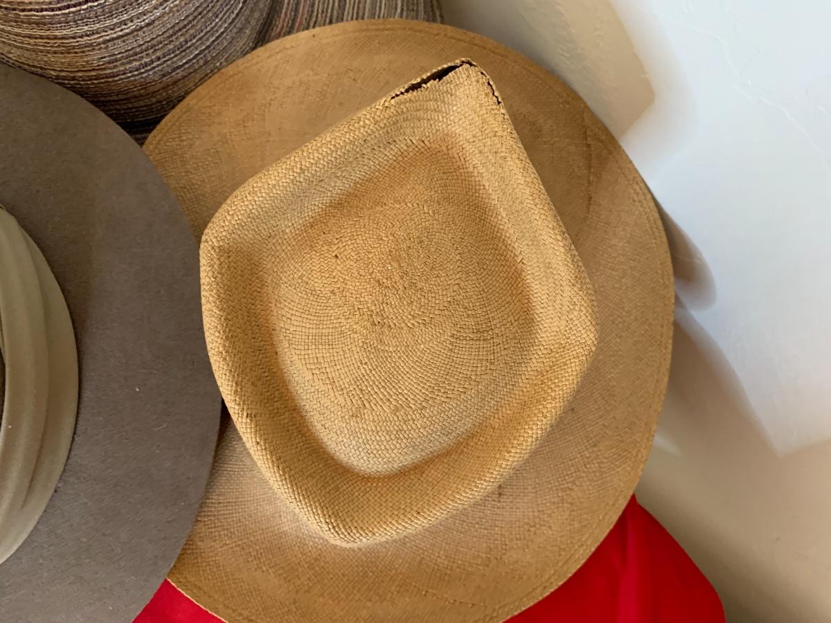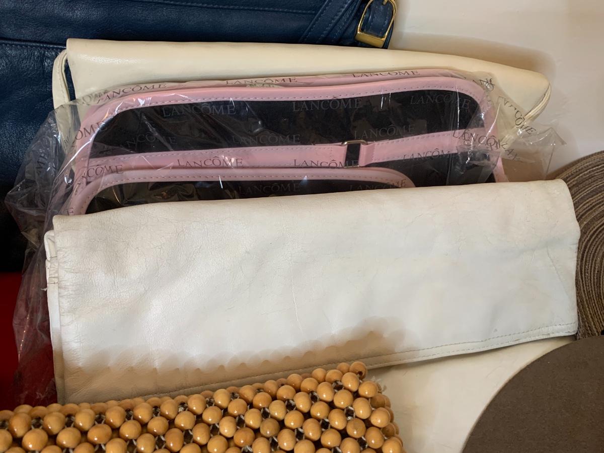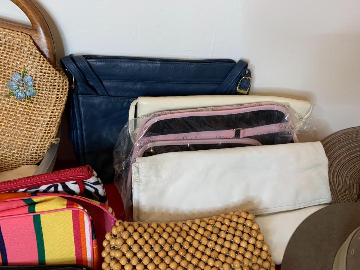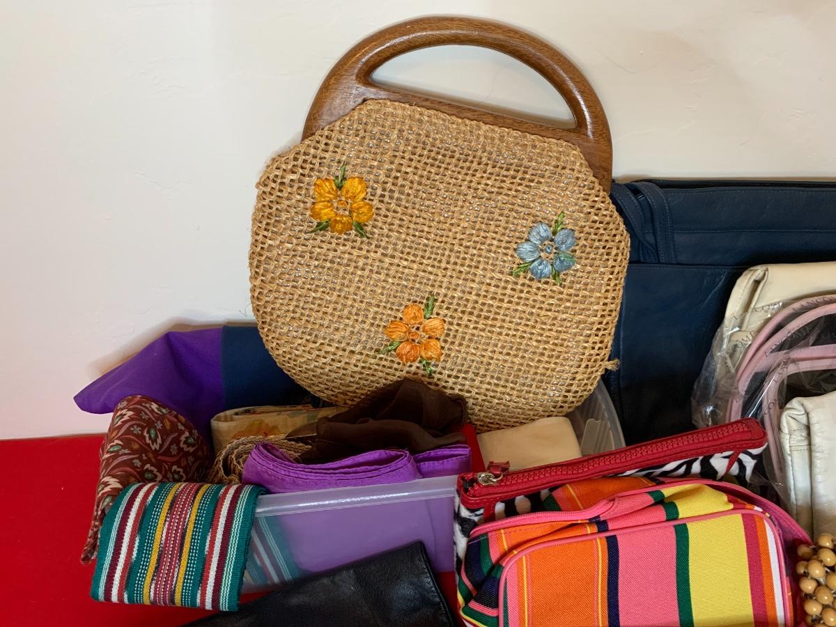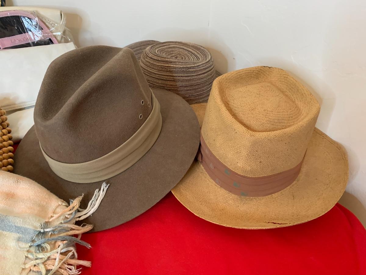Lot includes 3 hats (one has hole), fabric belts, hair clips, make up bags, 4 pashmina style wraps and some vintage purses (the wood beaded one needs repair.)
