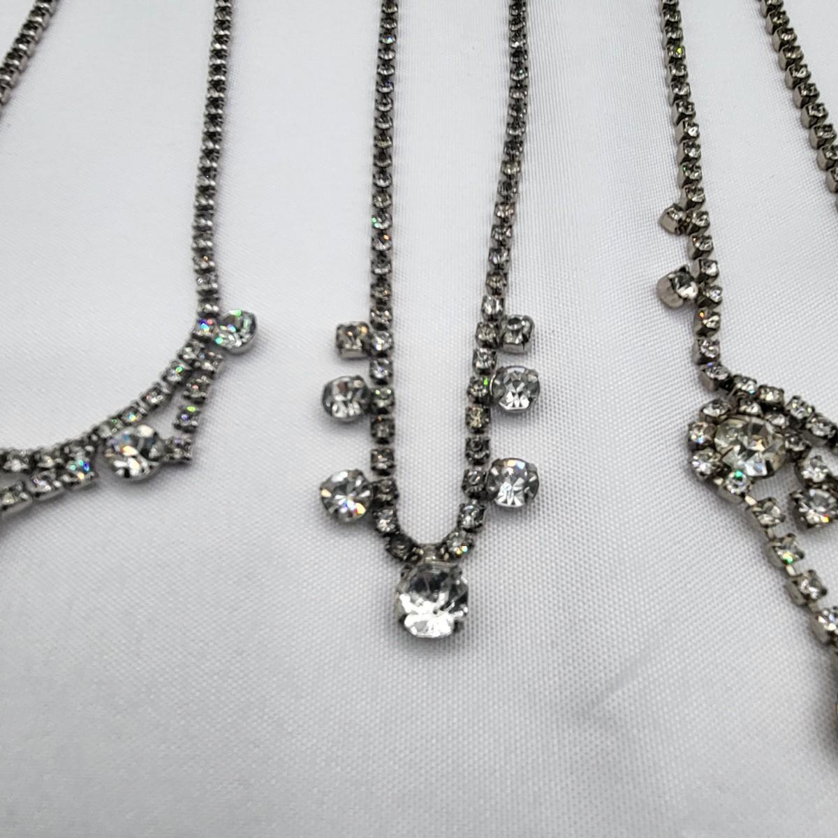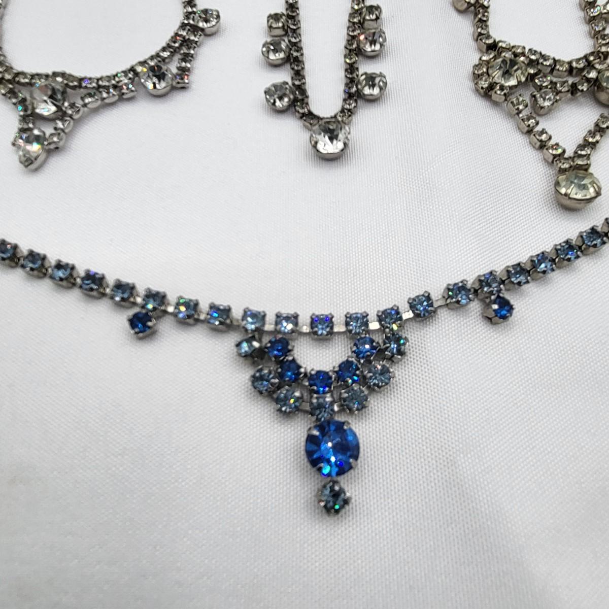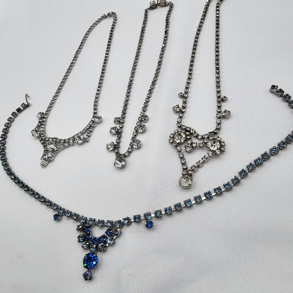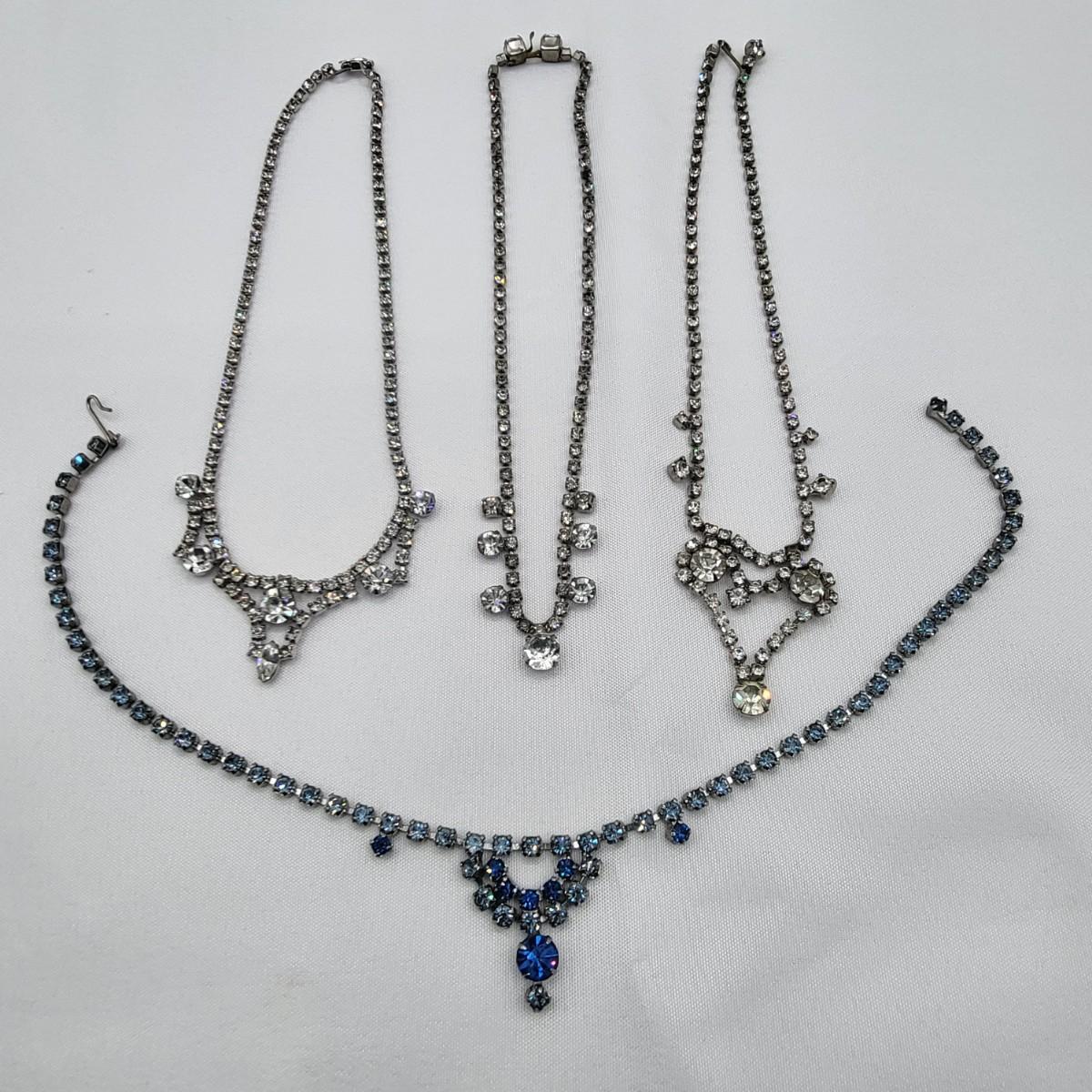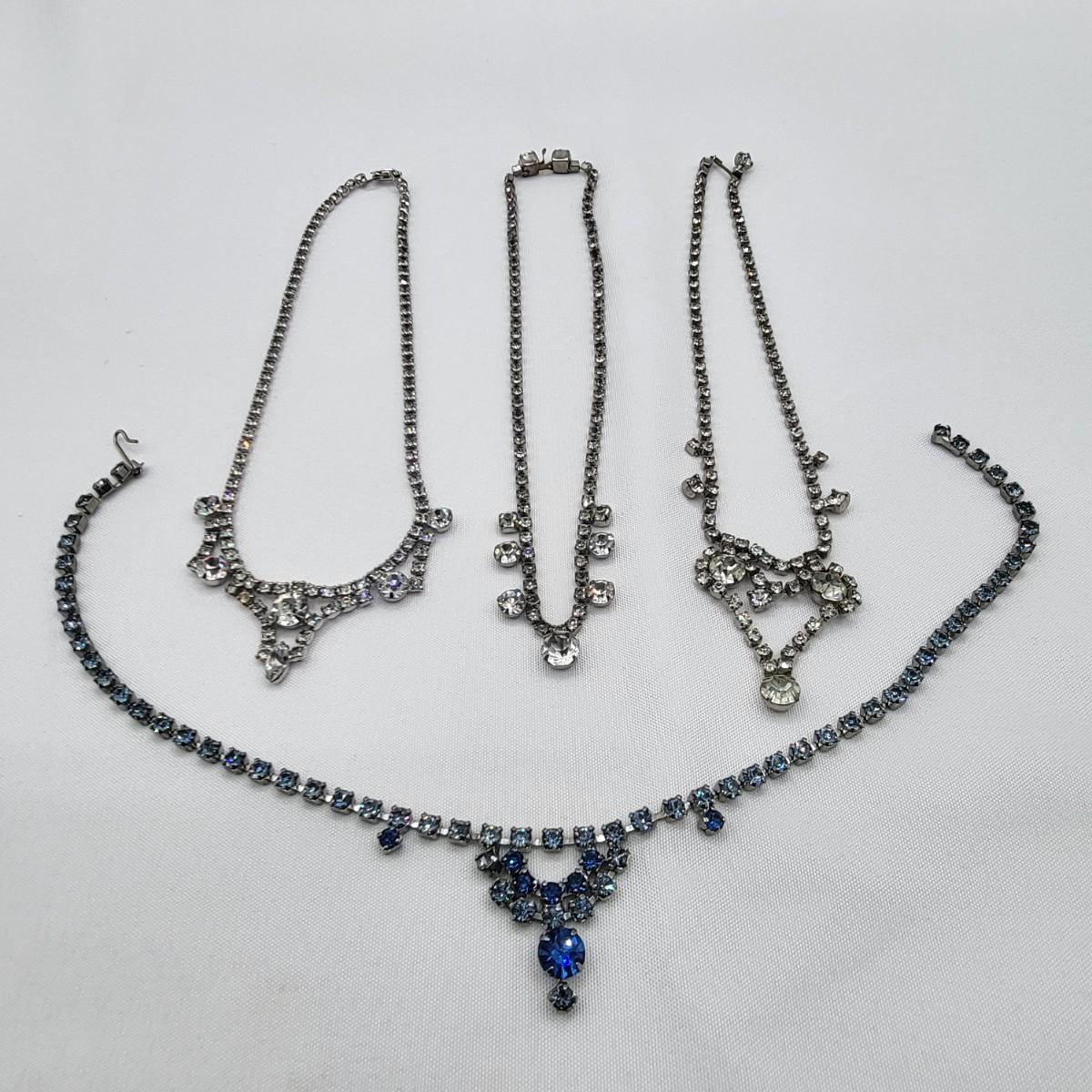 Four 1950's vintage choker length rhinestone necklaces. Three are clear rhinestone one is two-tone blue rhinestone. They measure 14" long (you could easily add an extender if you need additional length). All stones appear to be intact. A couple may show slight discoloration but all still hold a good amount of sparkly bling!