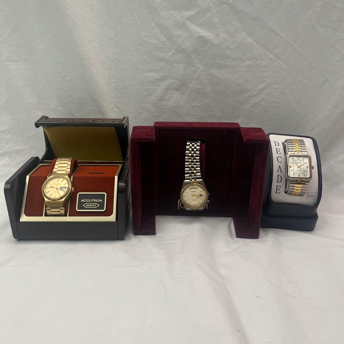 Lot includes a Bulova Accutron in original box, Fortron in original box, Decade in original box, a Seiko watch, a Sassoon watch and an unmarked watch with black leather band. All watches were not running as it appears they need new batteries.