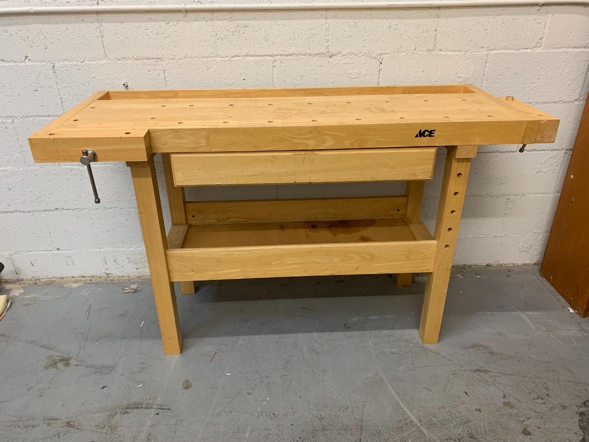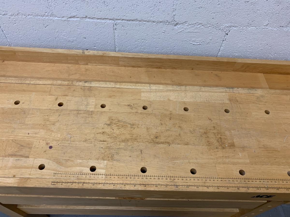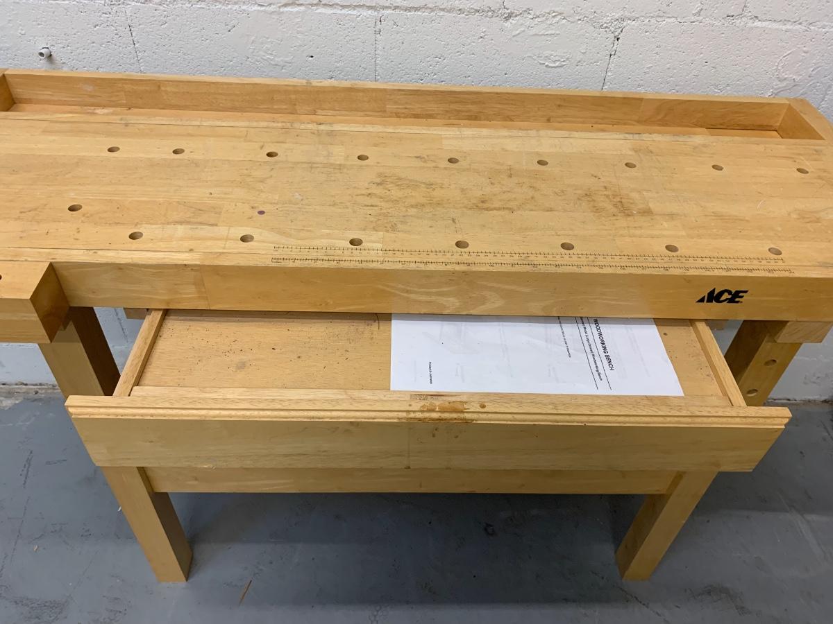 Ace hardware work bench with drawer. In good condition with some normal ware. (57 1/2 inches in length, 20 inches in depth, 34 inches in height)