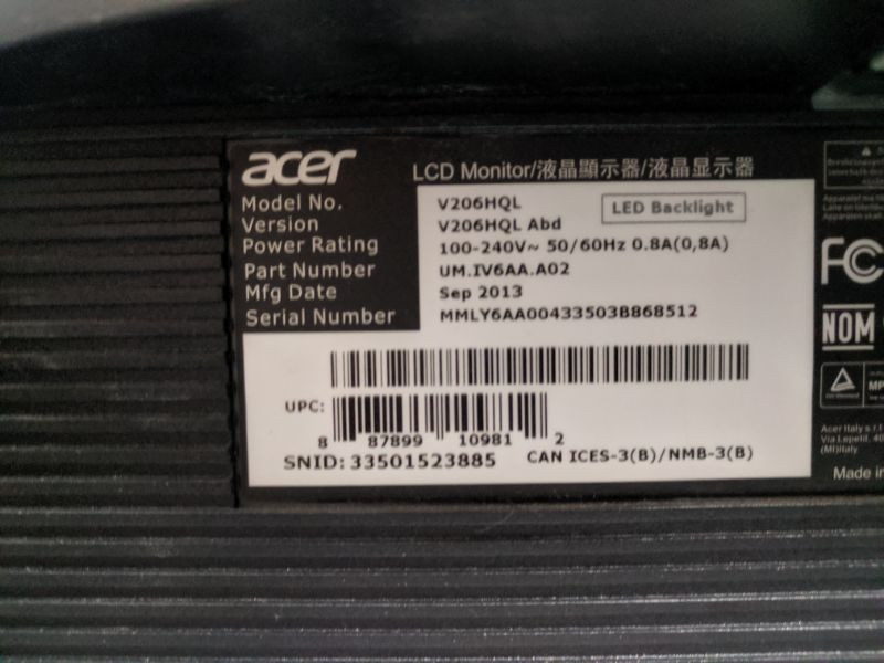 Acer V206HQL Monitor with Power and Video Cables