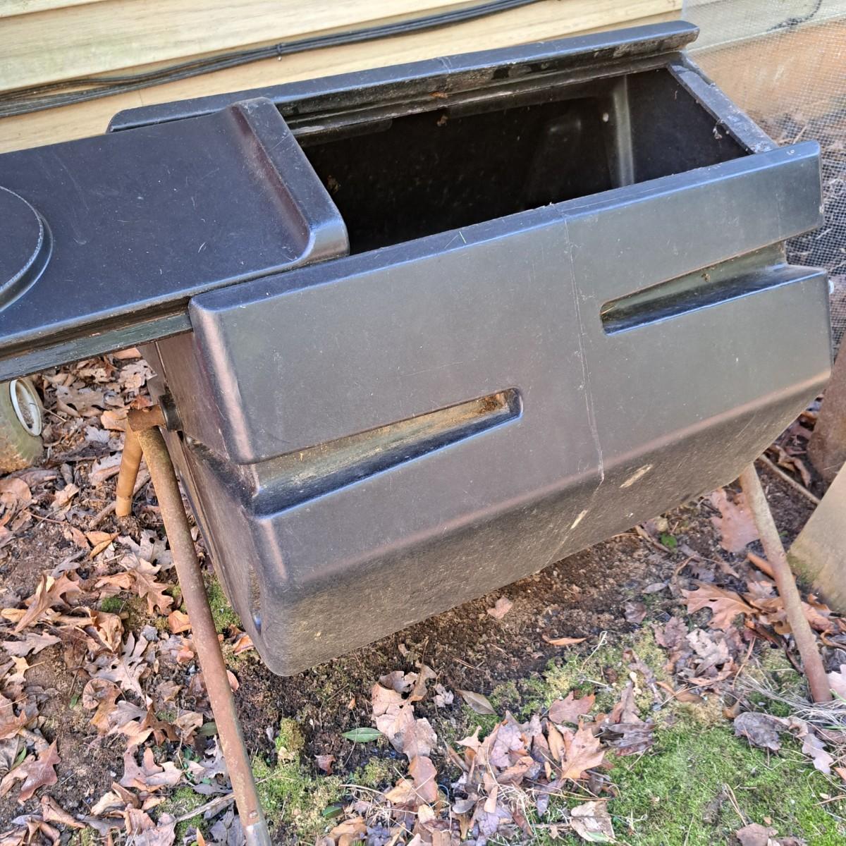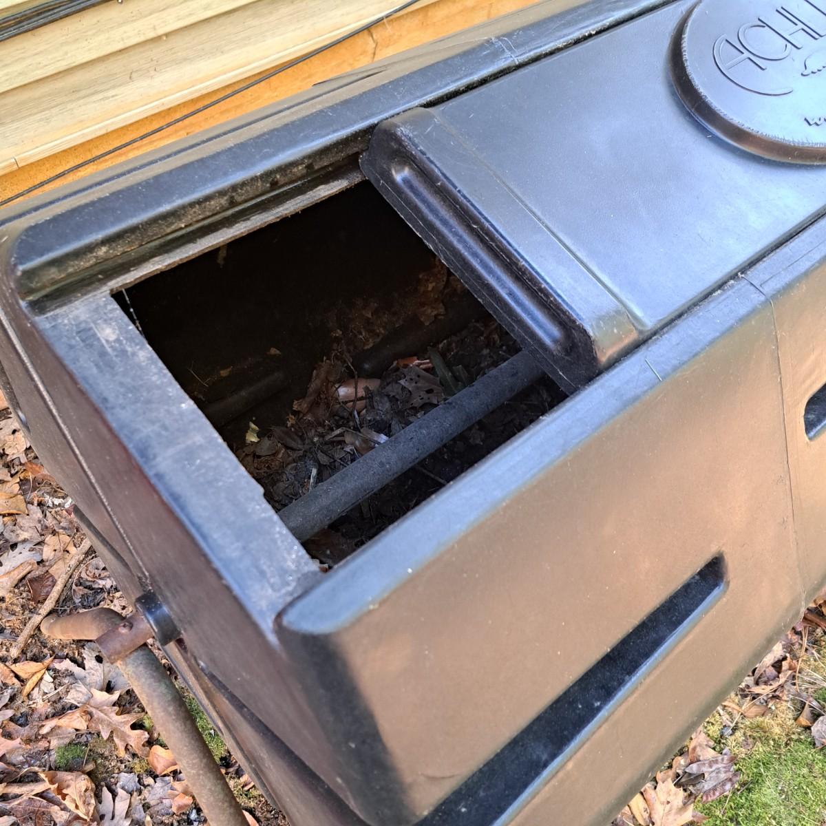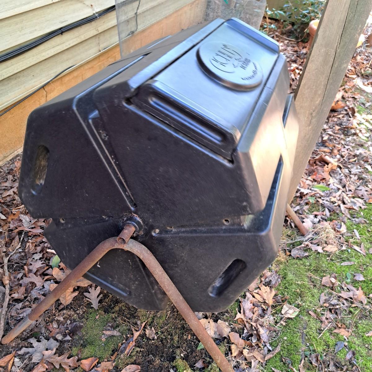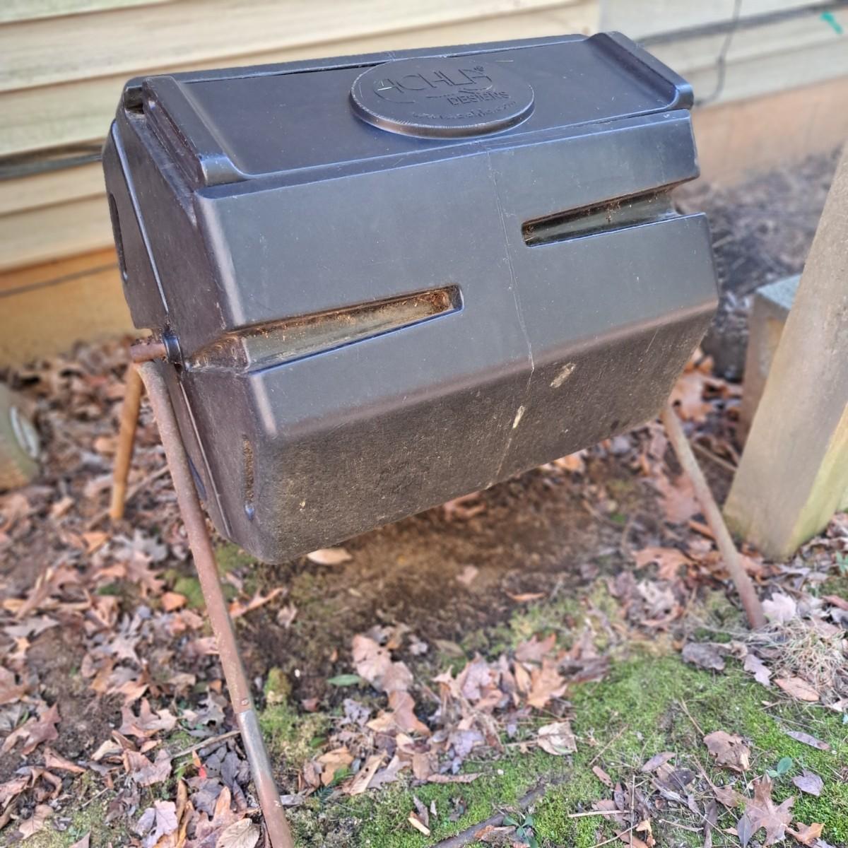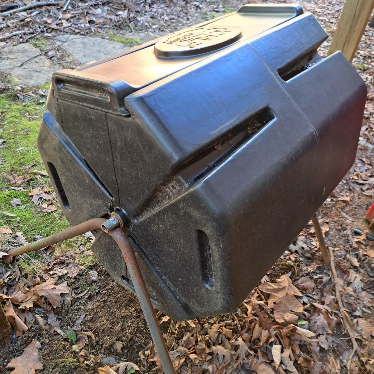 The ACHLA rotating composter is mounted on a metal T-bar stand, 37"H and 27" in length while the black plastic bin itself is 24"D. Handy sliding door on top allows it to be filled at either end. The metal stand has seen some rust as shown, but it rotates and appears to work well - it even comes complete with some starter compost (this can be dumped if not desired)! Local pickup only.