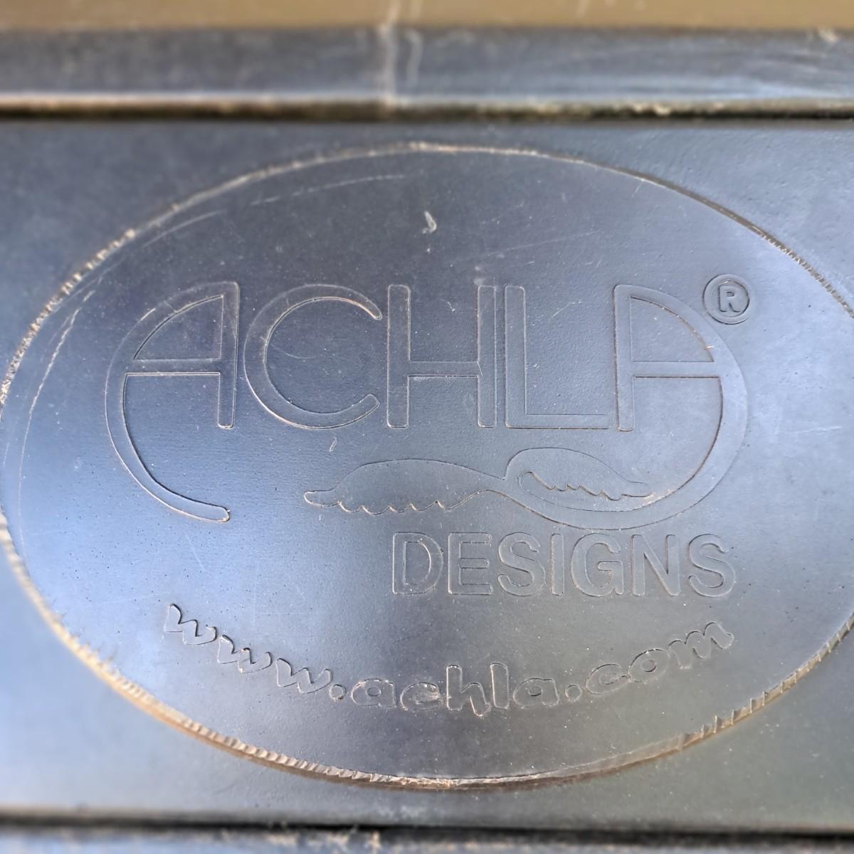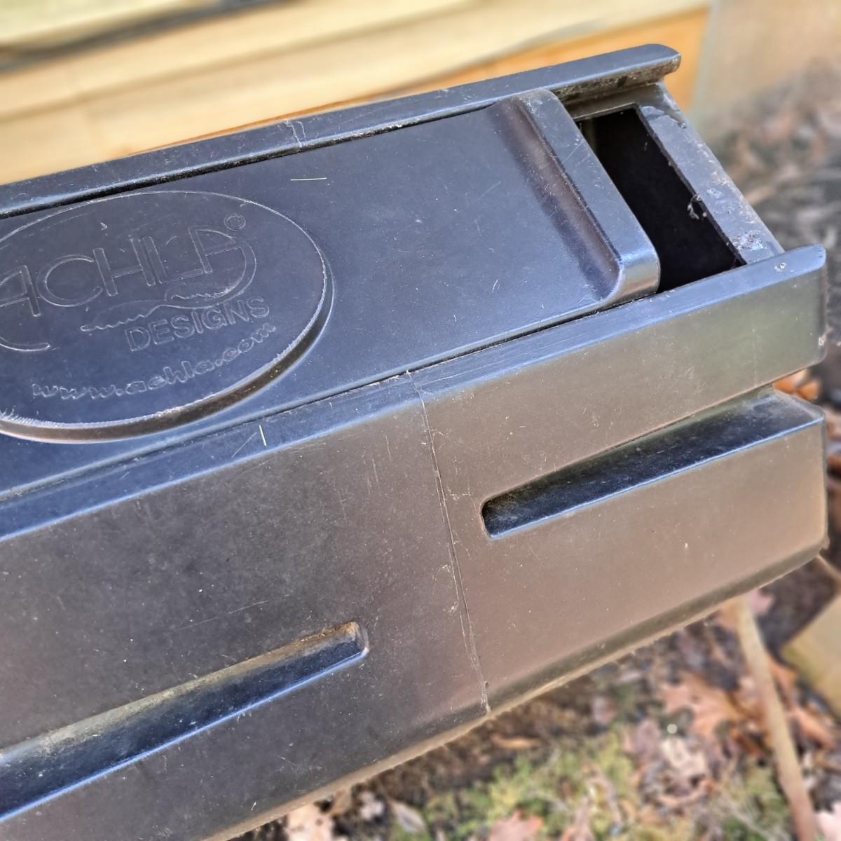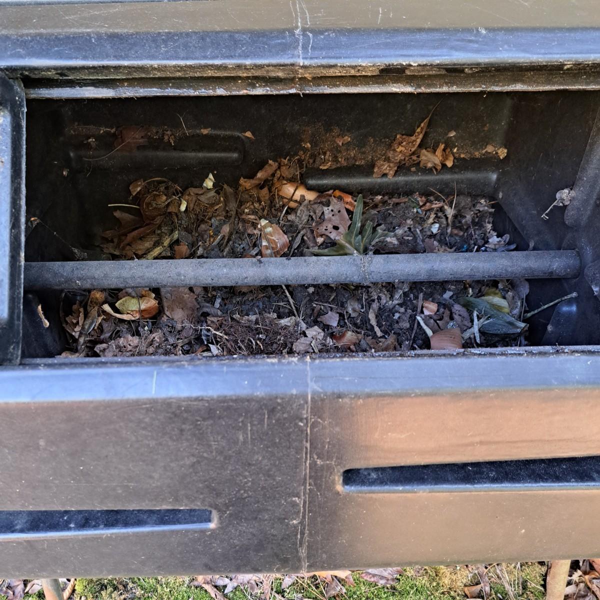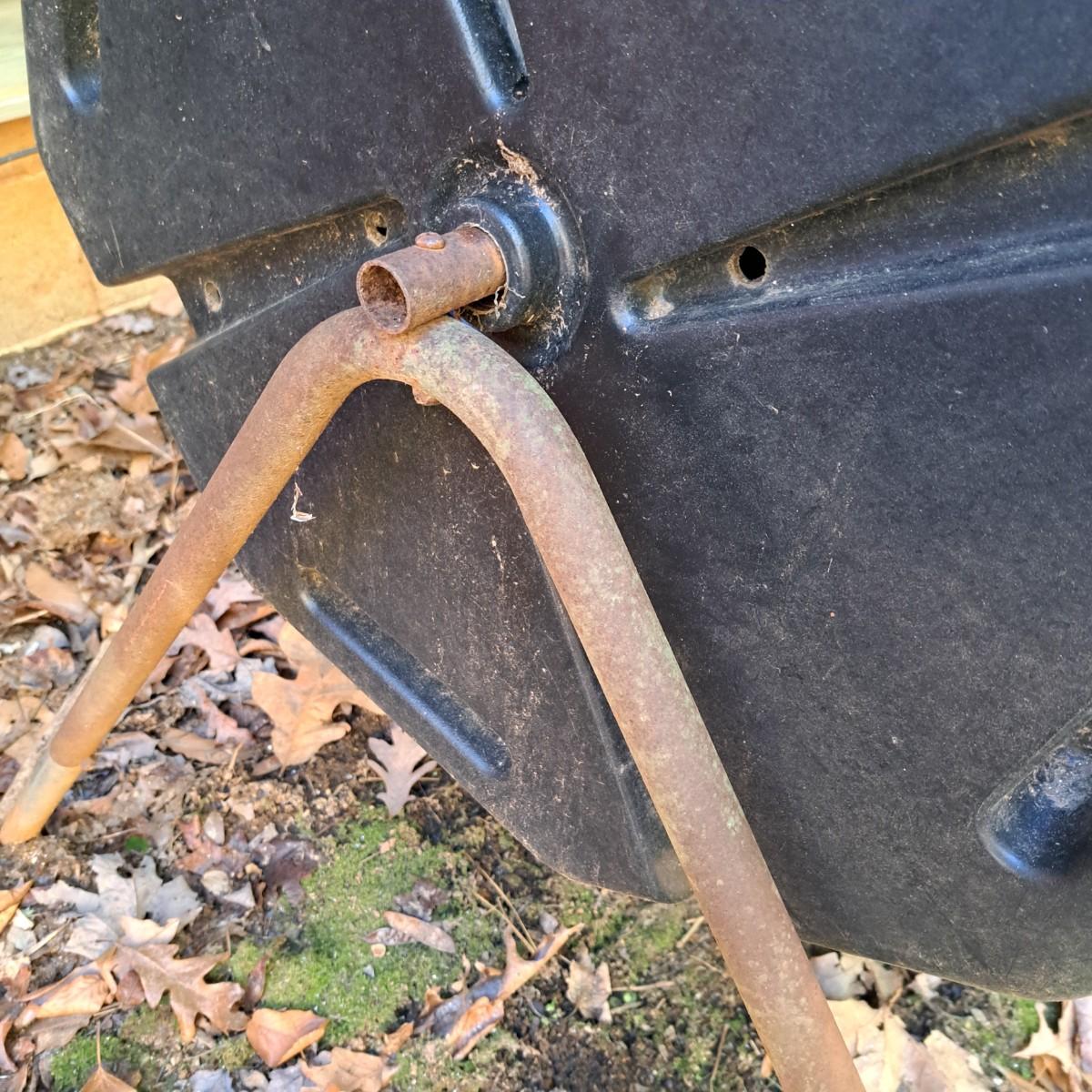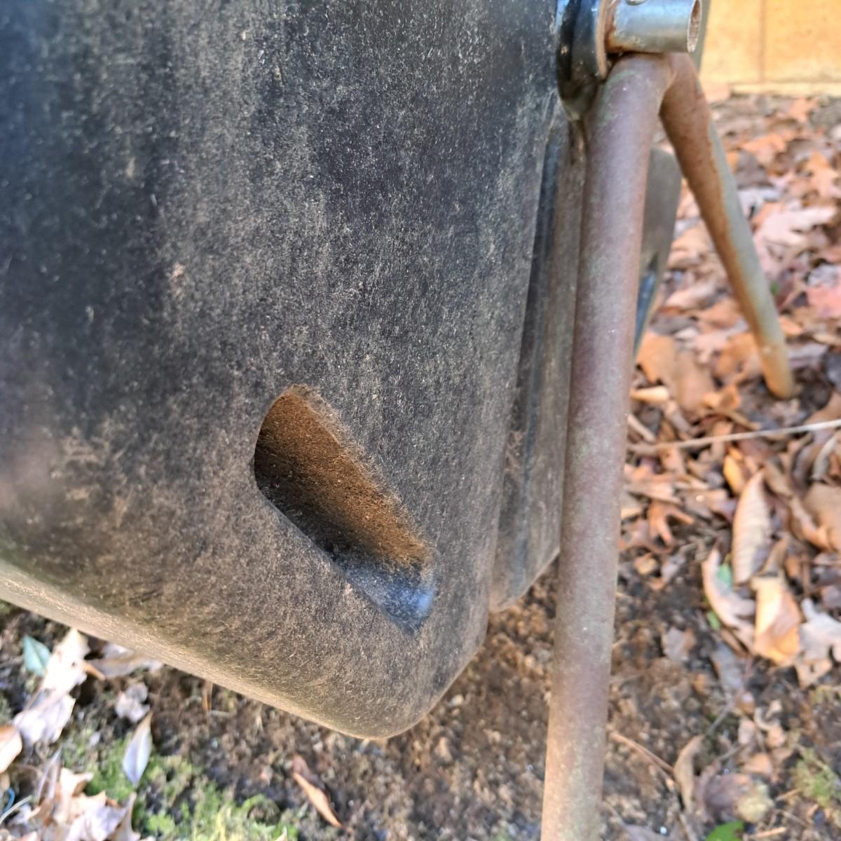 The ACHLA rotating composter is mounted on a metal T-bar stand, 37"H and 27" in length while the black plastic bin itself is 24"D. Handy sliding door on top allows it to be filled at either end. The metal stand has seen some rust as shown, but it rotates and appears to work well - it even comes complete with some starter compost (this can be dumped if not desired)! Local pickup only.