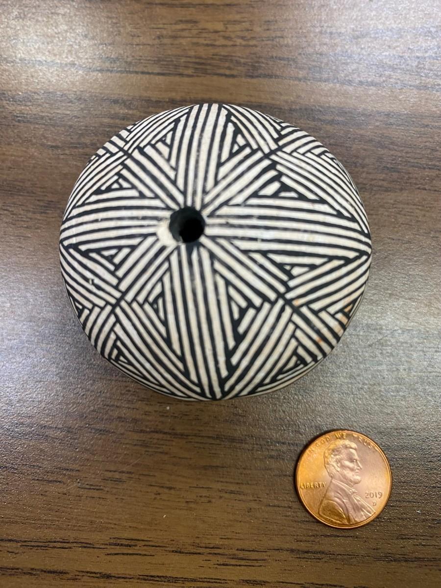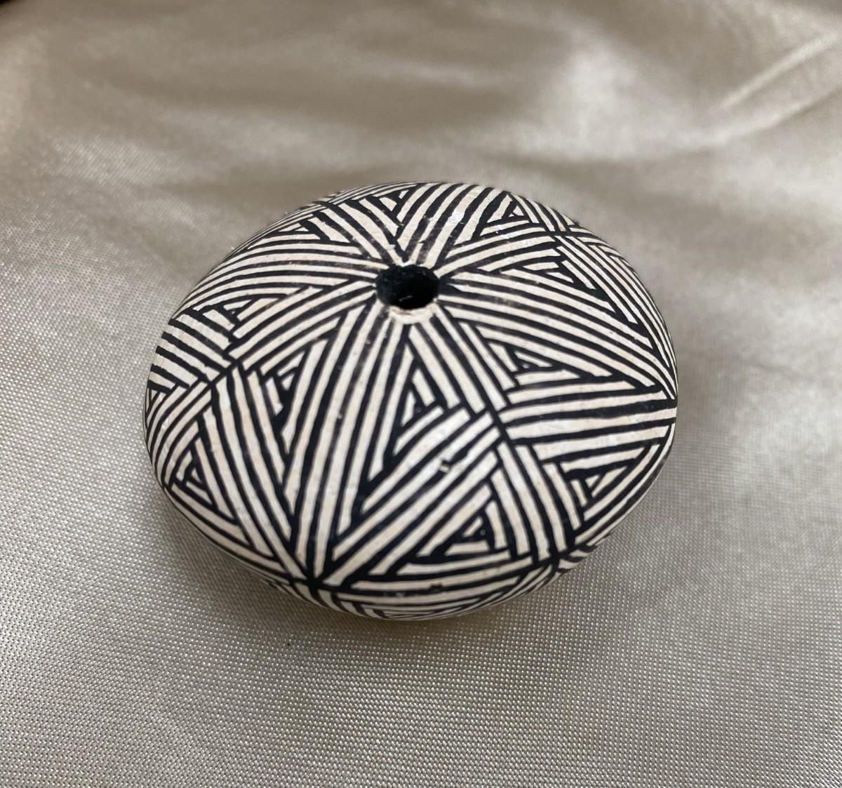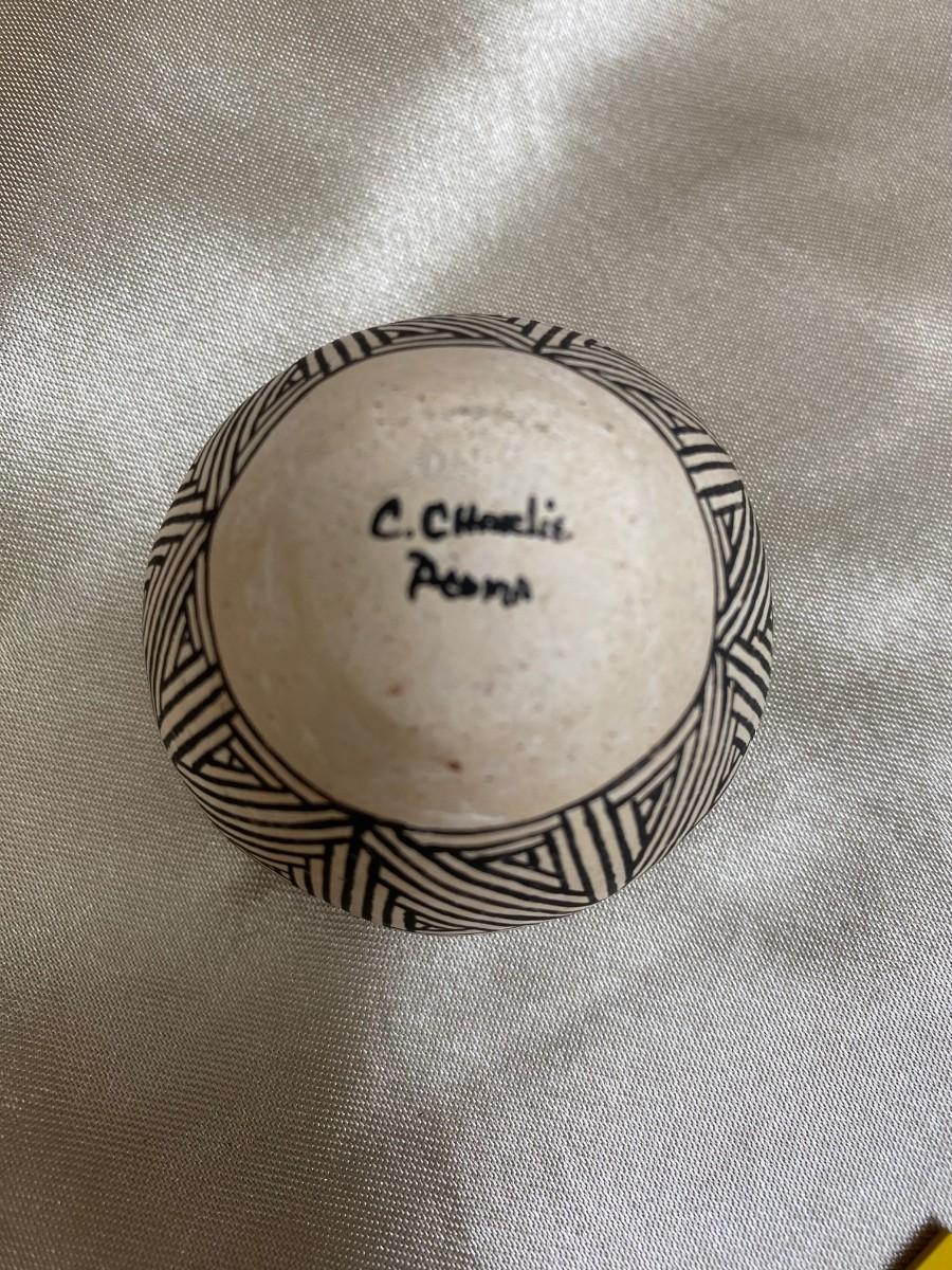 Signed C. Charlie There is a very small chip at the neck of the pot. Hand painted with fine lines representing rain. 2 inch diameter, 1.5 inches tall