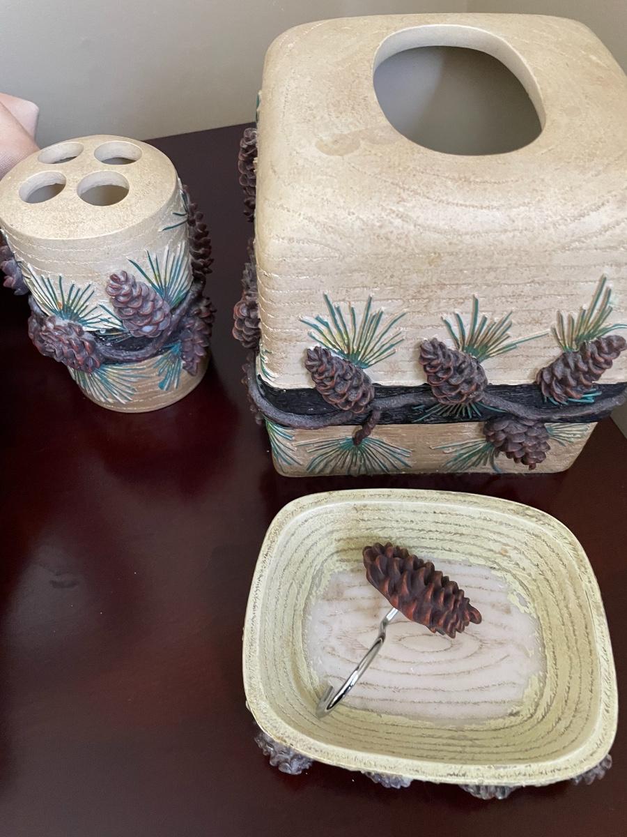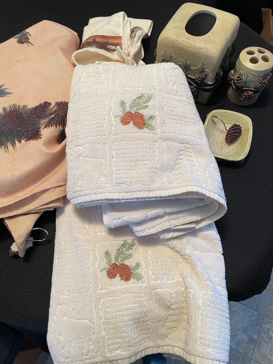 Includes toothbrush holder, Kleenex box cover, dish soap holder, shower curtain and hooks along with towels.