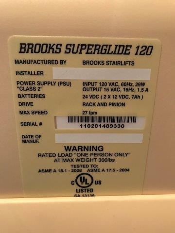 Brooks model Acorn Stairlift with original paperwork and manual. Great condition. Left hand unit with extra long, approximately 17 foot, strait rail. Already removed from stairs. Originally purchased 2014.