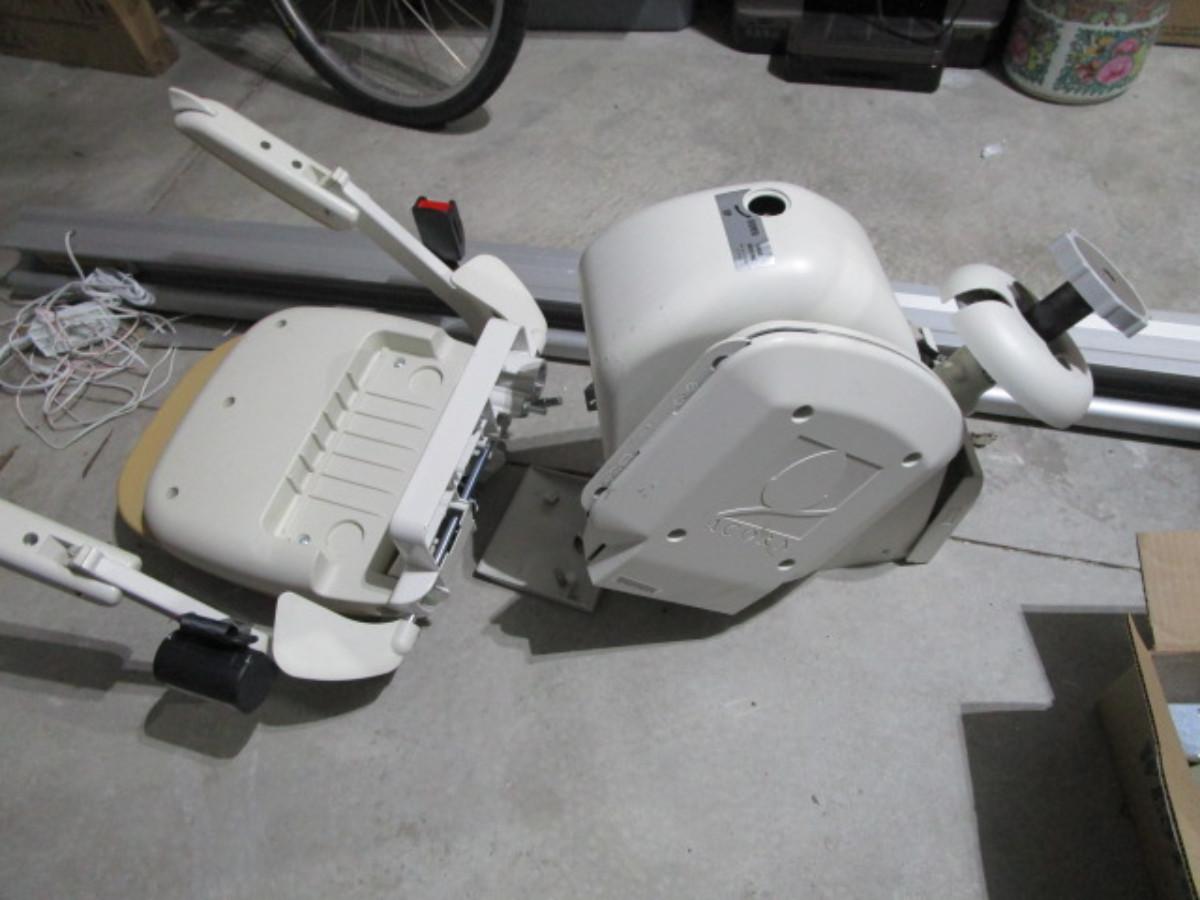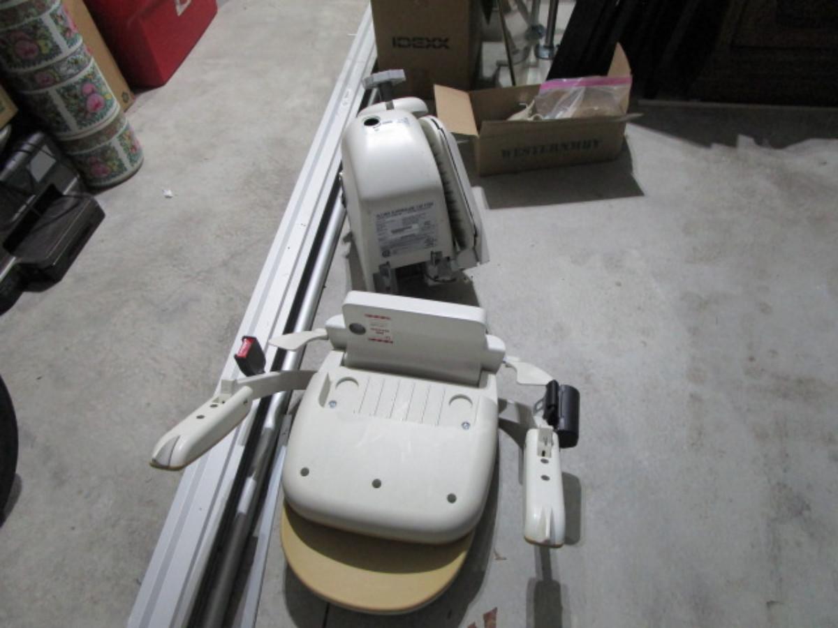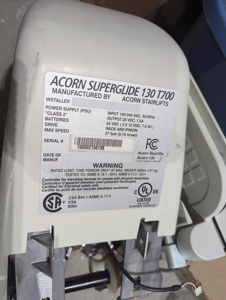14' 10" straight rail, chair is 19" wide x 16" deep. Worked when uninstalled. Suggest having Acorn install. Sells new for $2500.