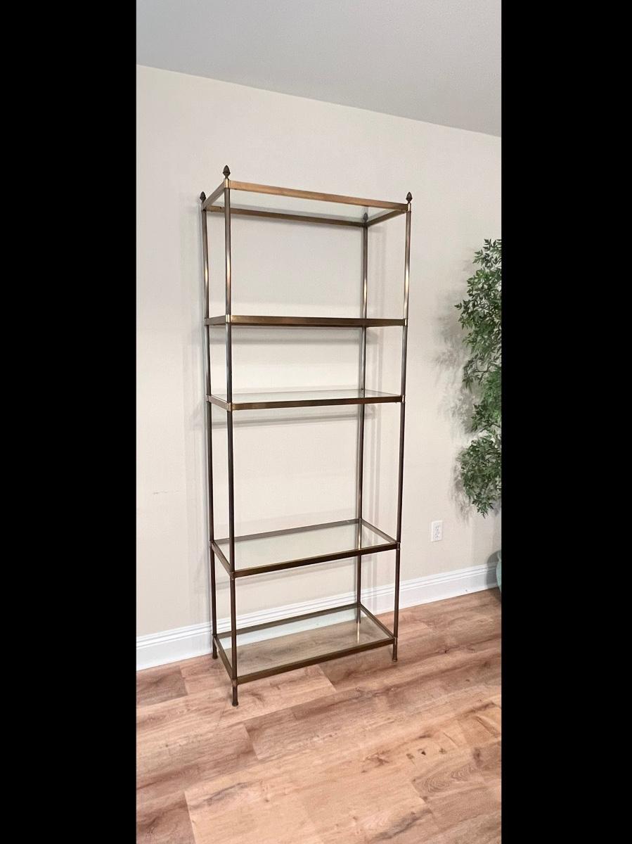 5 Glass Shelves. Normal wear. Minor Surface Scratches on glass. Nothing Major. 77” H x 30” W x 14” D