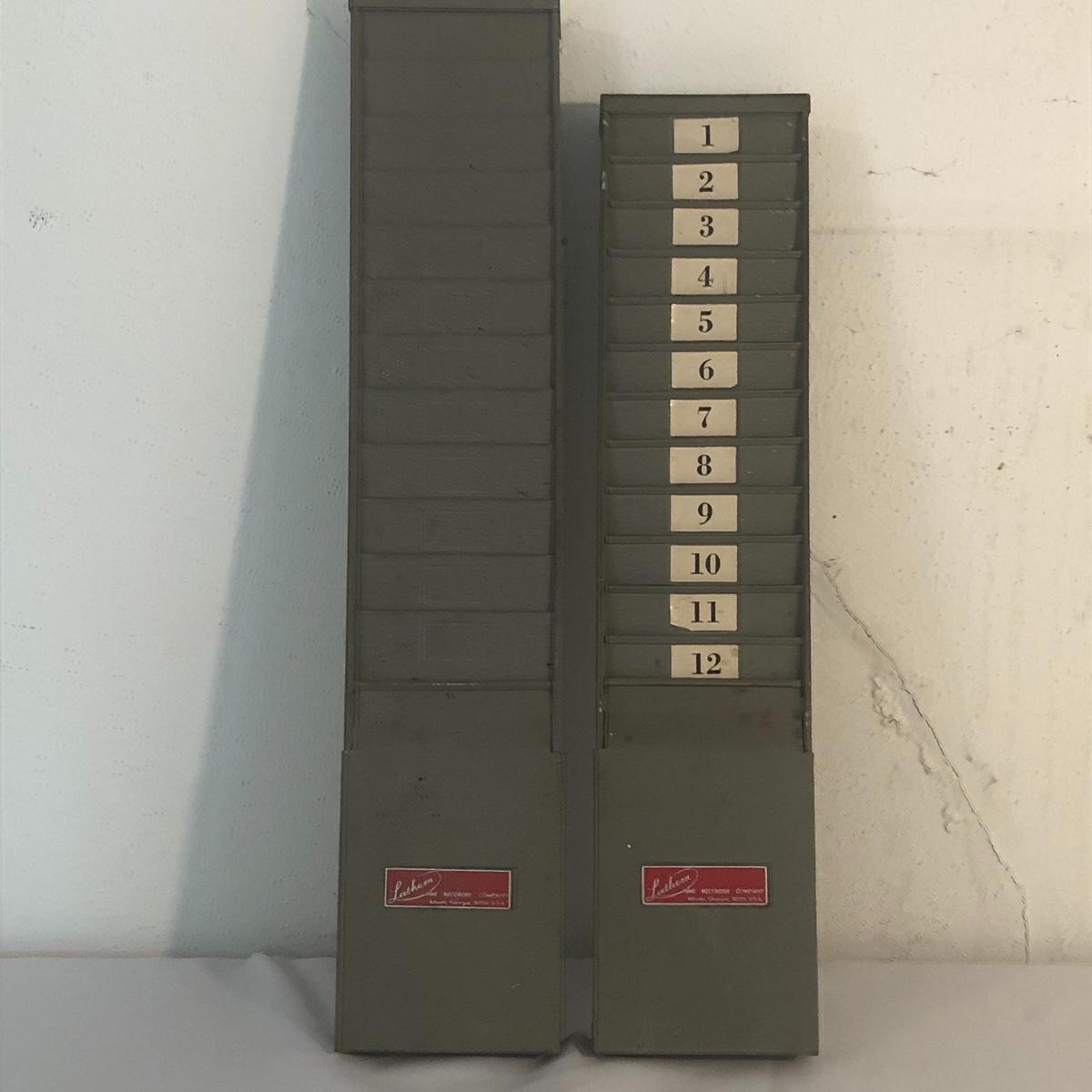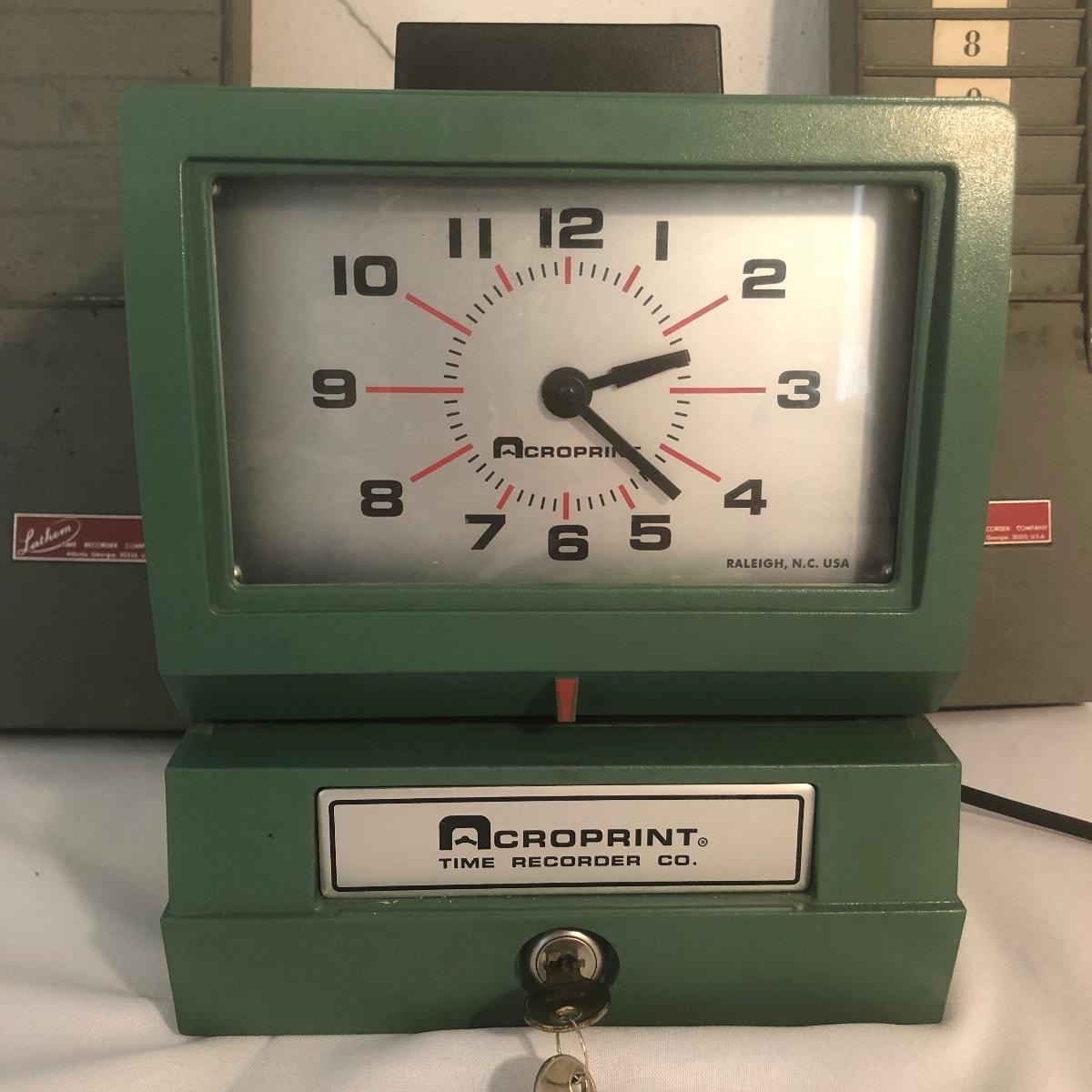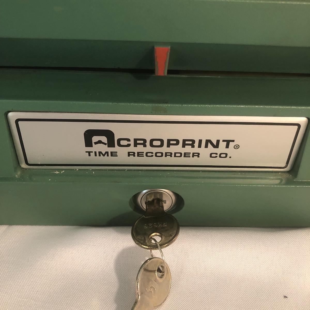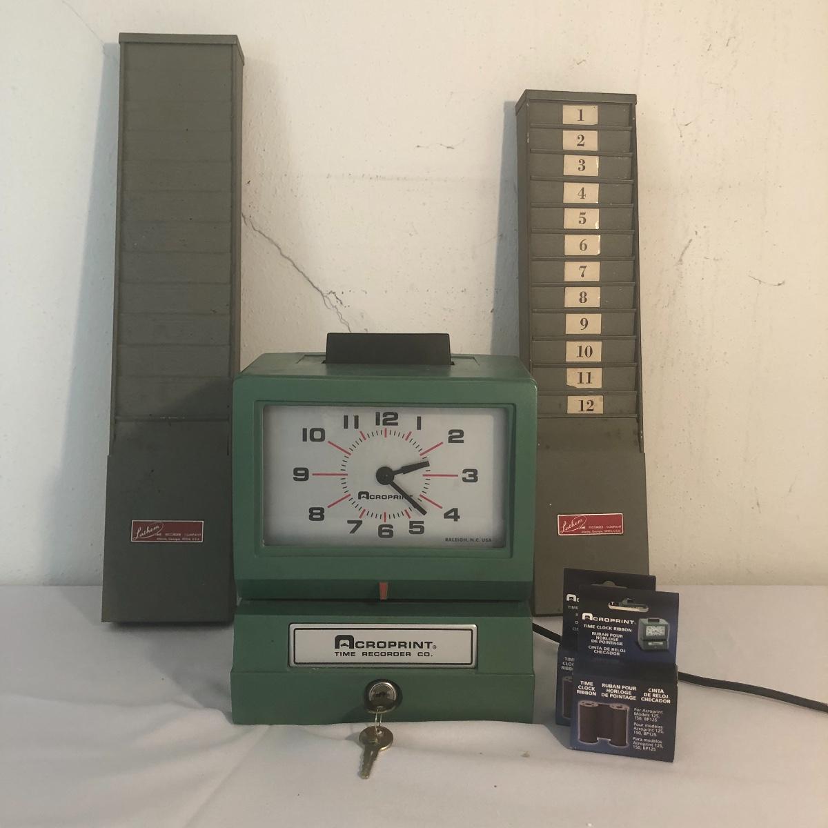 This Acroprint time clock worked when tested and comes with two packs of ribbon ink and two vintage time card slot metal hanging boxes made by Lathem; tallest of these measures 4.5” x 2” x 22”.