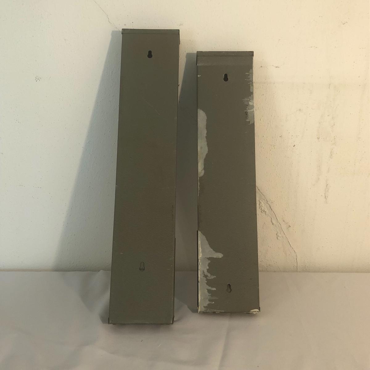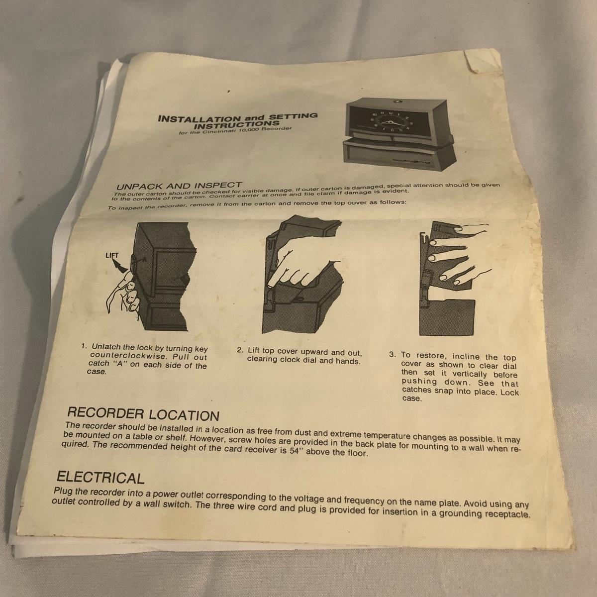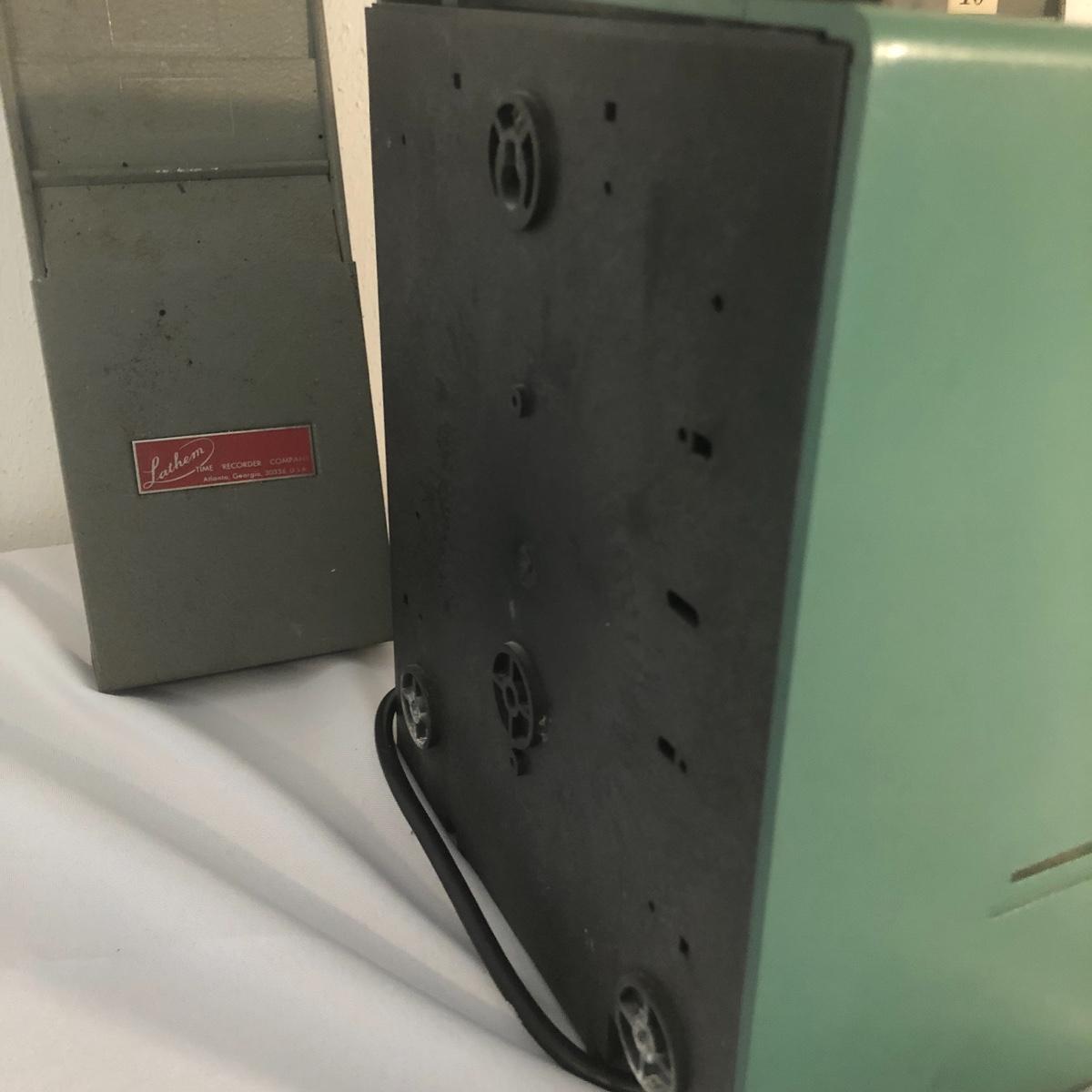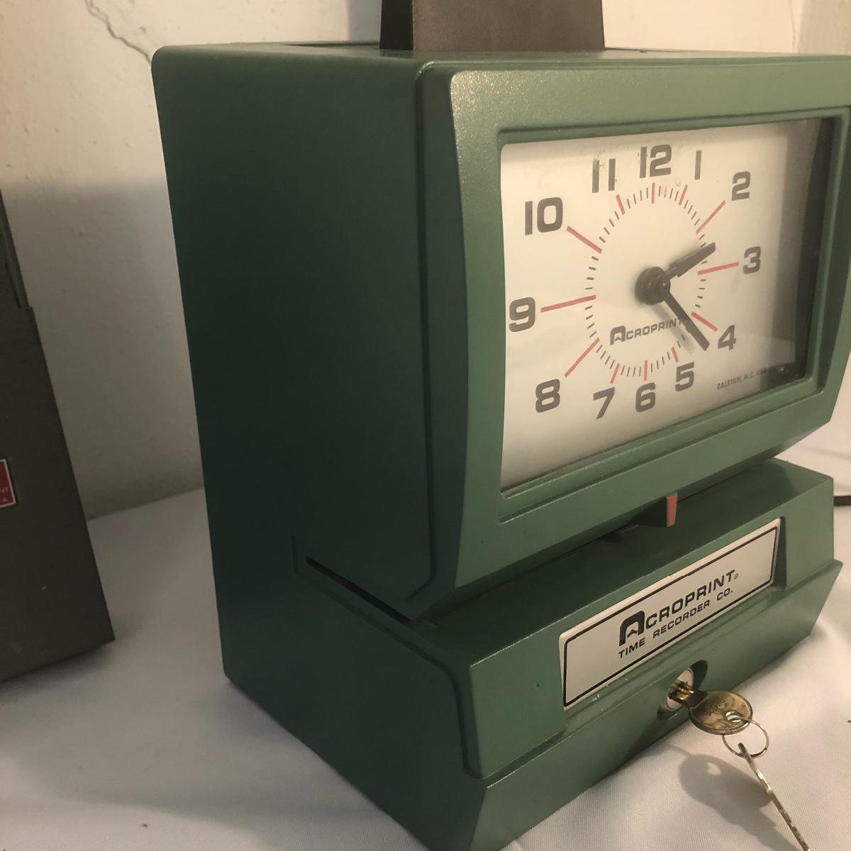 This Acroprint time clock worked when tested and comes with two packs of ribbon ink and two vintage time card slot metal hanging boxes made by Lathem; tallest of these measures 4.5” x 2” x 22”.
