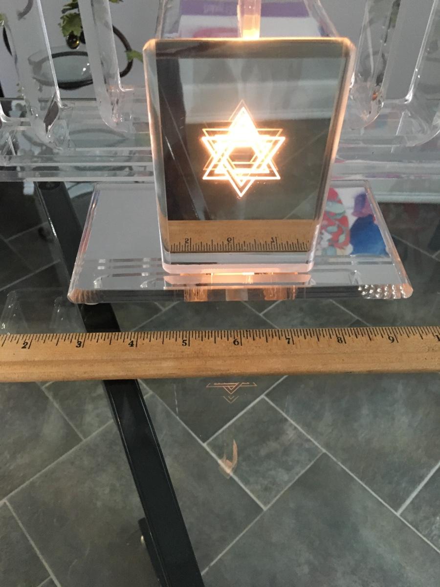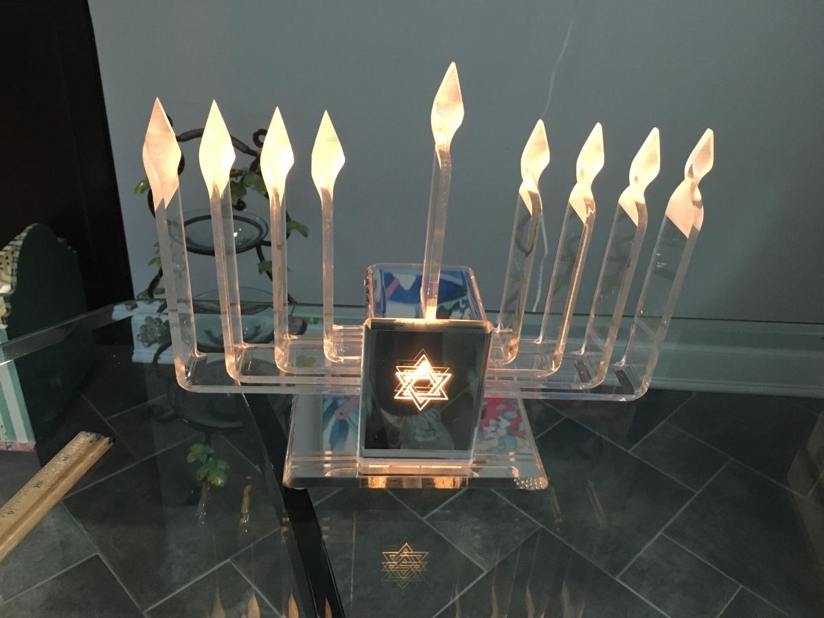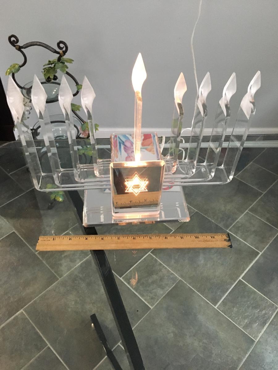on /off switch on cord. Can adjust the number of candles that are lit on back of menorah. Excellent condition.
