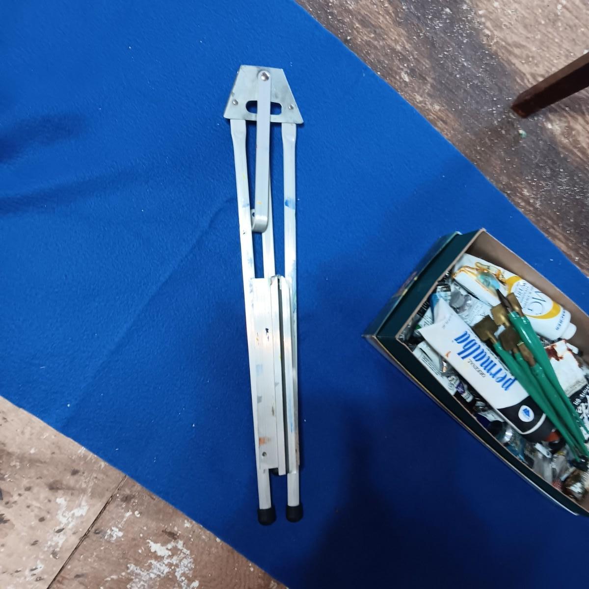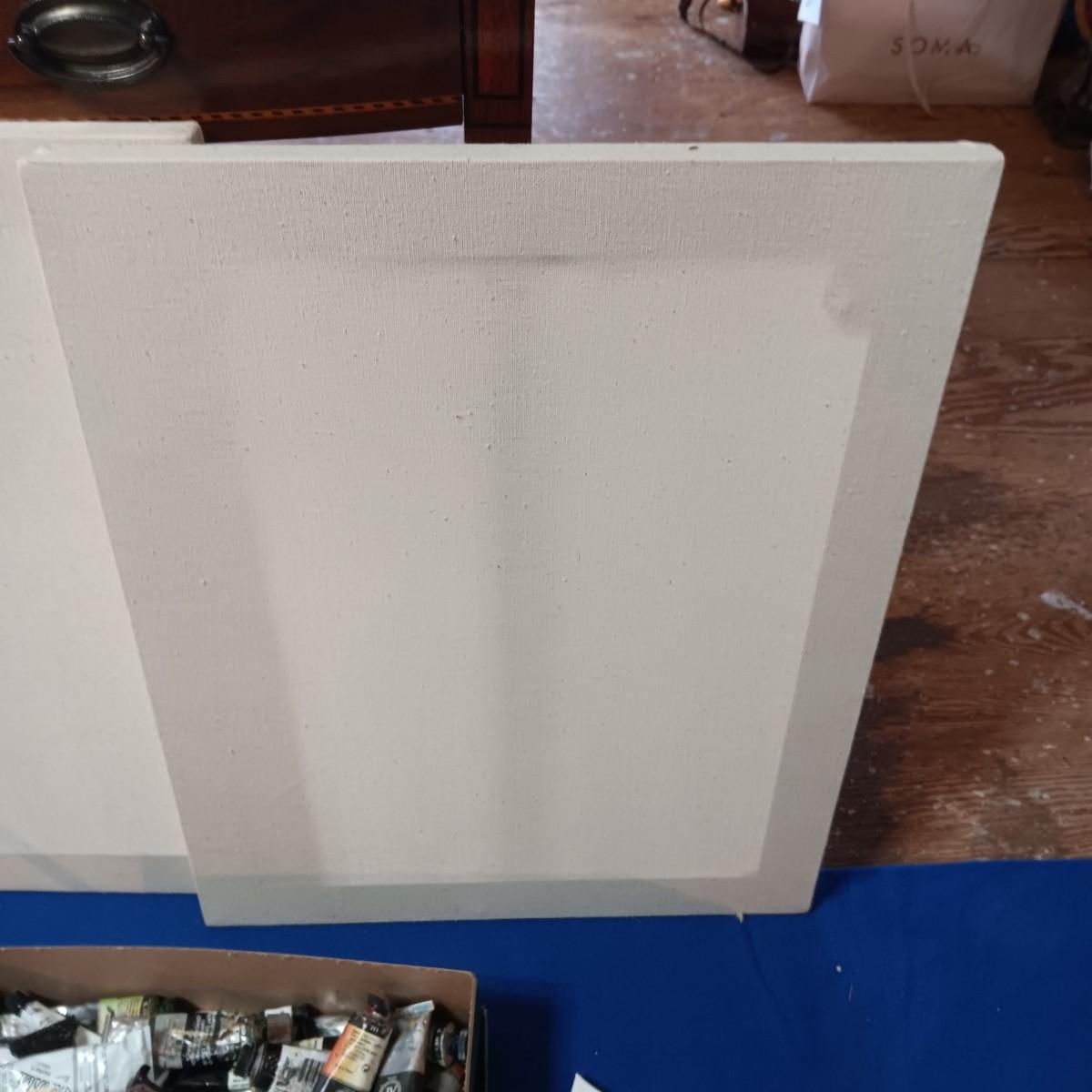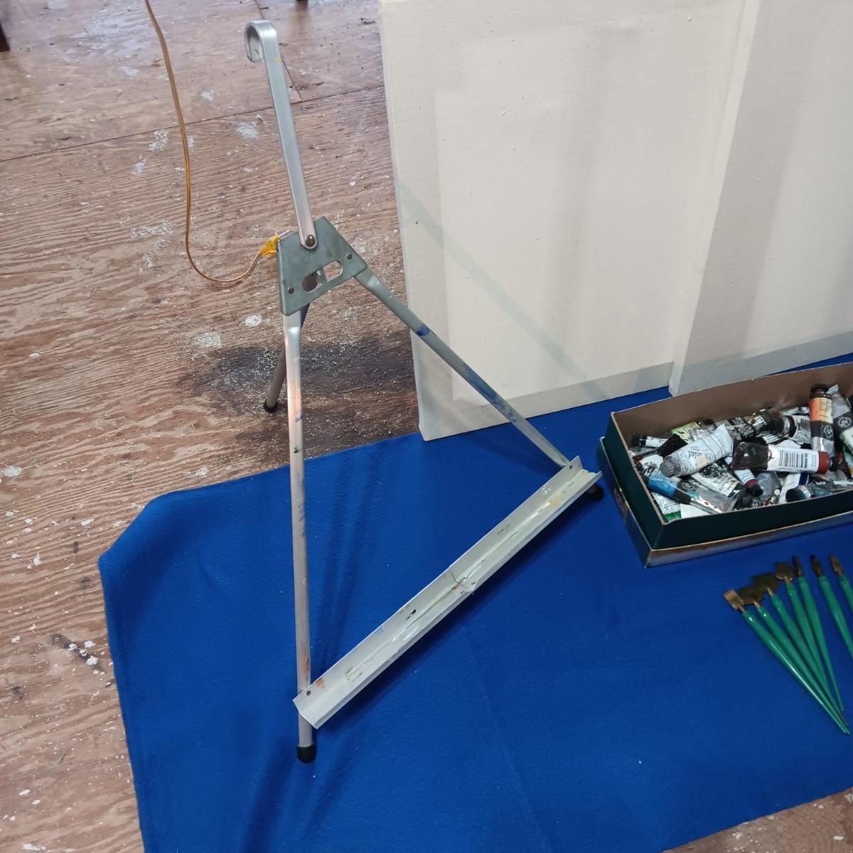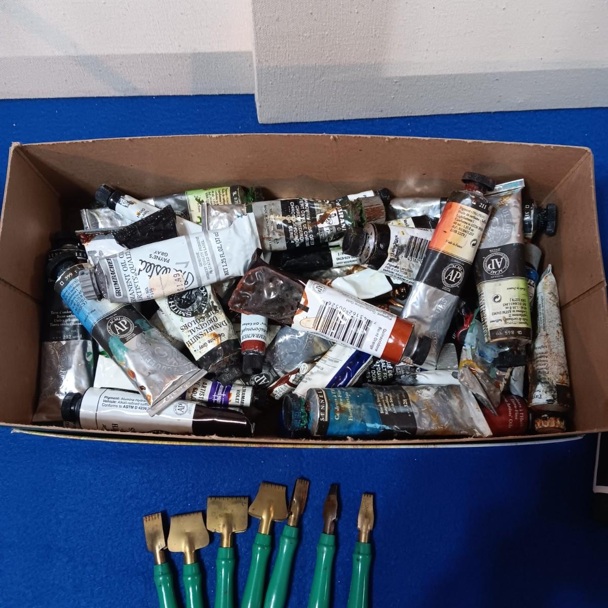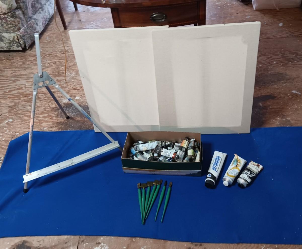 ACRYLIC PAINTS. 2 CANVASES, TABLE TOP FOLDING EASEL & ARTISTS TOOLS