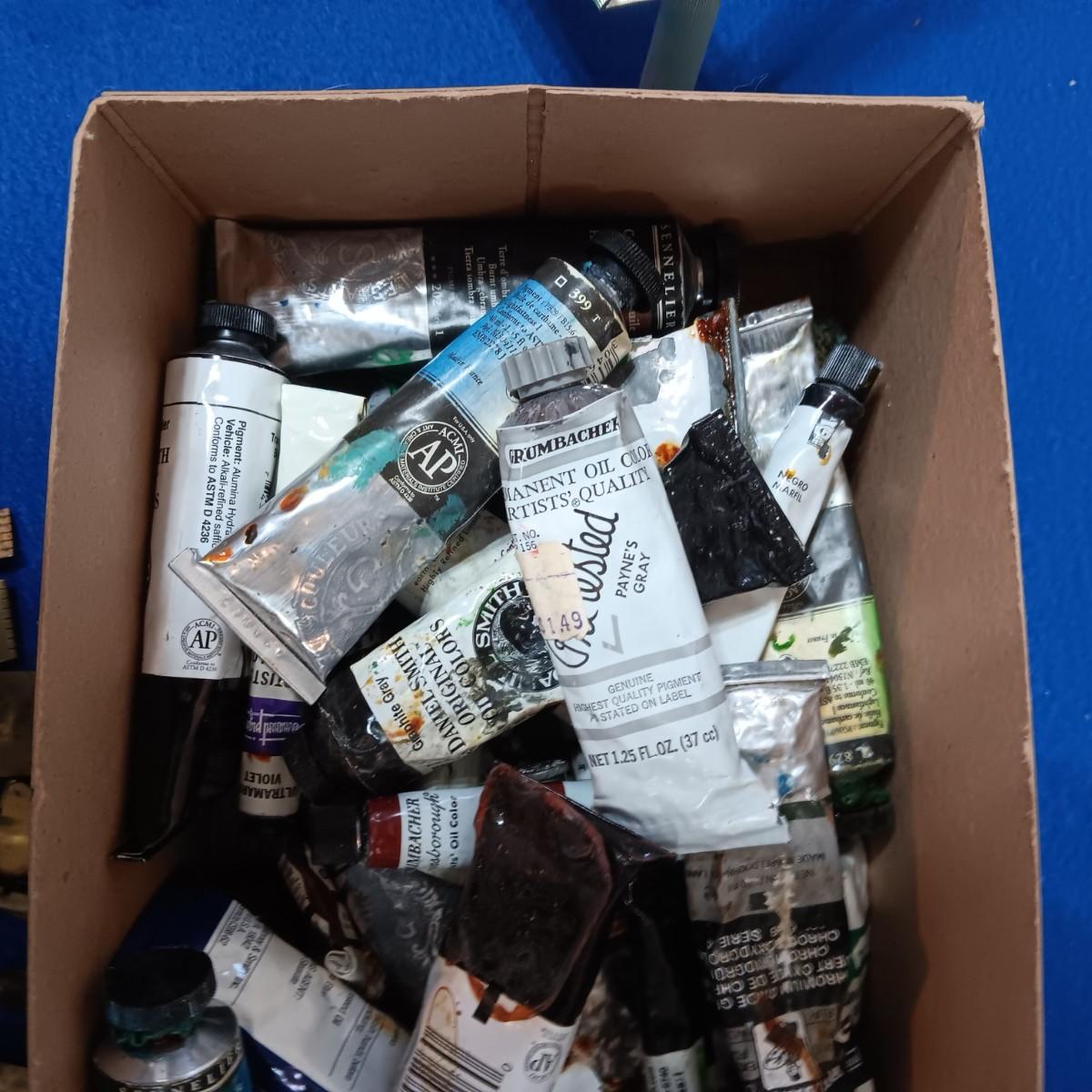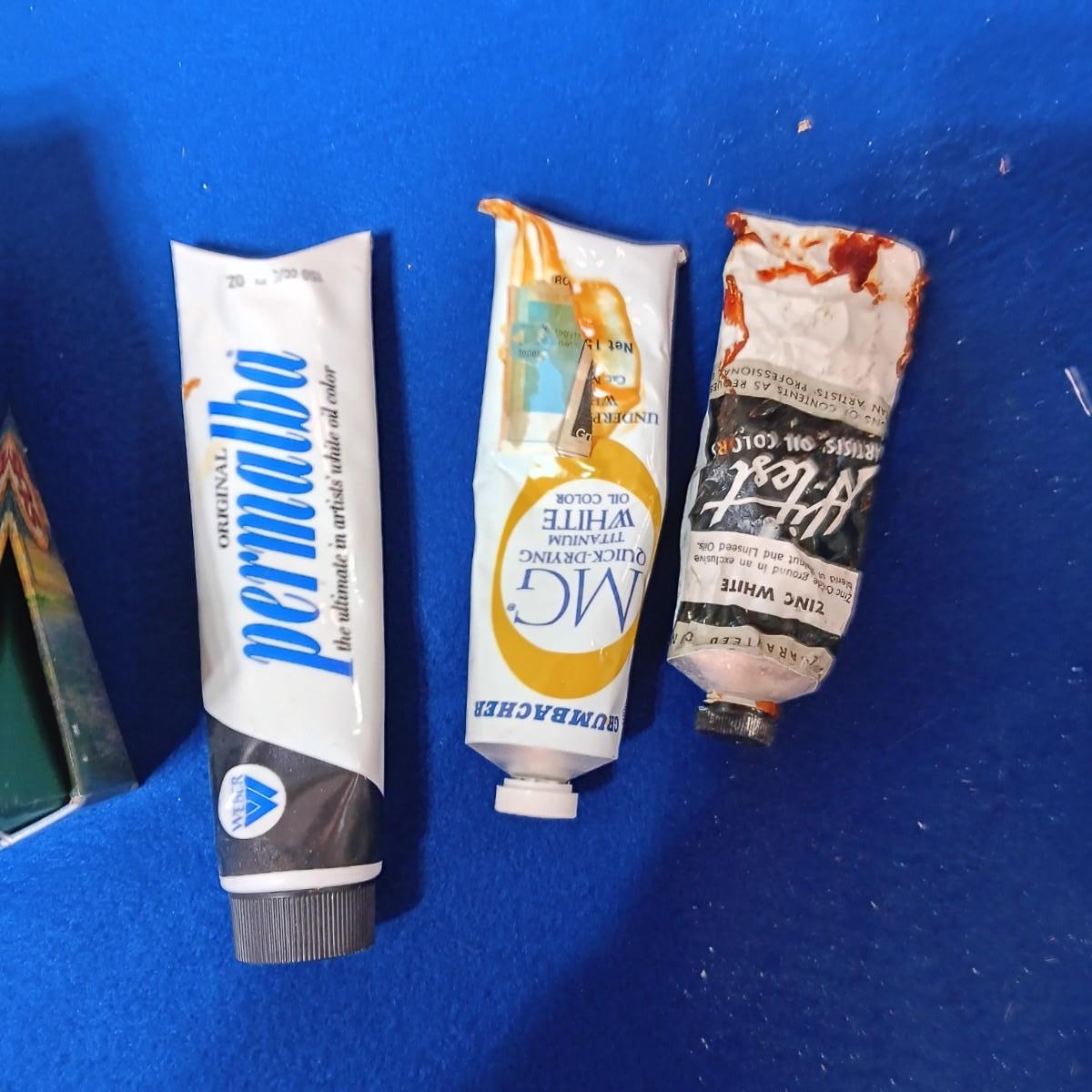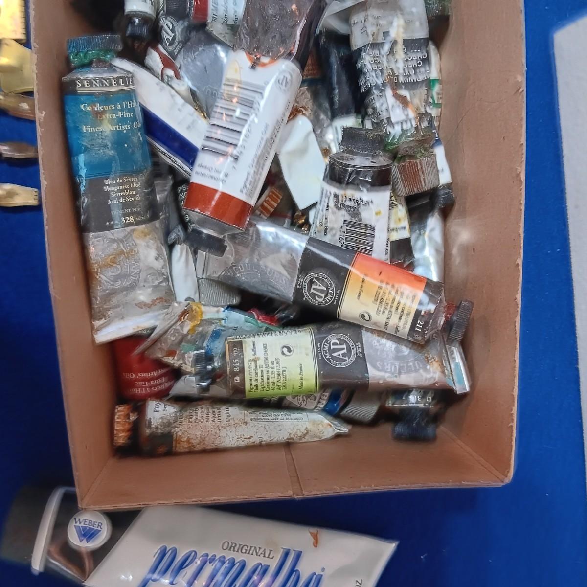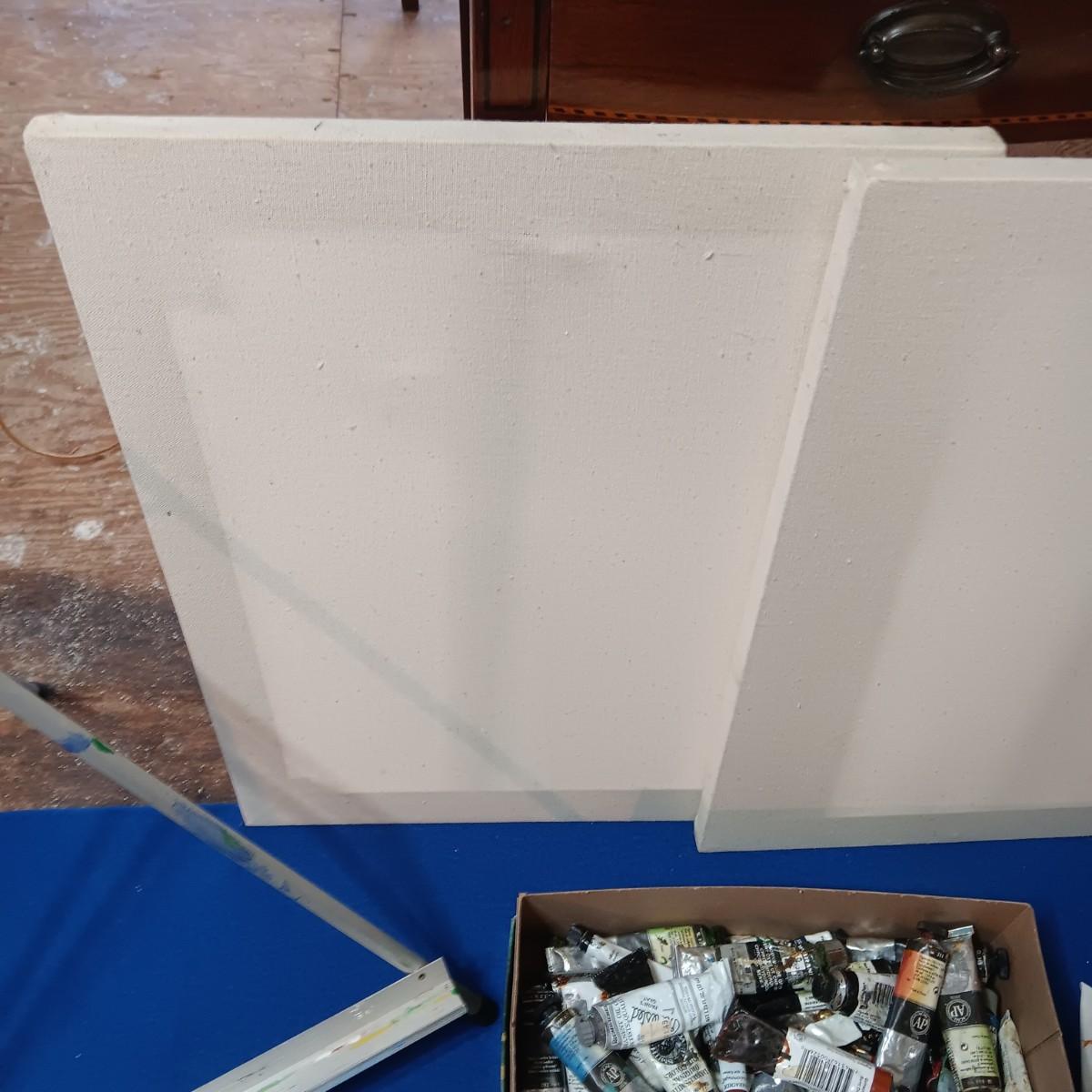 ACRYLIC PAINTS. 2 CANVASES, TABLE TOP FOLDING EASEL & ARTISTS TOOLS