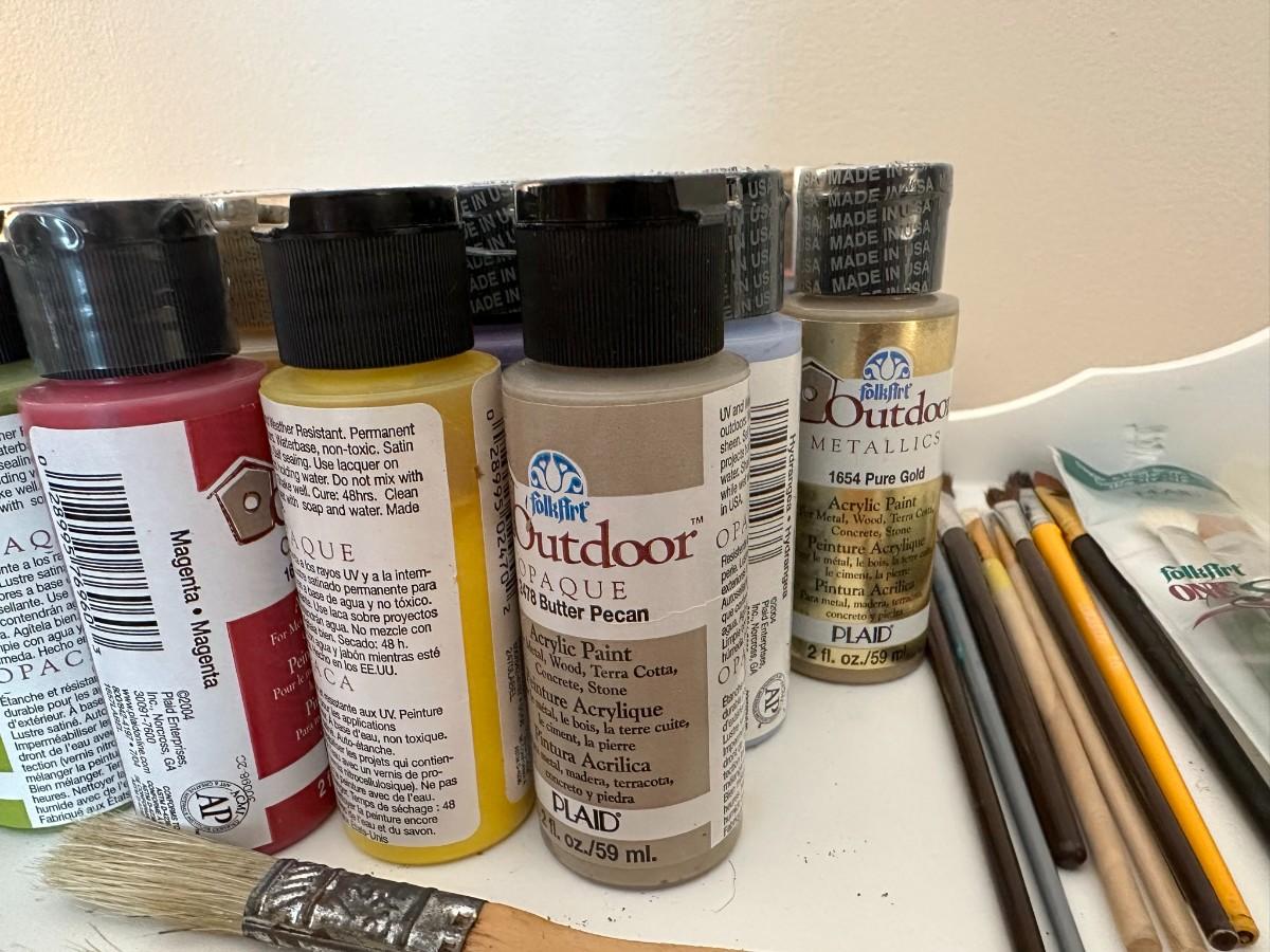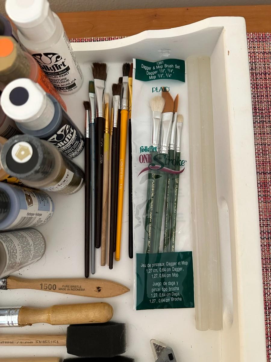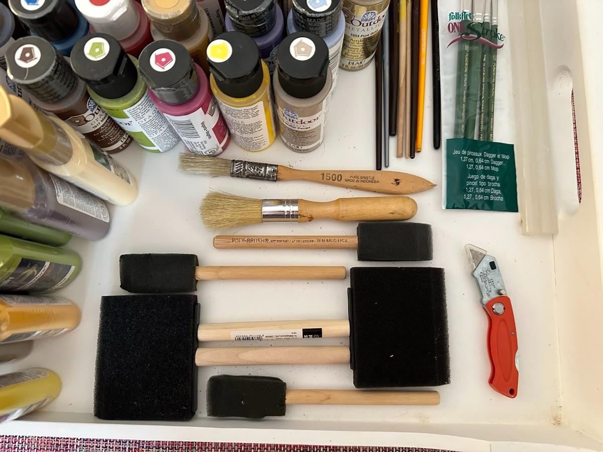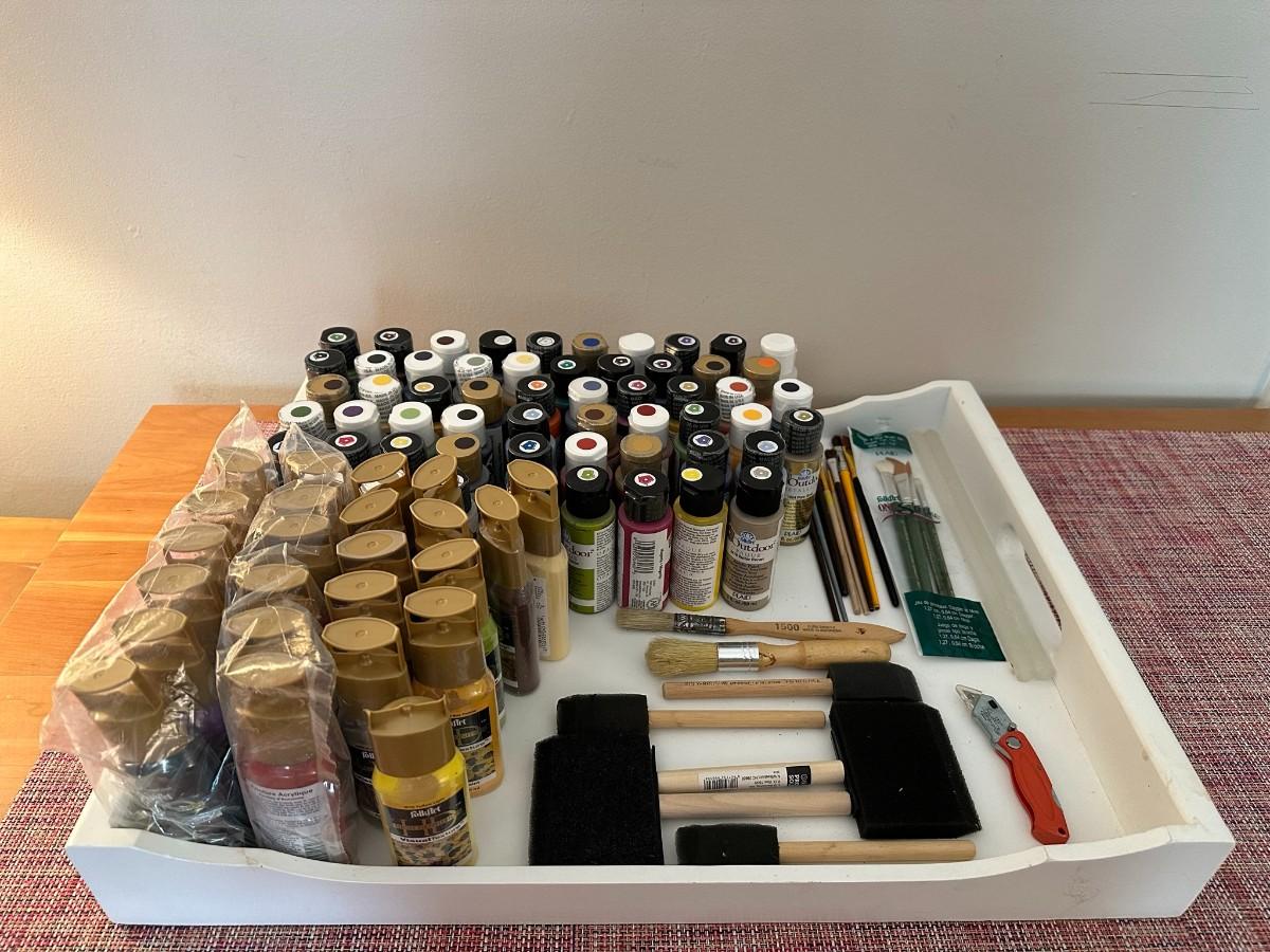 Asst 82 assorted paints, paintbrushes, sponges, box cutter, glue stick & white tray.