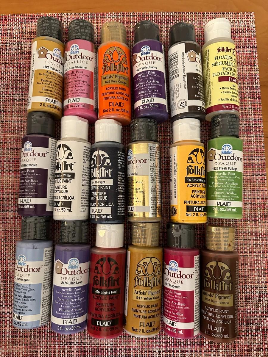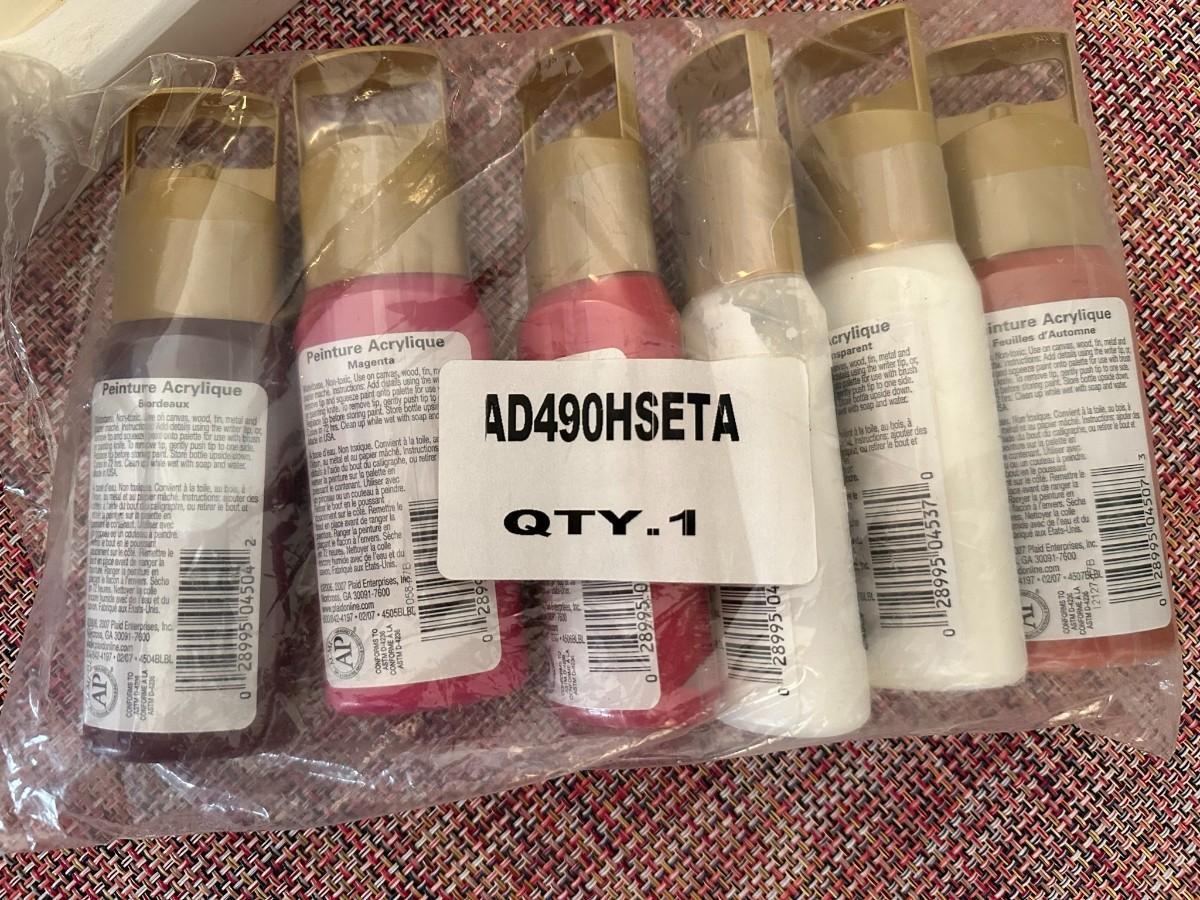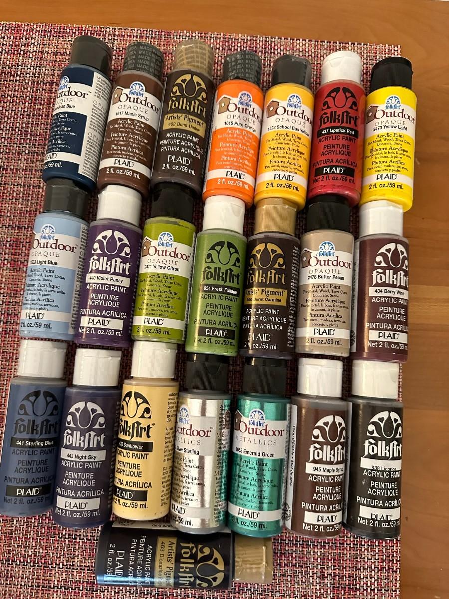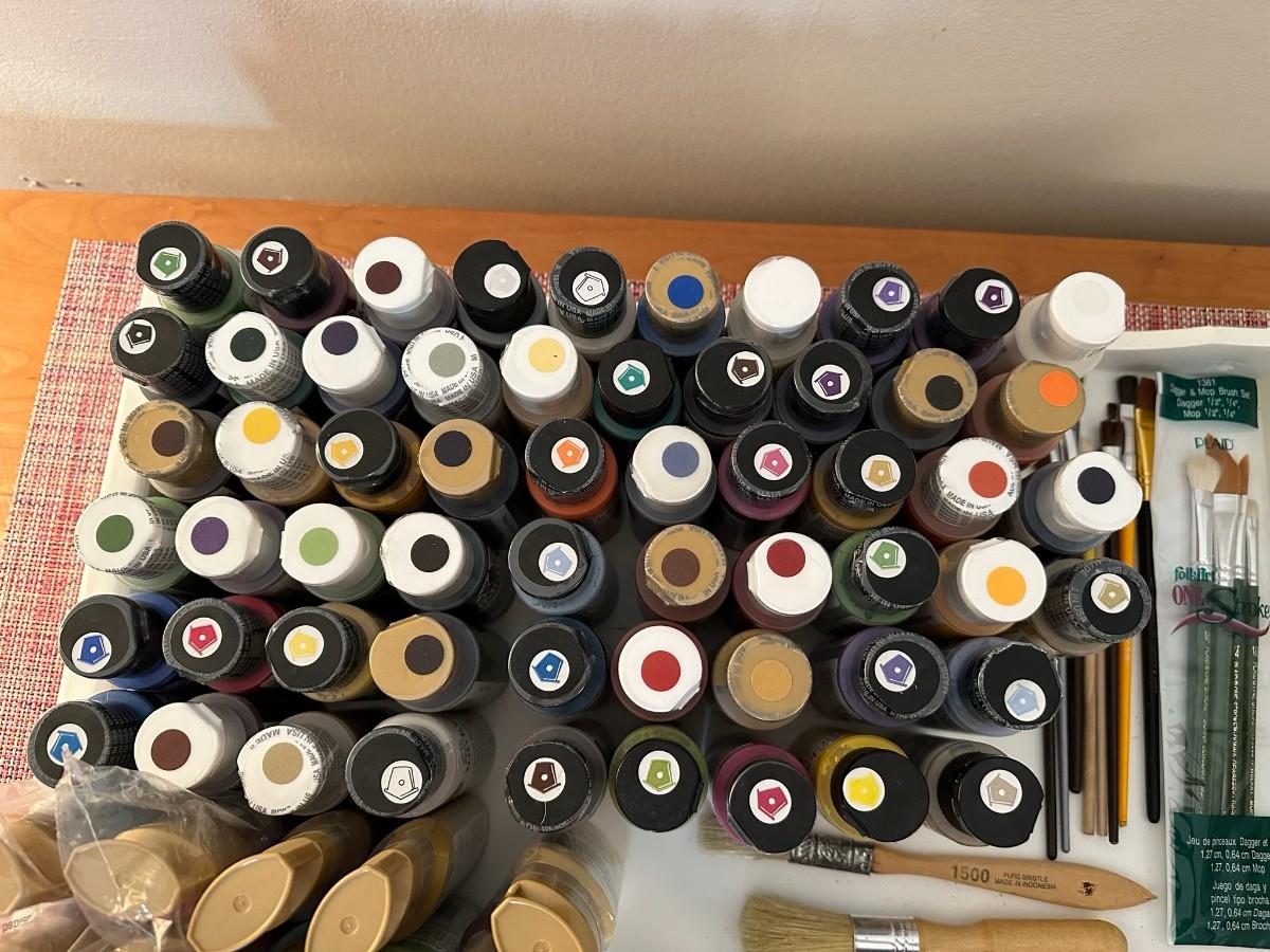 Asst 82 assorted paints, paintbrushes, sponges, box cutter, glue stick & white tray.